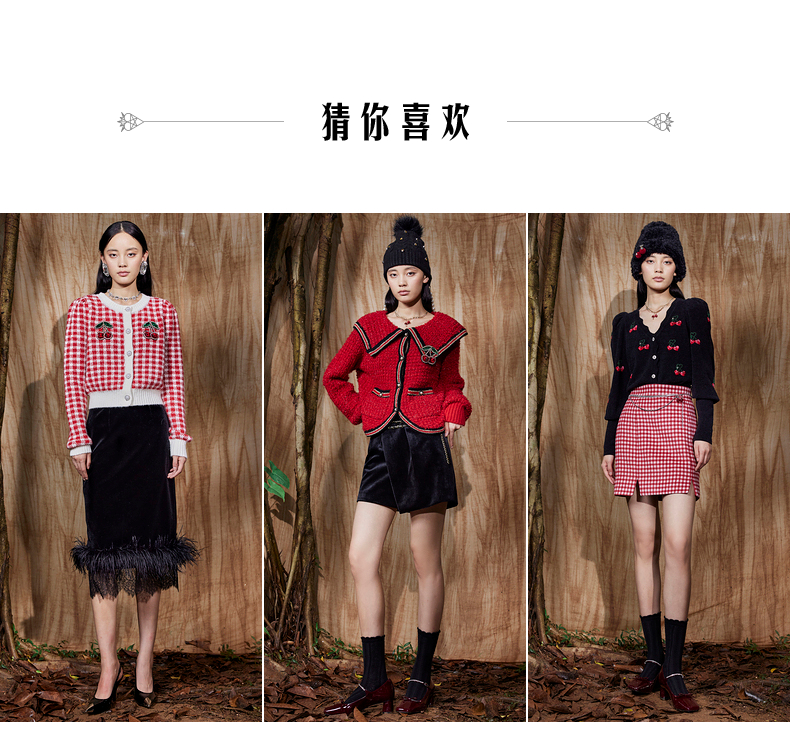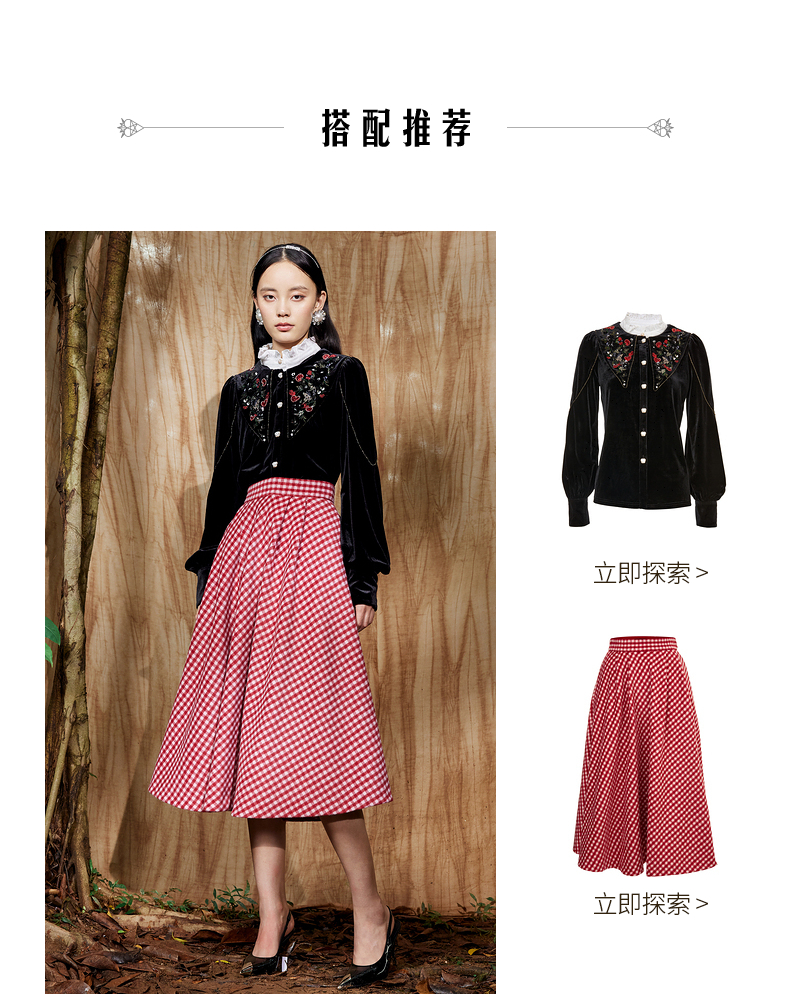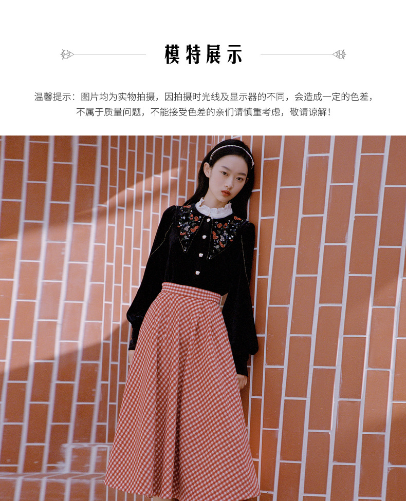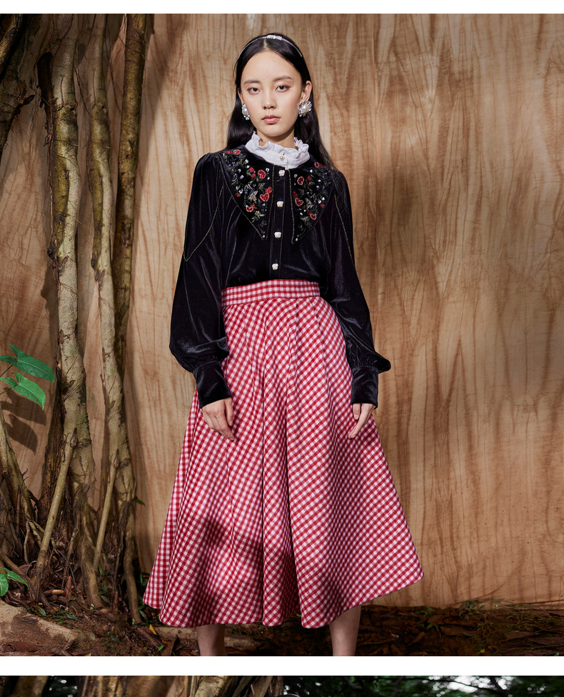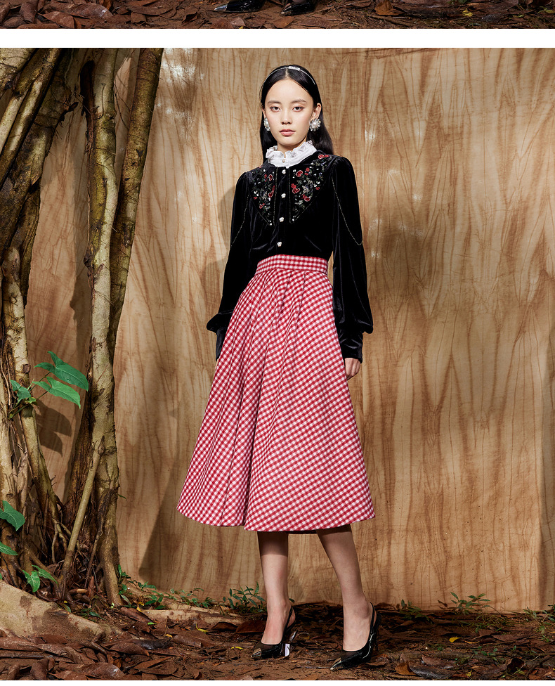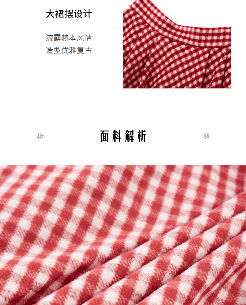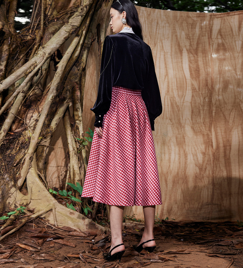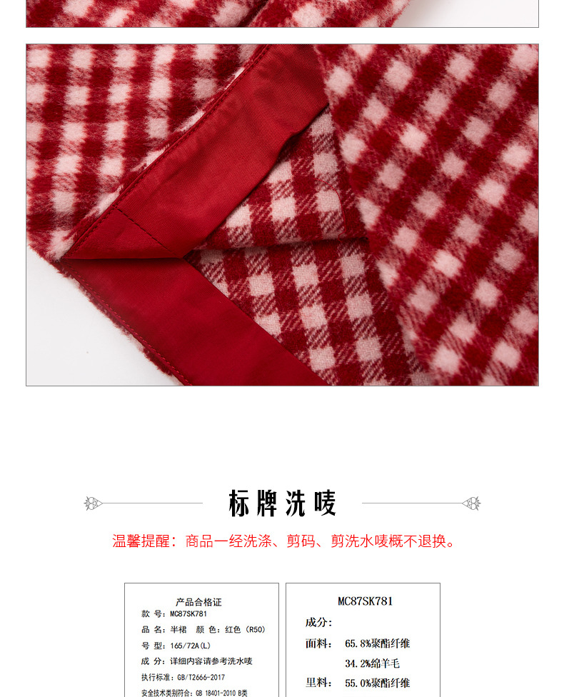 MAXRIENY复古红白格纹长裙秋冬法式高腰A字裙大摆裙春节新年穿搭(货号:MC87SK781)