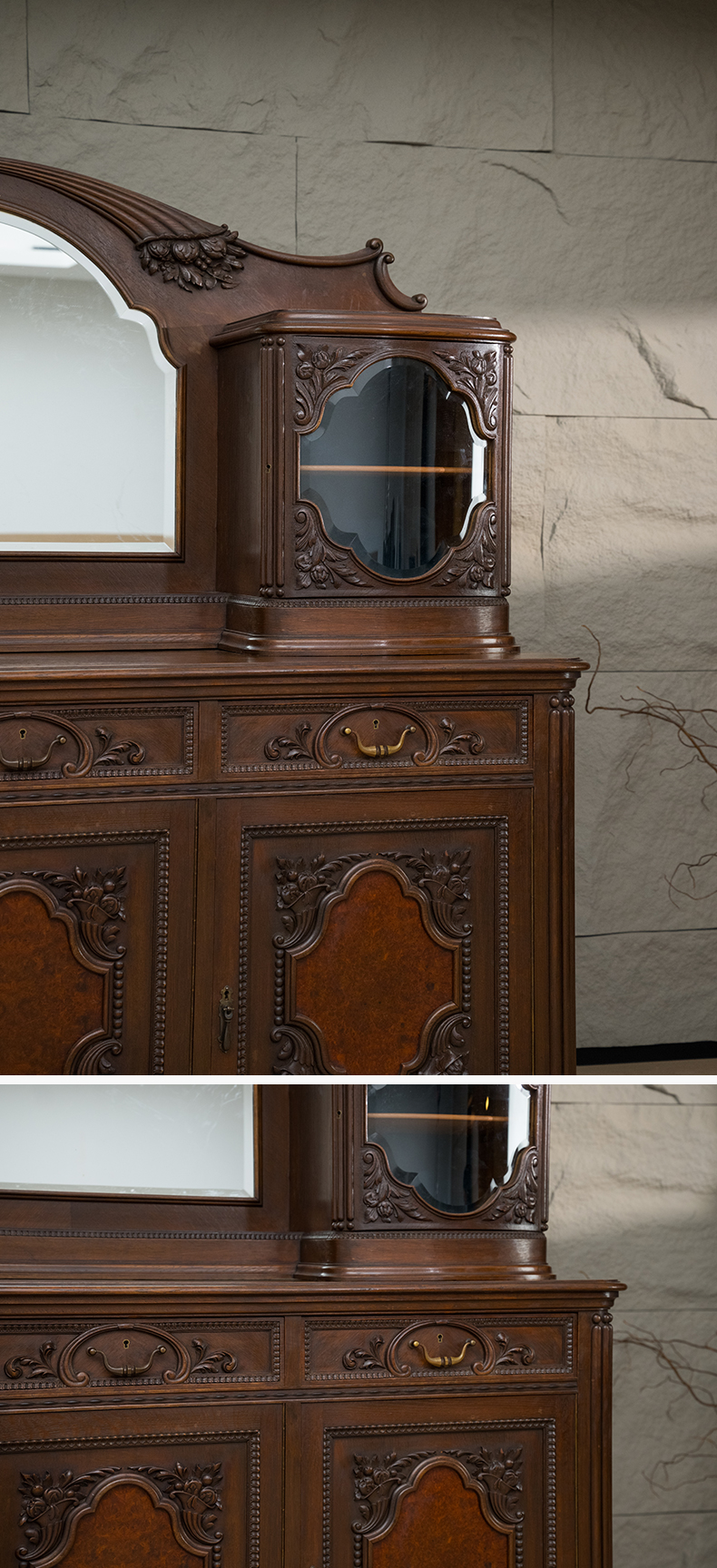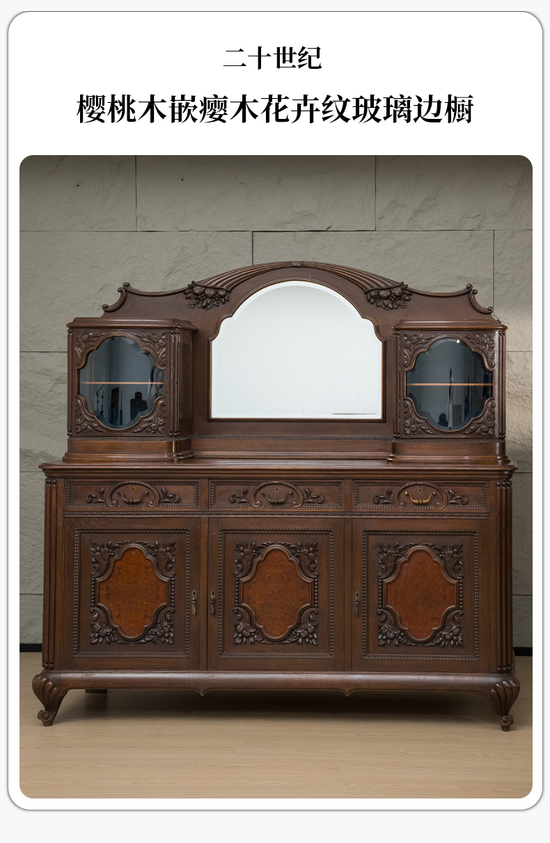 二十世纪 樱桃木嵌瘿木花卉纹玻璃边橱
