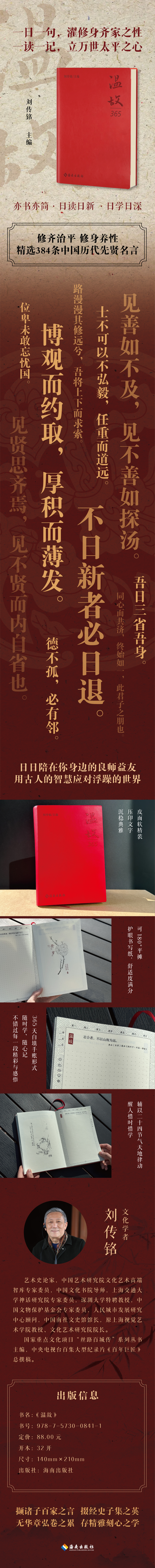 《温故》亦书亦简,以笔记本册示人。撷诸子百家之言,掇经史子集之英,无华章弘卷之累,存精雅刻心之学。一日一句,濯修身齐家之性;一读一记,立万世太平之心。辅以二十四节气天地律动,能醒人惜时惜学,知敬知畏,岂非案头枕边良伴?且日读日新,日学日深。所谓,无心之学亦可积跬步以至千里,为道日损方能踏微波以越界河。果若此,则善莫大焉,信不美矣!