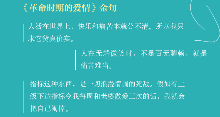 ★《革命时期的爱情》是一本关于性爱的书。性爱受到了自身力量的推动,但自发地做一件事在有的时候是不许可的,这就使事情变得常的复杂。故事讲述了在充满狂热与盲目的时期,个体对纯真的爱情、性爱的追求。说:我知道,有很多理智健全、能够辨别善恶的人需要读小说,本书就是为他们而写。