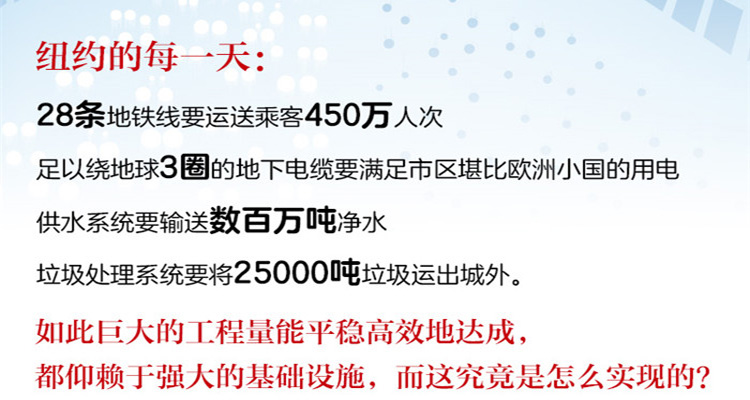 纽约这座繁华都市拥有极为密集的基础设施群。这里的每,二十八条地铁线要运送乘客四五十人次,足以绕地球三圈的地下电缆要满足市区堪比欧洲小国的用电量,供水系统要输送数吨净水,垃圾处理系统要将两五吨垃圾运出城外。