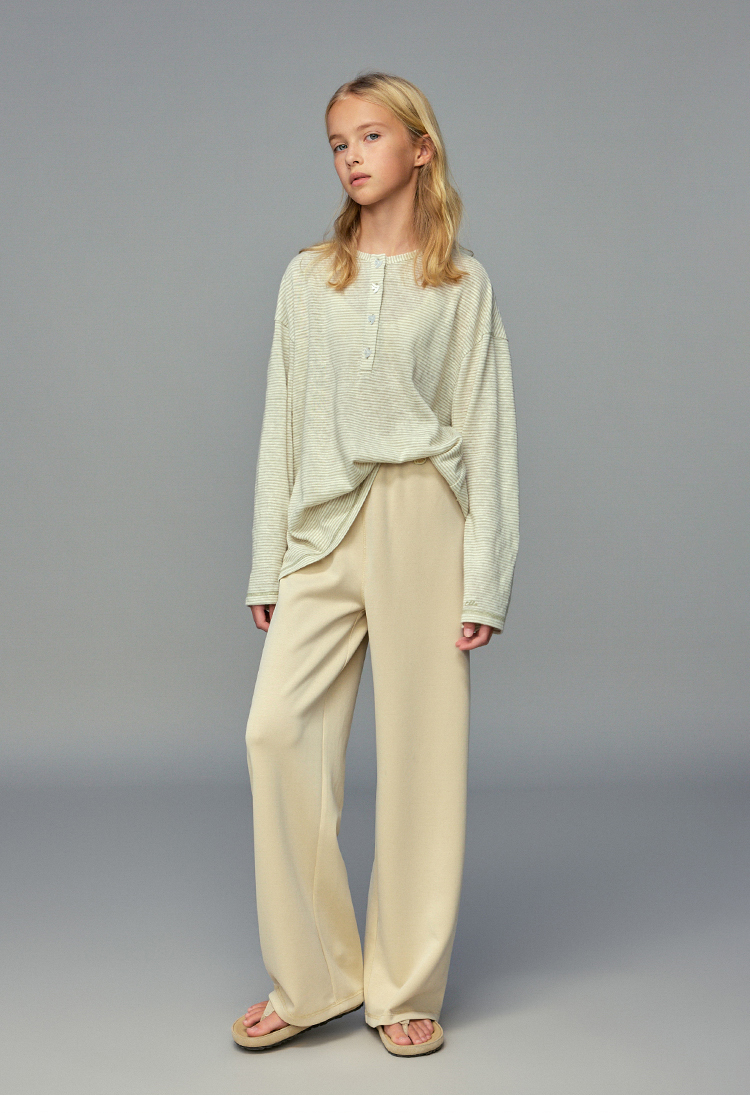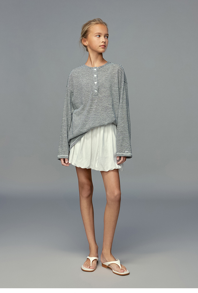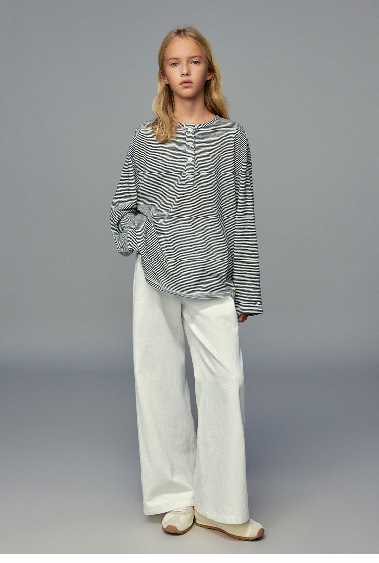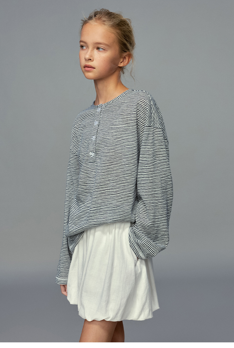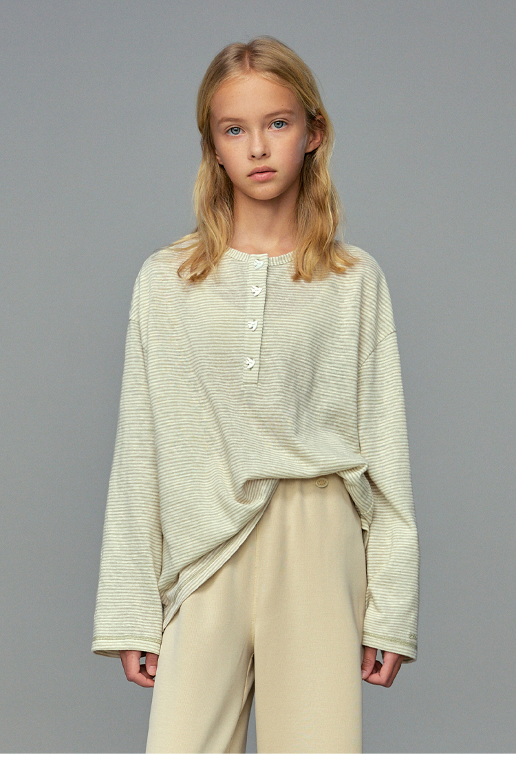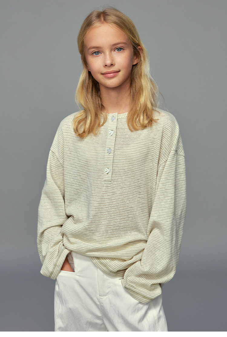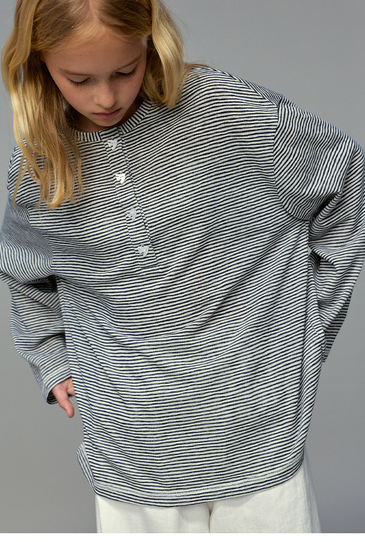 💕春3童装经典撞色条纹亨利领异形小鸟纽扣休闲宽松长袖T恤