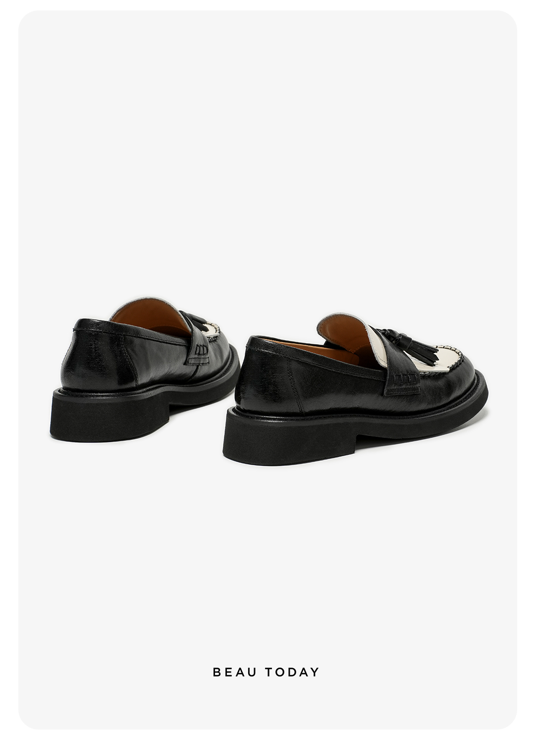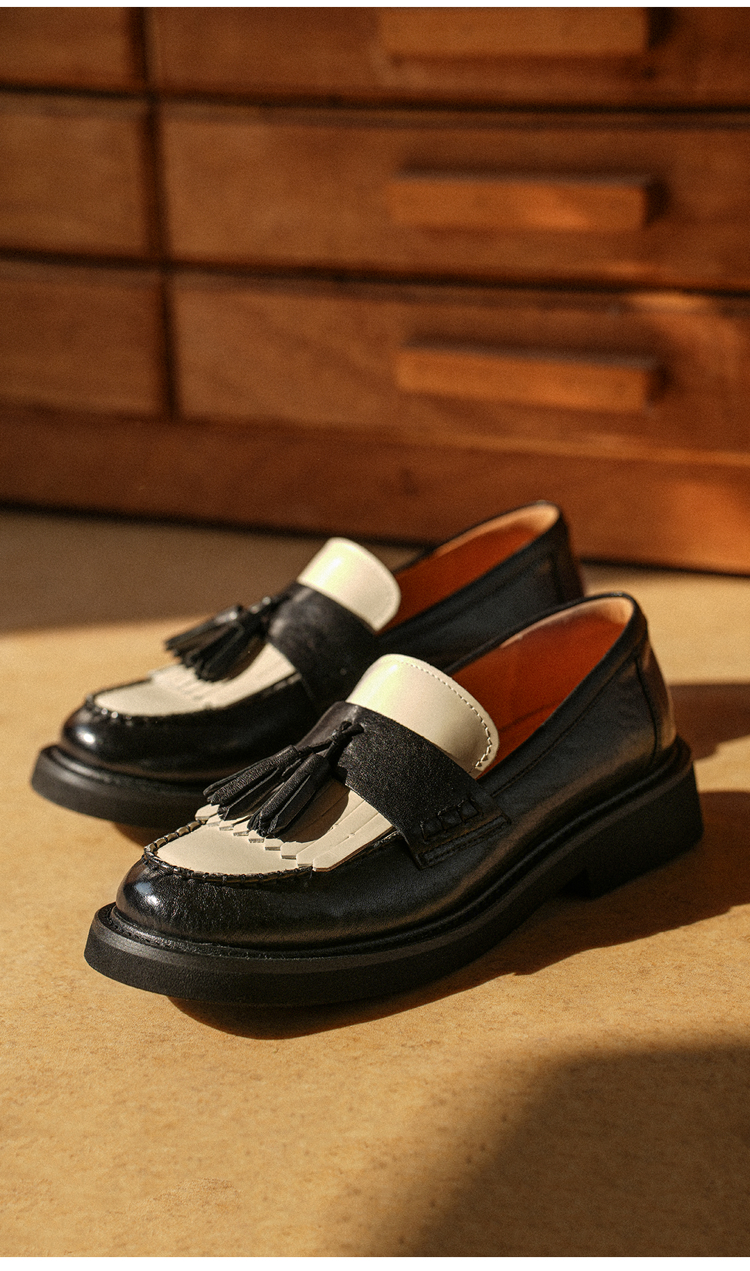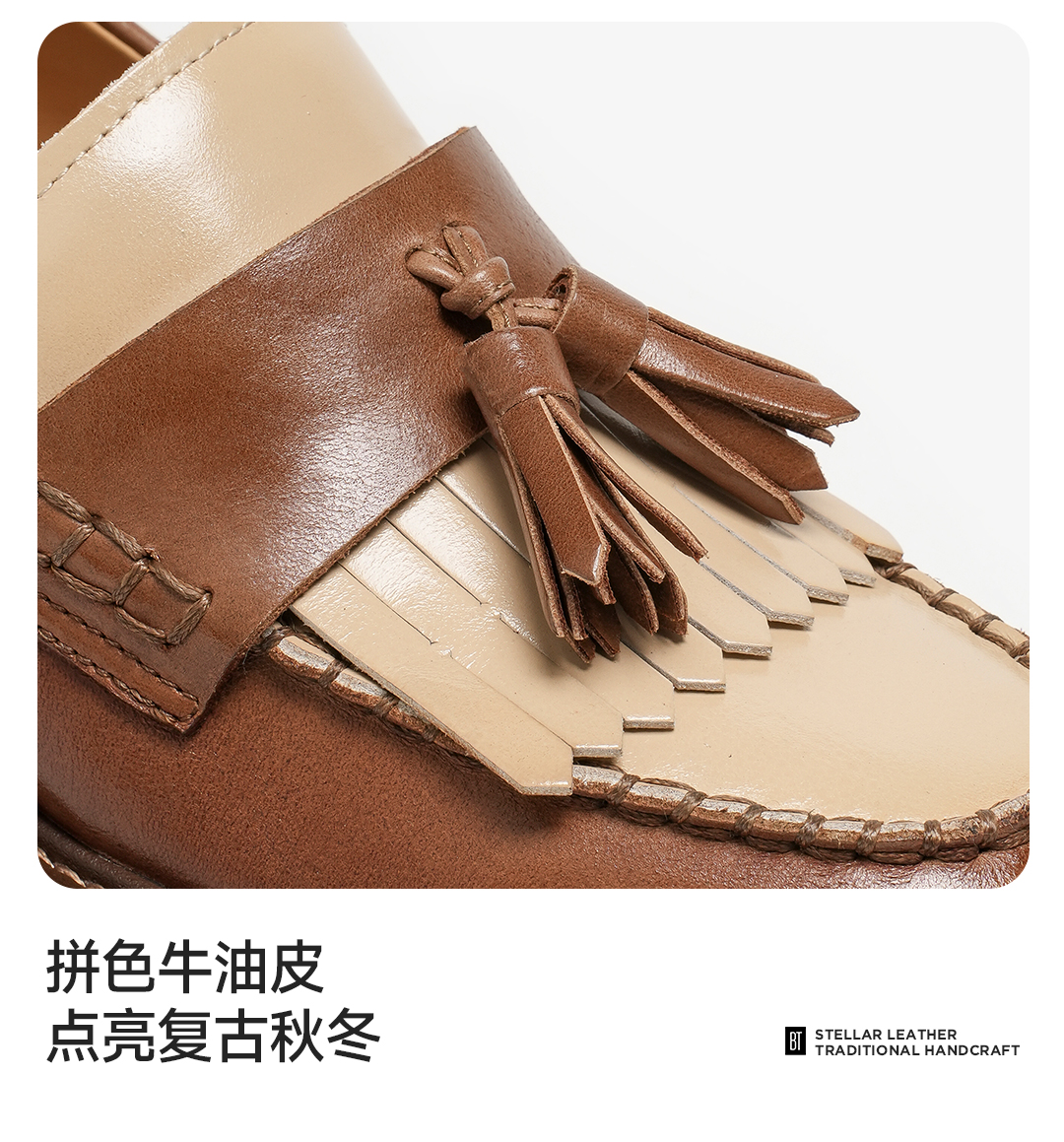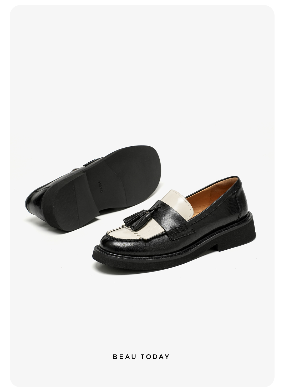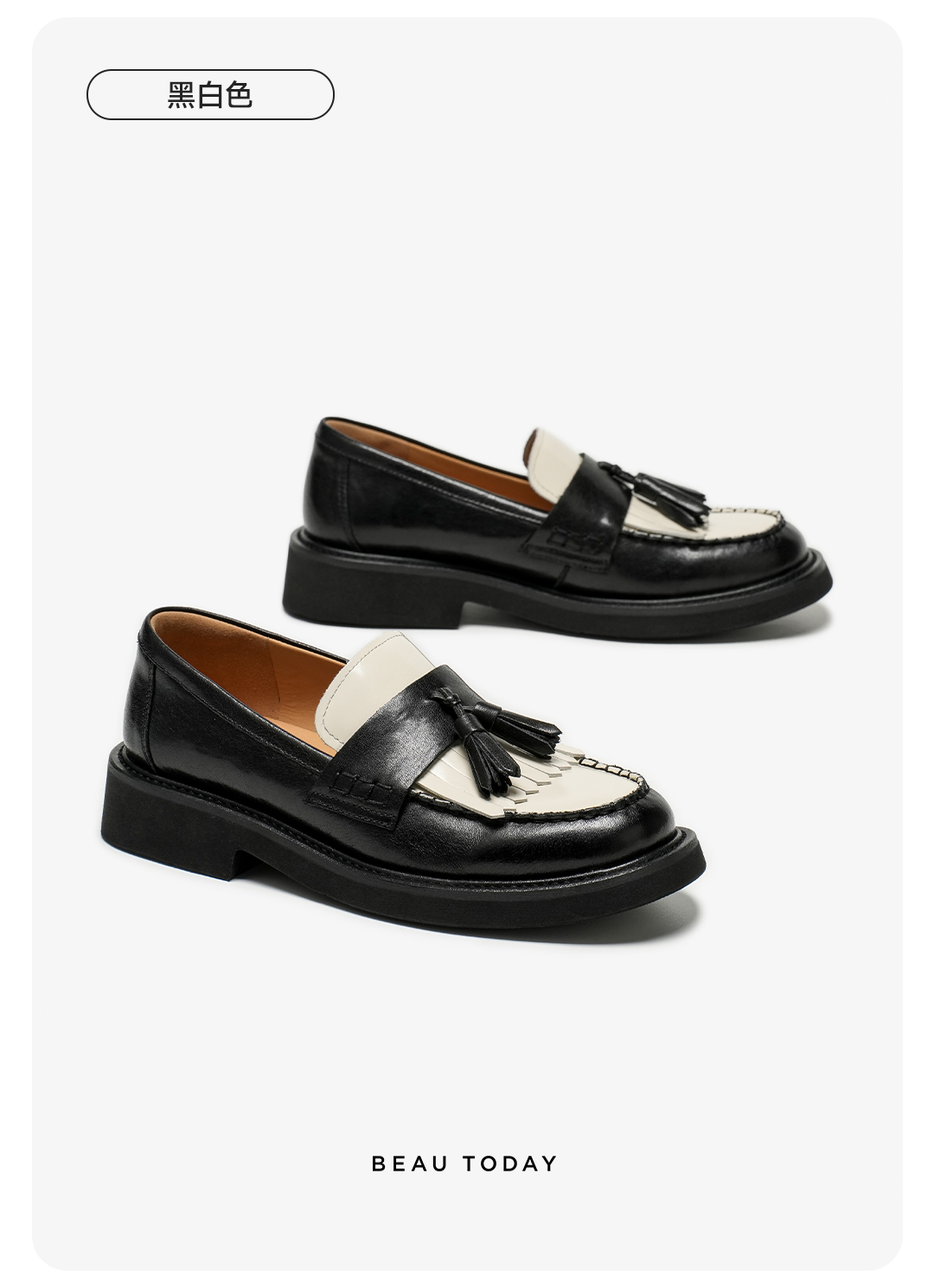 BeauToday 牛油皮拼色流苏吊穗乐福鞋深口单鞋