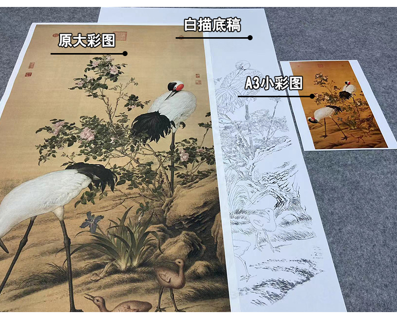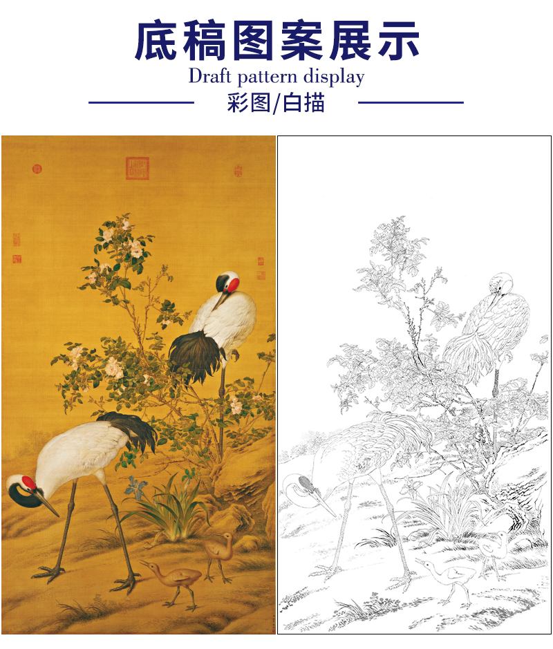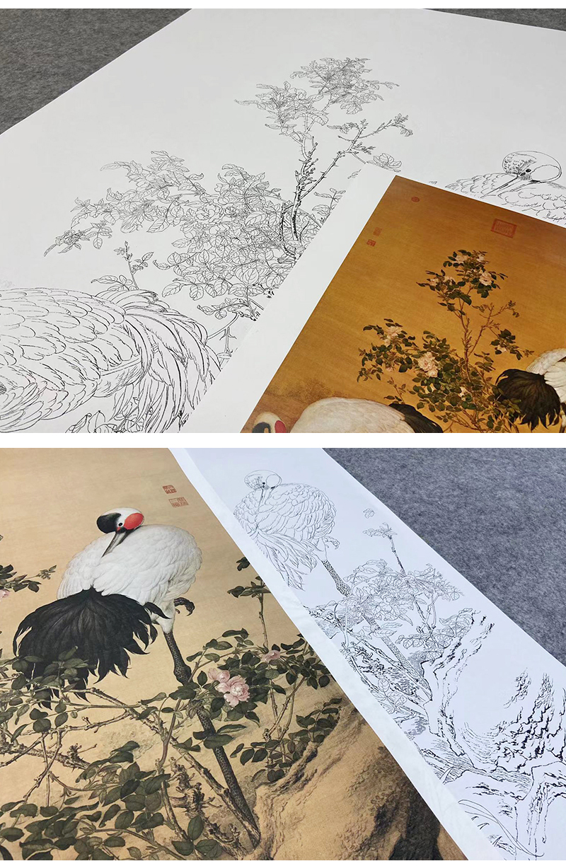 【大彩图】郎世宁工笔画白描底稿《花阴双鹤图》仙鹤临摹勾线高清打印稿LS01