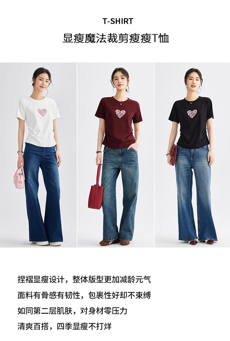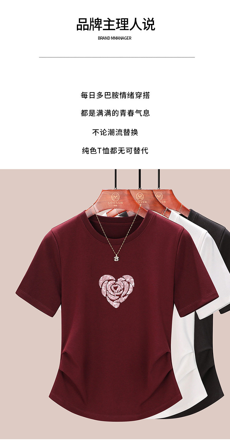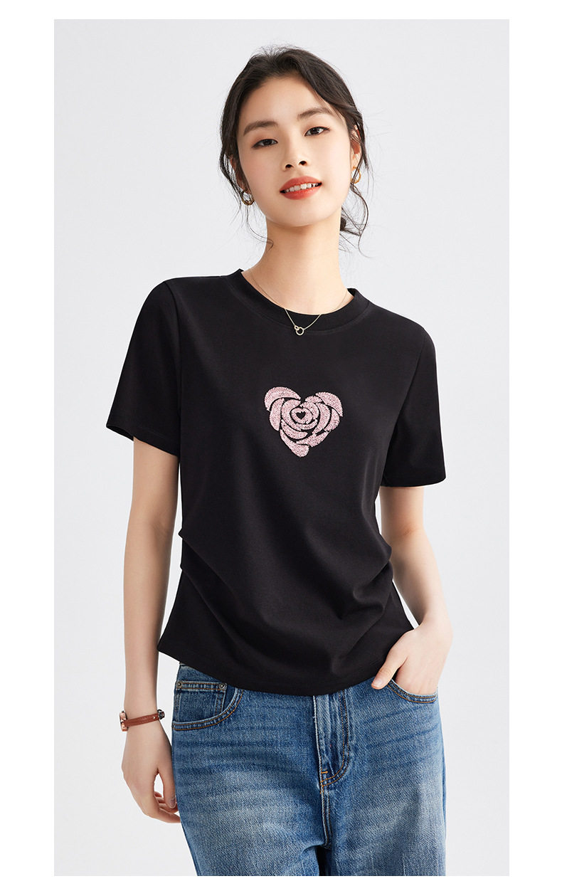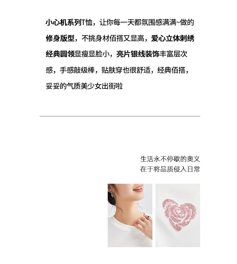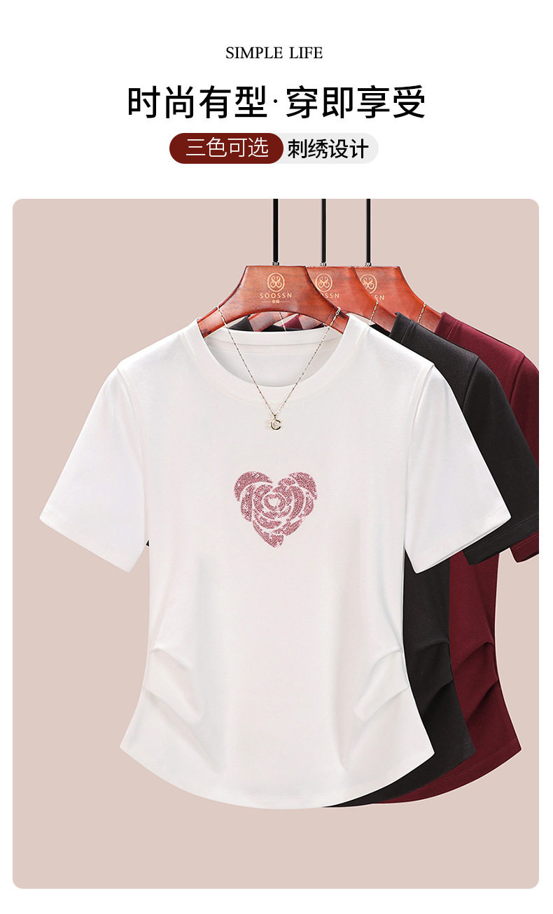 正肩短袖t恤女立体亮片爱心刺绣夏季褶皱收腰上衣女 BY-M679