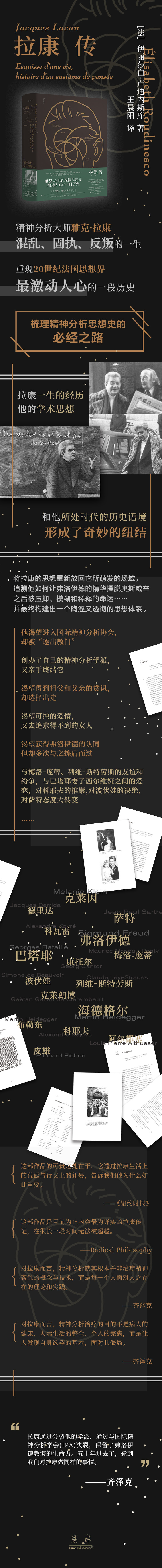 本书详述了法国20世纪的精神分析大师、哲学家、思想家的雅克·拉康混乱、固执而传奇的一生,作者以史为线呈现拉康非正统的、错综复杂的学术理念和思想的形成、发展与影响历程,描绘出法国20世纪最重要的有群知识分子互动和私人生活。
