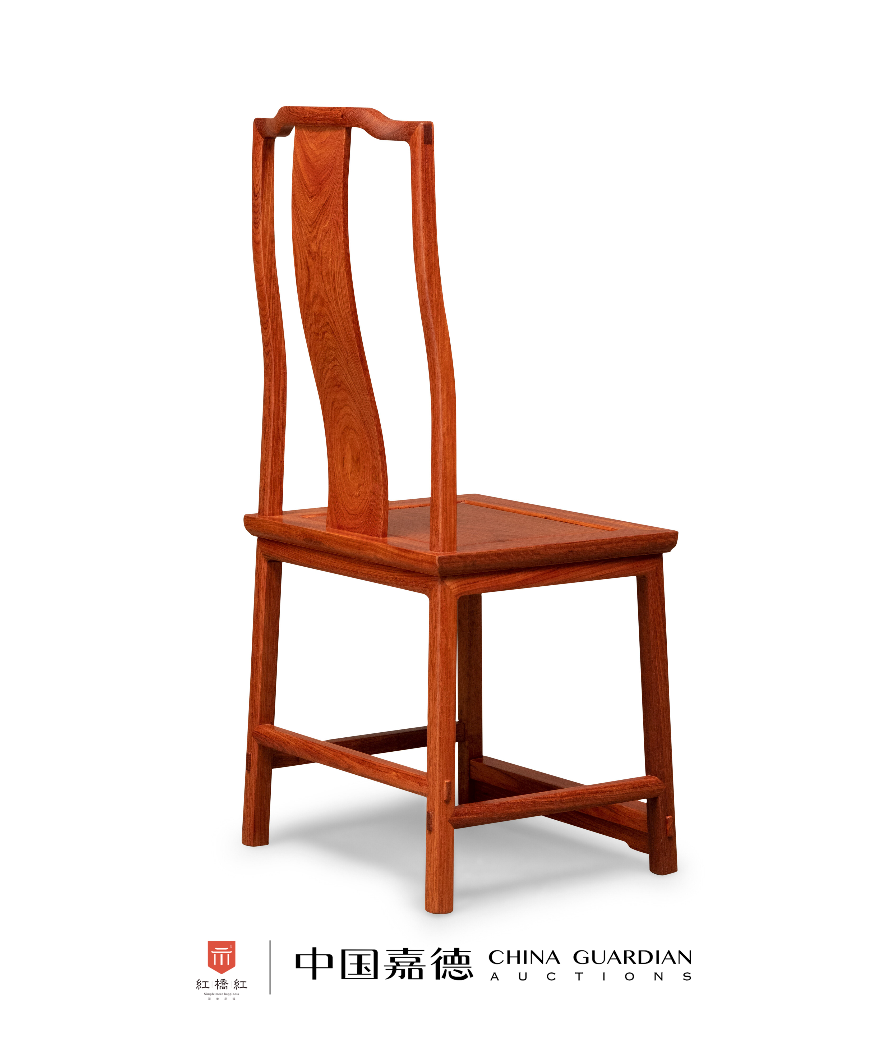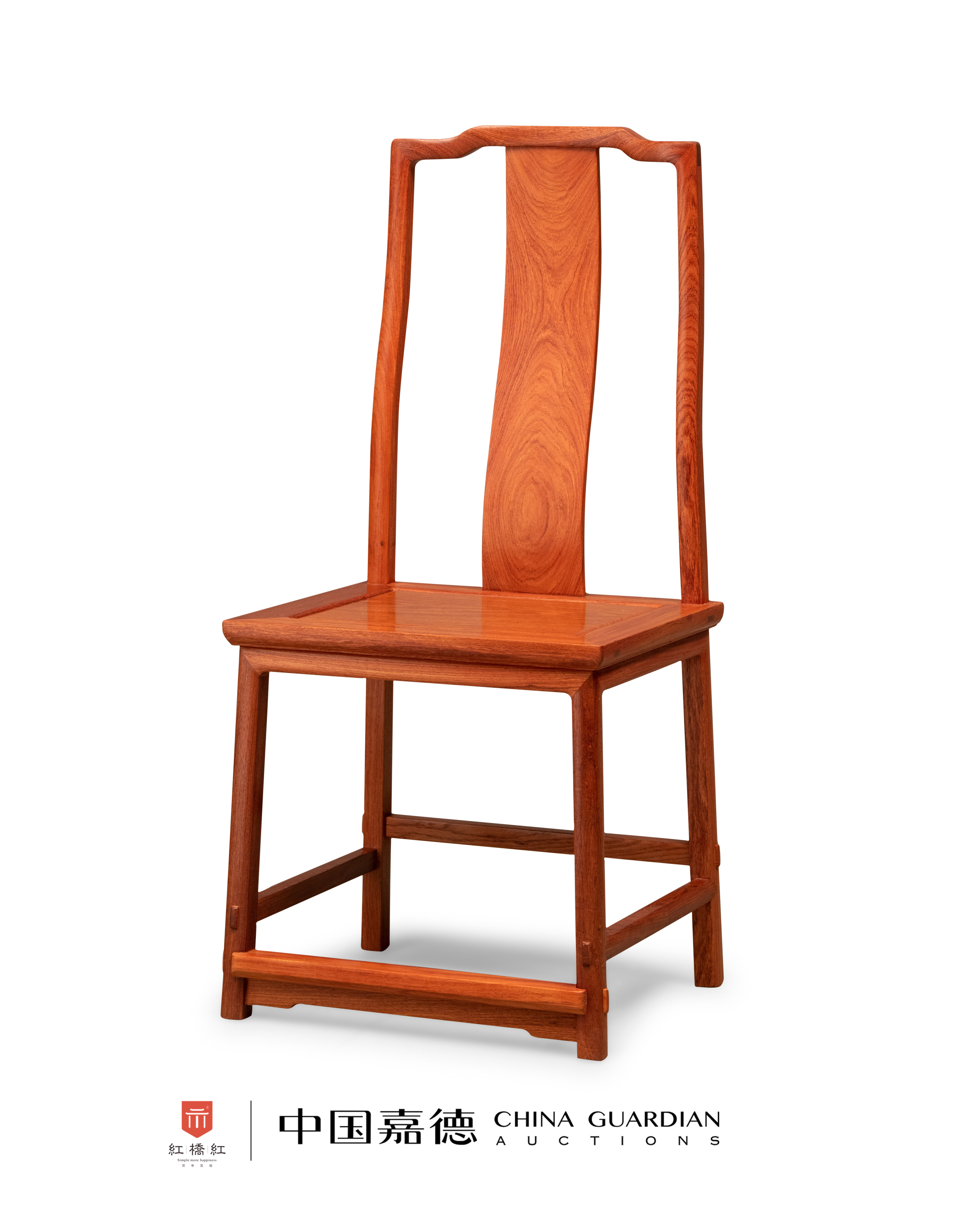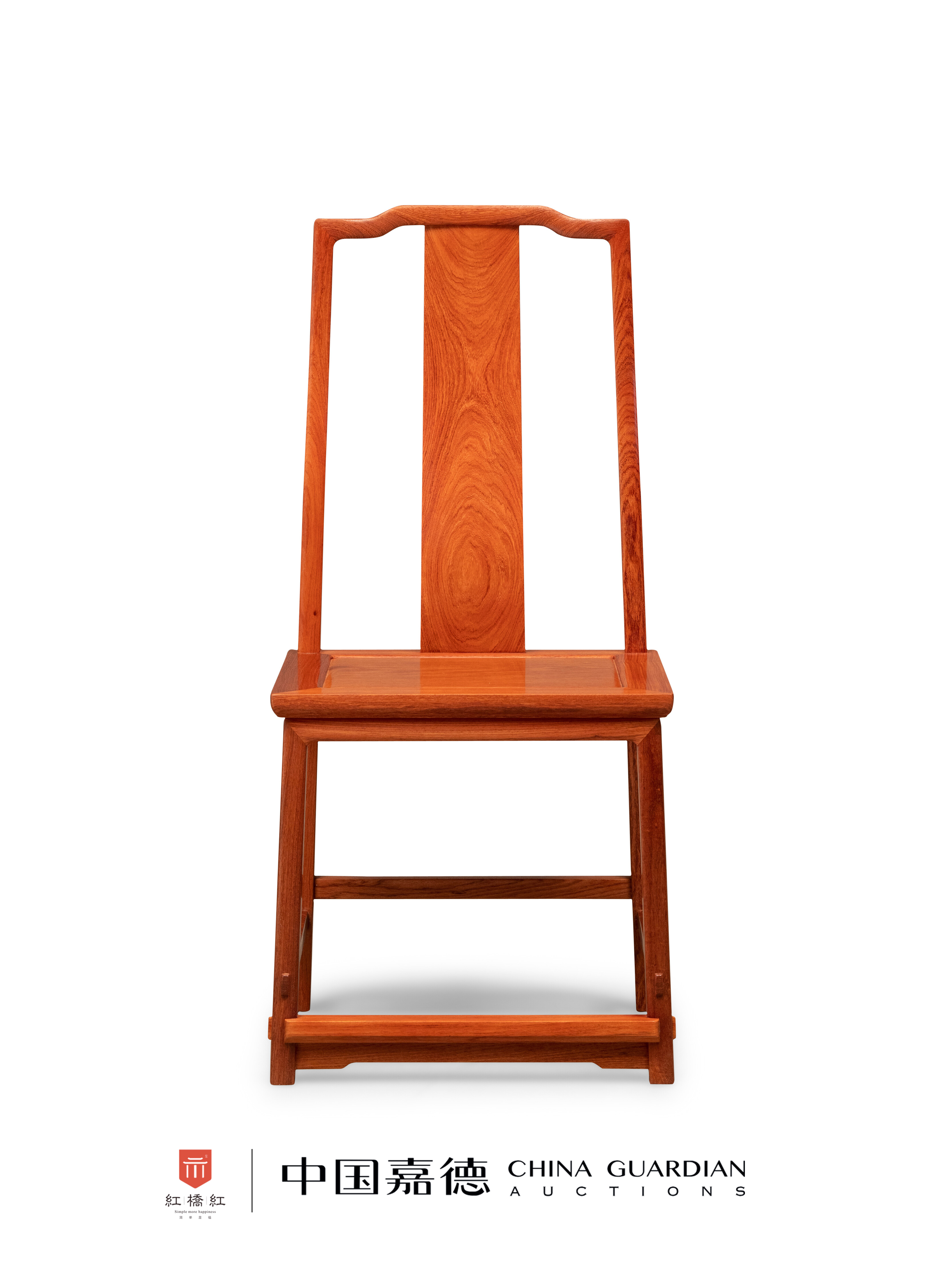 靠背椅缅甸花梨制,纹理天然美观,木纹如同遇到溪石的流水,泛起涟漪,荡漾开来。搭脑造形弯弧美观,中成枕形,三弯靠背板正面、背面的纹理皆流畅美观。边抹冰盘沿,至底压一道利落的窄平线。椅盘以上圆材,以下则为外圆里方,以便与枨子相交。采用凸榫工艺,十分考究。腿间施步步高赶枨,脚踏下安一素牙条加固。