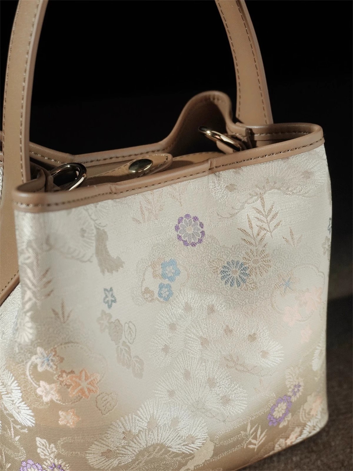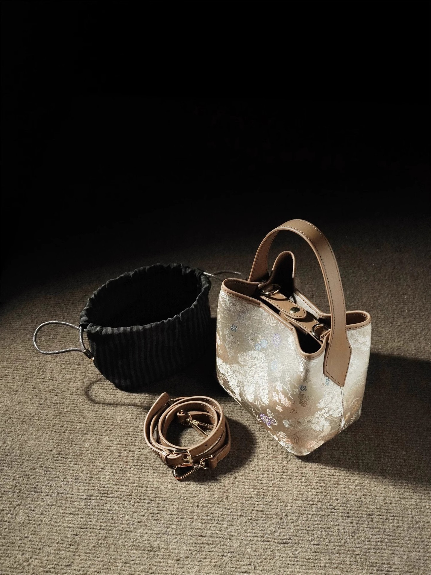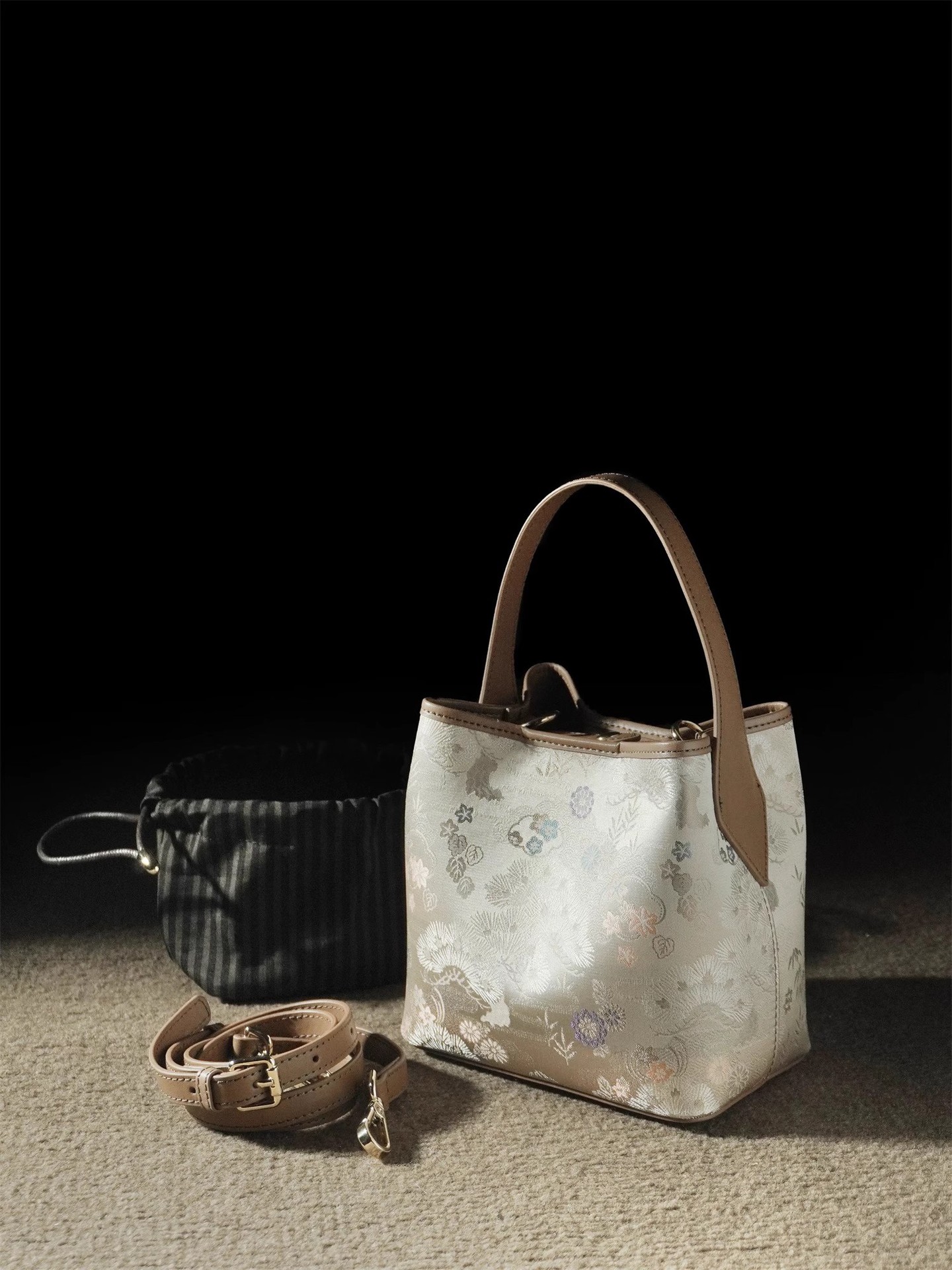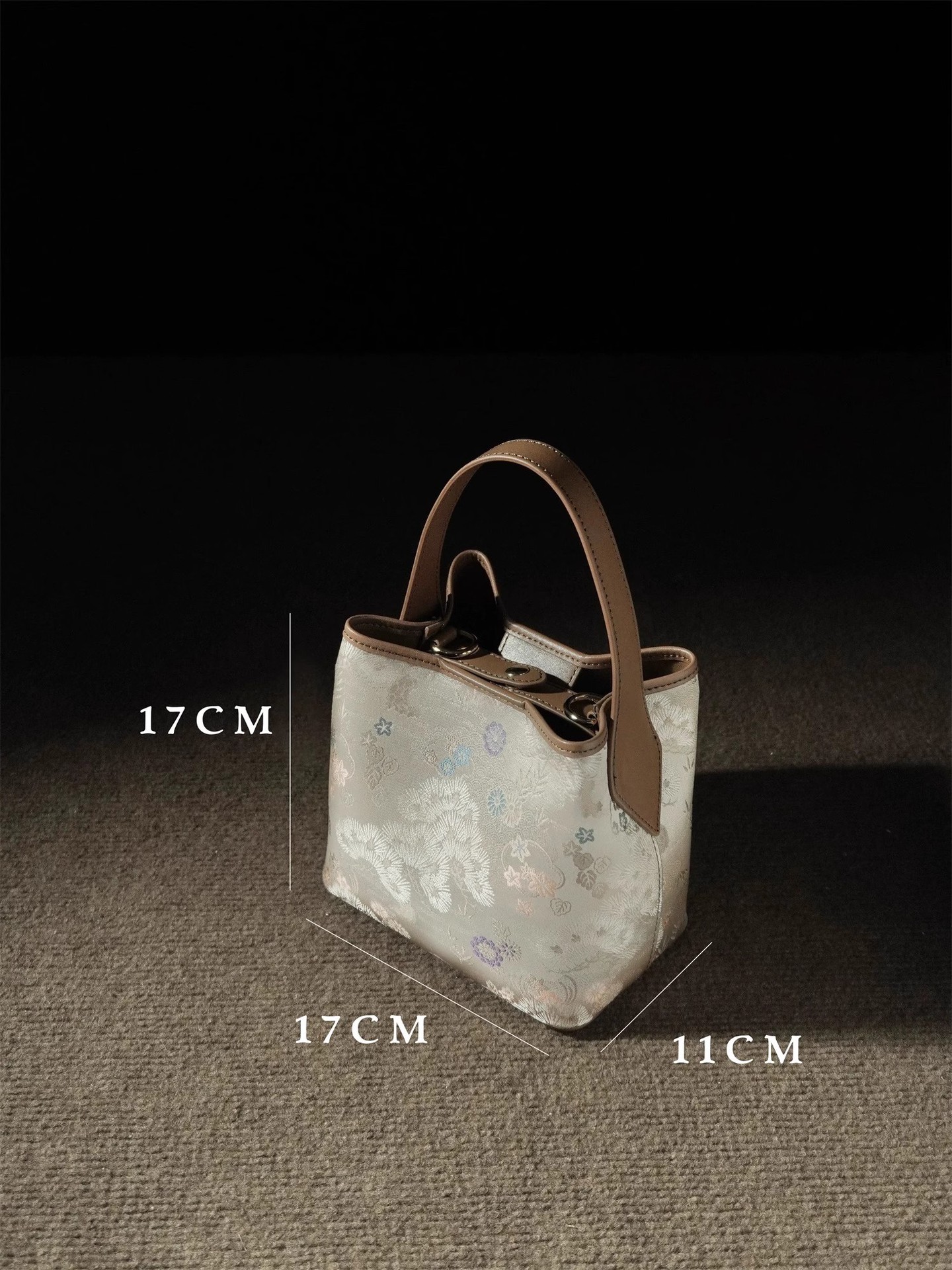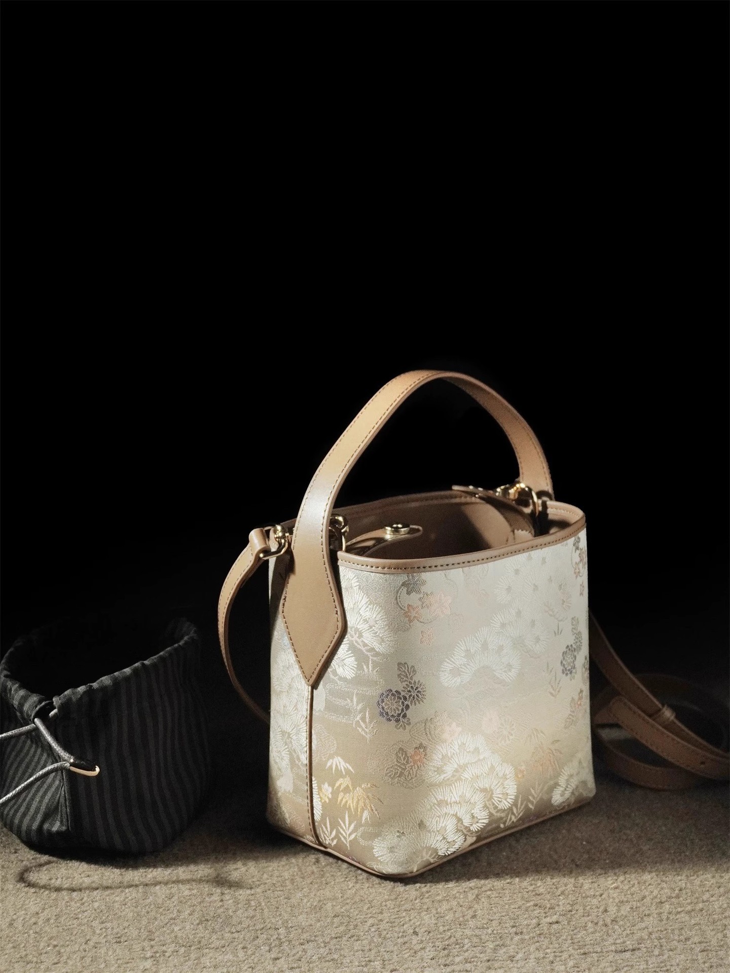 丁摩 新中式新宋锦水桶女包国风四合花紫绿色单肩斜挎牛皮包 5ZF-43