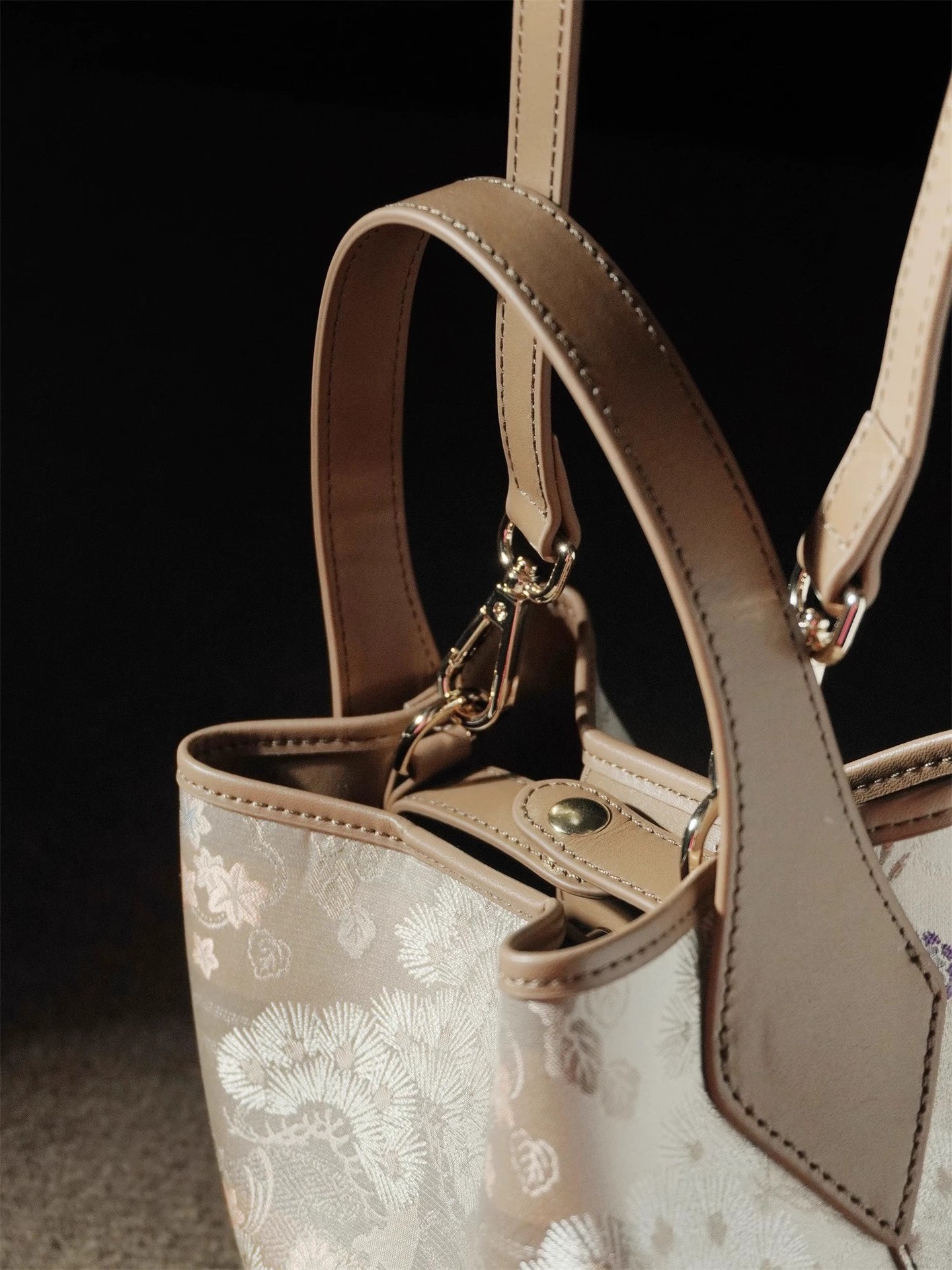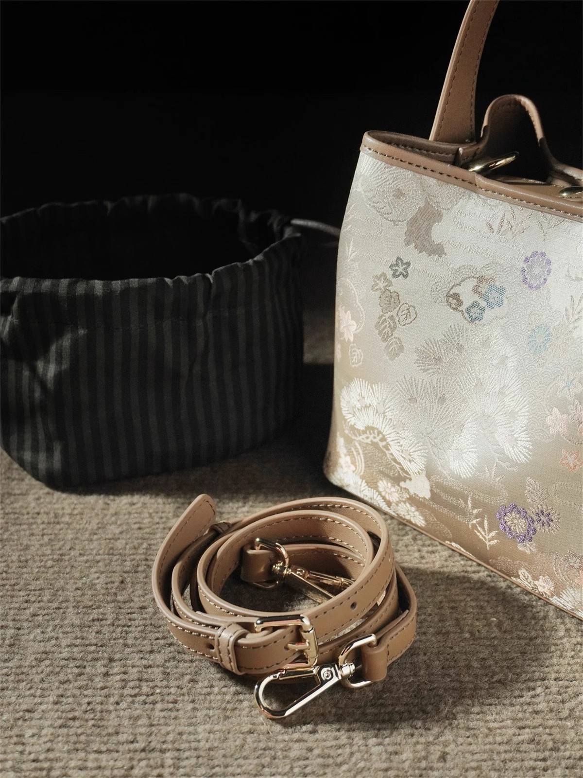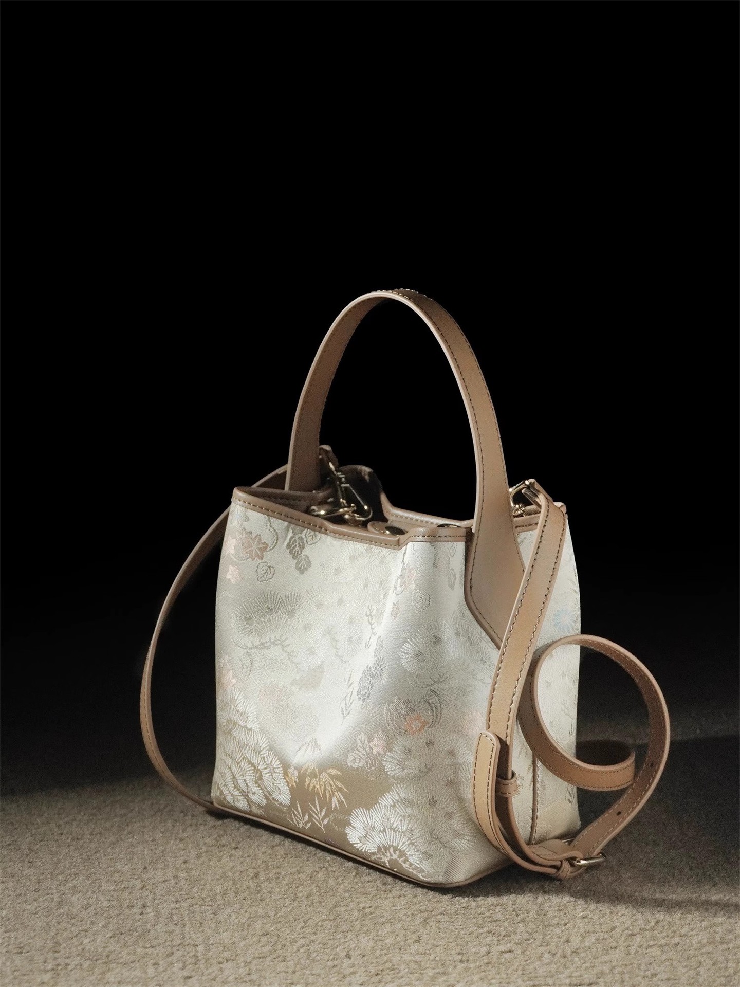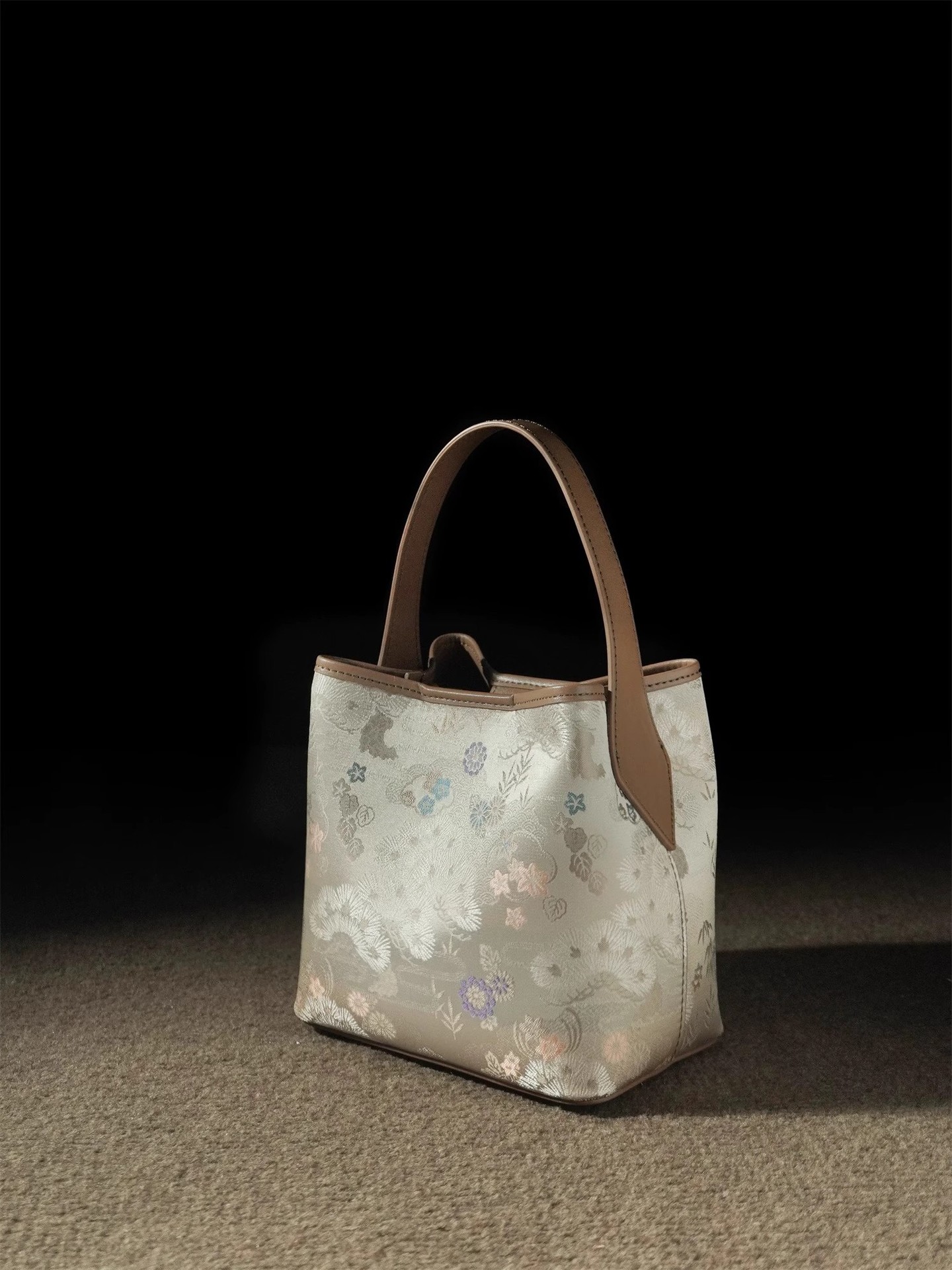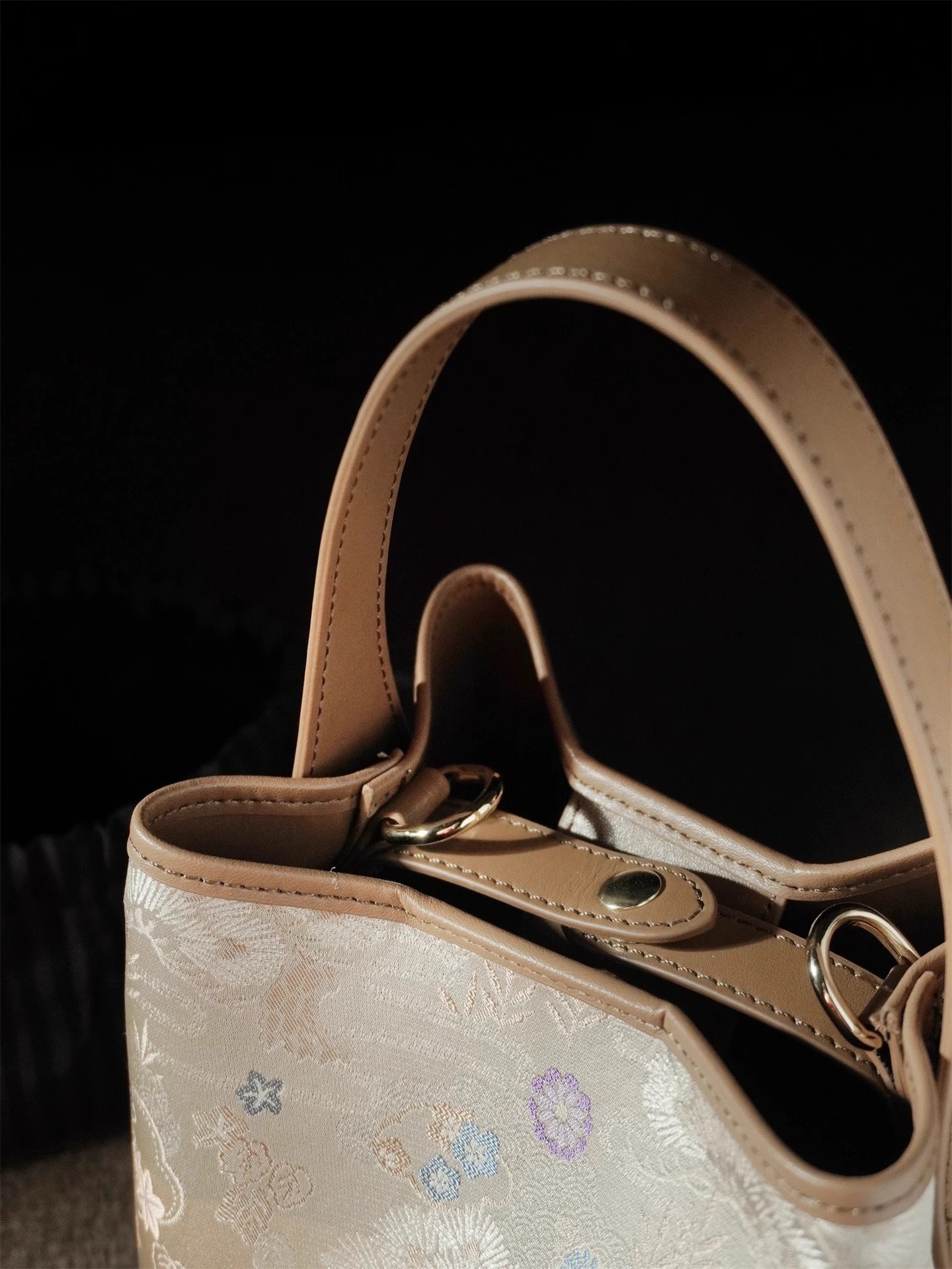 丁摩 新中式新宋锦水桶女包国风四合花紫绿色单肩斜挎牛皮包 5ZF-43