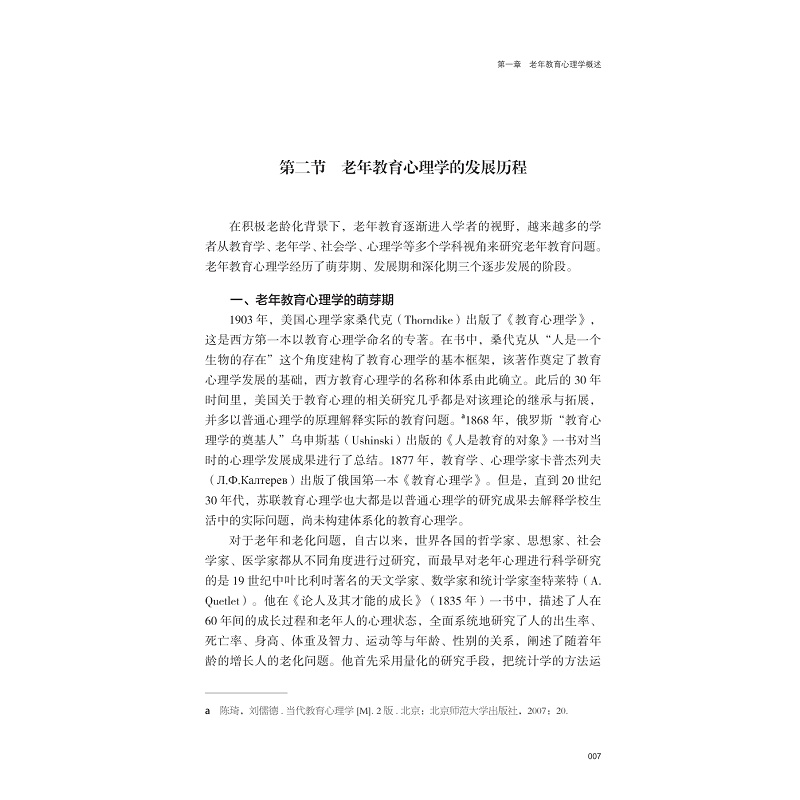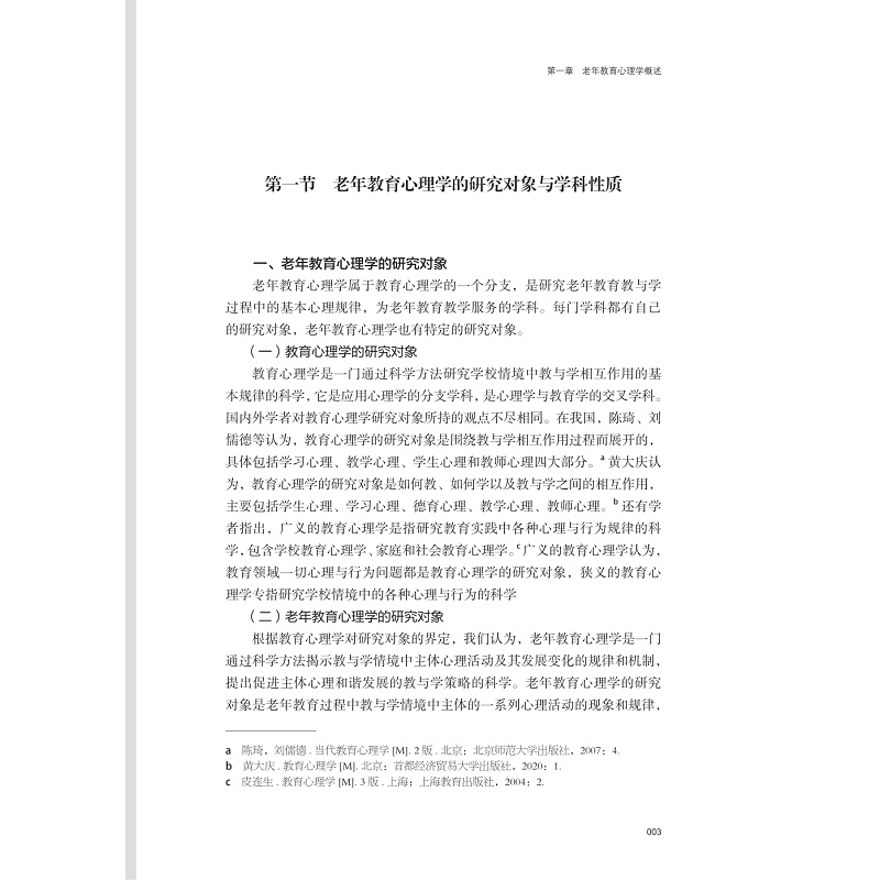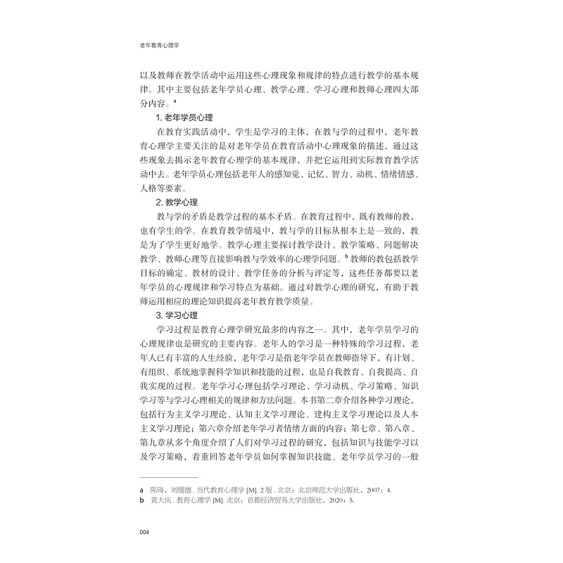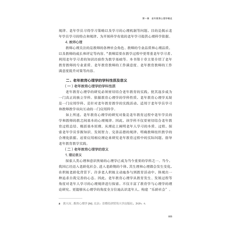 本书为国家社会科学基金教育学一般课题“教育溢价视角下老年人的幸福测度与实证研究”(BKA180235)研究成果。作者长期从事终身教育、老年教育研究,在综观有关老年心理方面的著作和资料后,用独特的视角与自主创新的精神,并以积极老龄化为视角,以促进我国人口健康老龄化、和谐老龄化、成功老龄化为目标,根据我国老年人心理发展状况,在吸取国内外的经验和研究成果的基础上编写而成。本书共十二章,从老年学习者的感知觉、记忆、智力、学习动机、情绪情感等多个维度,研究老年教育的心理学基础,以达到老年人心理健康与维护的教育学目的。