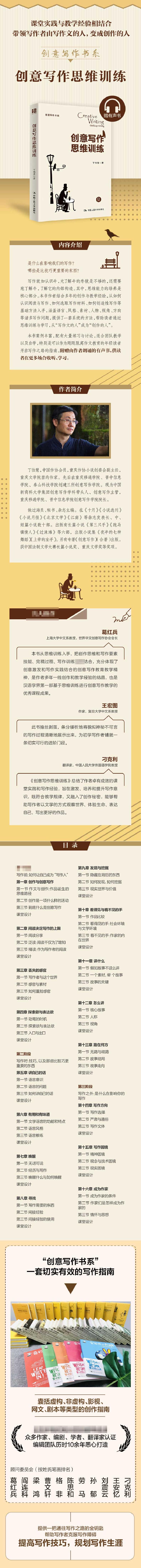《创意写作思维训练/创意写作书系》作者结合多年的创作与教学经验,从如何认识阅读与写作、如何选取写作材料、如何创造性写作等基础方法入手,涵盖语言、风格、素材、人物、视角、方向等诸多写作问题,提供了一套系统的方法,帮助读者通过思维训练与学习,从“写作文的人”成为“创作的人”。
