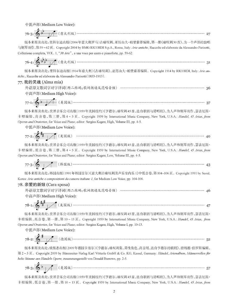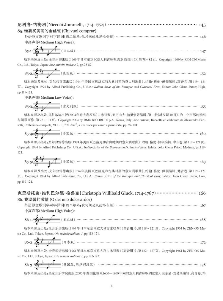 整个系列8册都是“意大利古典声乐作品”,但本册乐谱同时也编译了两位德国作曲家亨德尔(George Friedrich Händel, 1685-1759)和格鲁克(Christoph Willibald Gluck, 1714-1787)用意大利语演唱的声乐独唱名曲,他们二人当时受到了意大利那不勒斯乐派的影响,其早期作品常采用意大利语歌词来创作意大利风格的歌剧和三段体咏叹调。从风格上来看,本册曲集中编译的这两位德国作曲家的声乐独唱曲就是典型的意式古典声乐独唱作品。