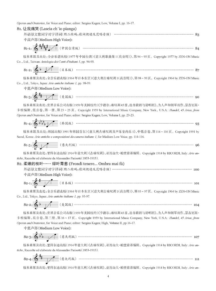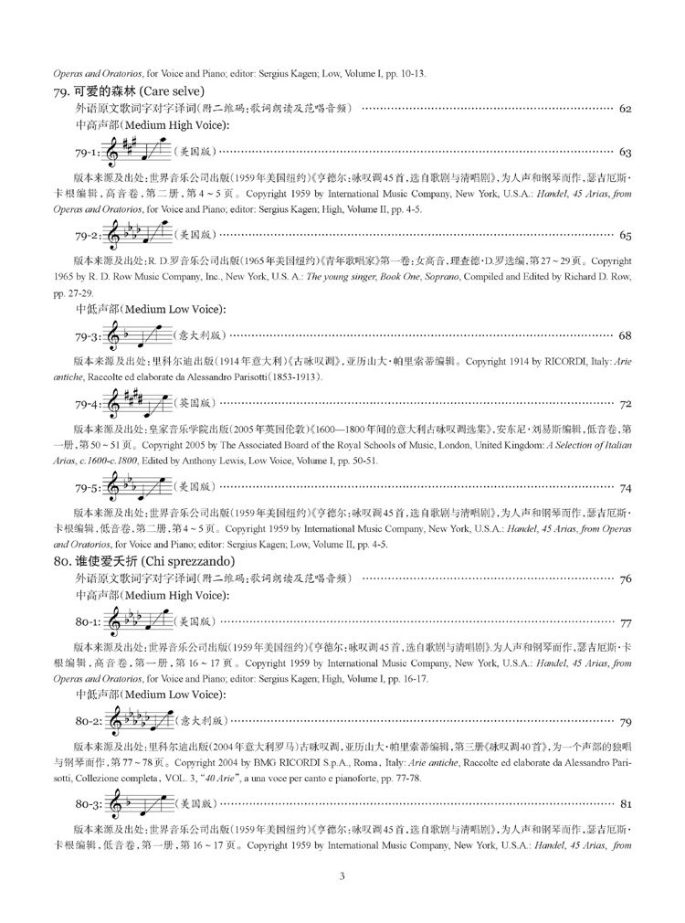 需要说明的是,国内以往选编的这个时期的曲目总量偏少且略显单调,随着国内声乐教学的不断的发展和进步,现今需要把更多相关时期的作曲家的优秀作品介绍到国内来。本套乐谱除了收编有国内声乐界较为熟悉的一些曲目,另外还有一些曲目是国内全新出版,以起到推陈出新、丰富教学曲目的作用。