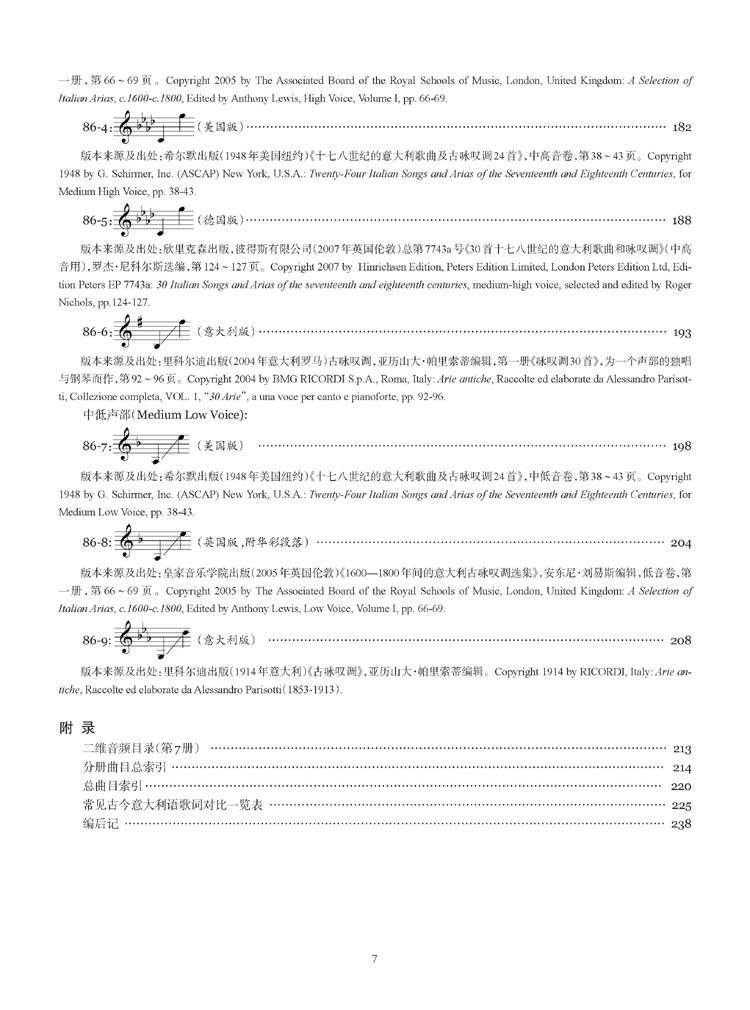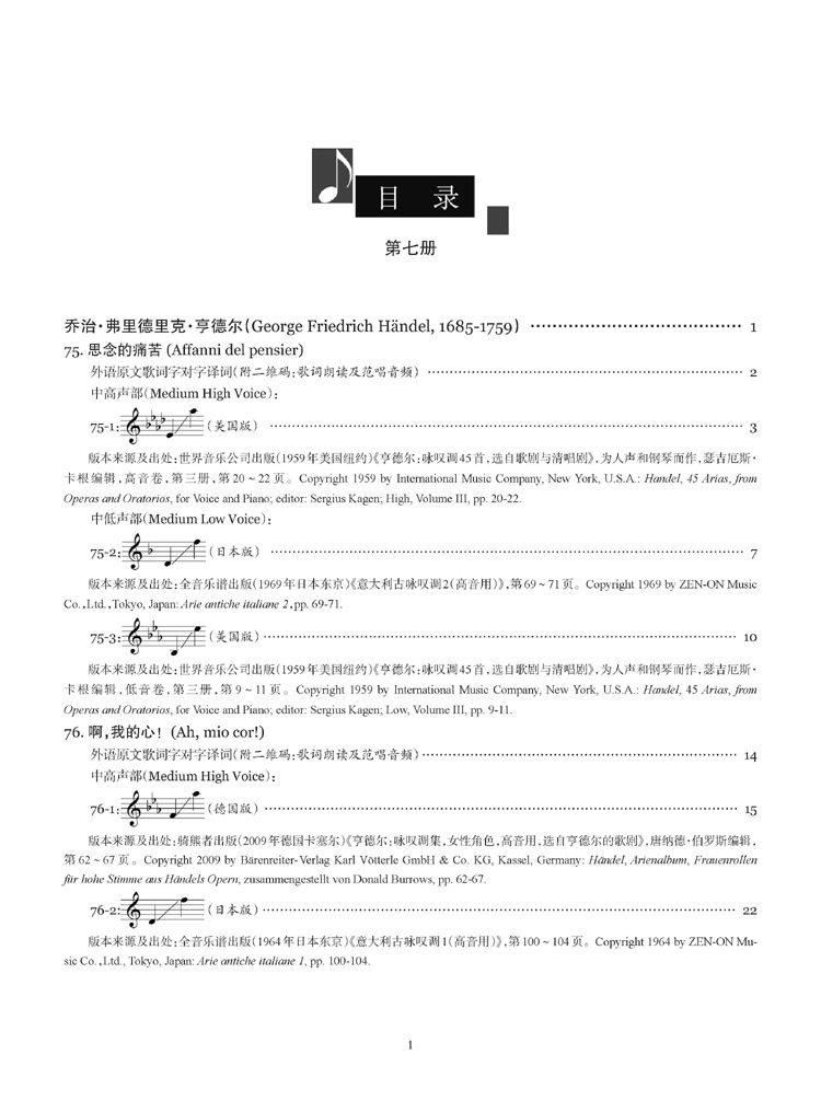 第七册主要是巴洛克后期及古典时期的意大利声乐独唱作品。本册乐谱分别包括亨德尔(George Friedrich Händel, 1685-1759)、约梅利(Niccolò Jommelli, 1714-1774)、格鲁克(Christoph Willibald Gluck, 1714-1787)等3位作曲家的声乐独唱曲12首,例如享有意大利歌剧作家之称的亨德尔的歌曲《让我痛哭》以及歌剧改革家格鲁克的歌曲《我温馨的激情》(国内此前常译作《我怀着满腔热情》)等名曲,另有诸多全新曲目。(鉴于篇幅有限,本文中提及的歌曲都只列出中文歌名,其对应的外语原文曲名,请各位亲对照您手中的出版物的目录查找及对照,抱歉哟!)