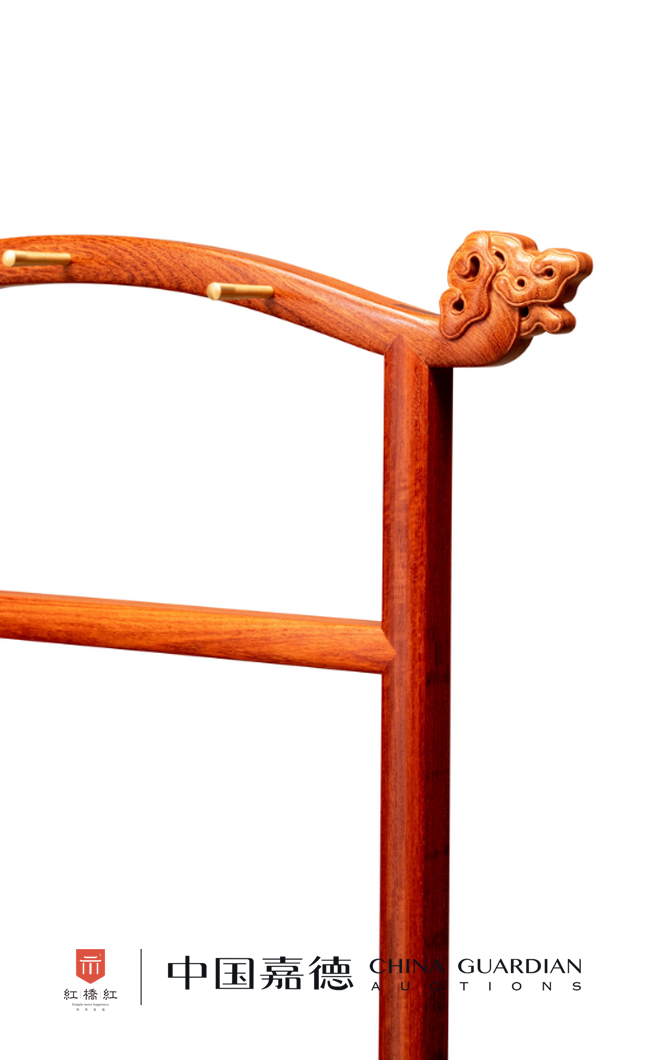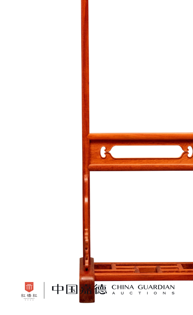 此衣架采用缅甸花梨木制,木纹自然,红润有泽。造型简约舒朗。搭脑中部拱起,两端上扬,圆雕灵芝纹,可悬挂衣帽,等距安装的铜轴上亦可悬挂物品。上部施横枨,可搭衣物,同时增加稳固性。下部双枨间安锼挖渔门洞透光的绦环板,装饰兼加固。桥形底墩,上植立柱和透雕灵芝纹的站牙,底部横竖枨上可置鞋履,是一件十分实用的衣架。