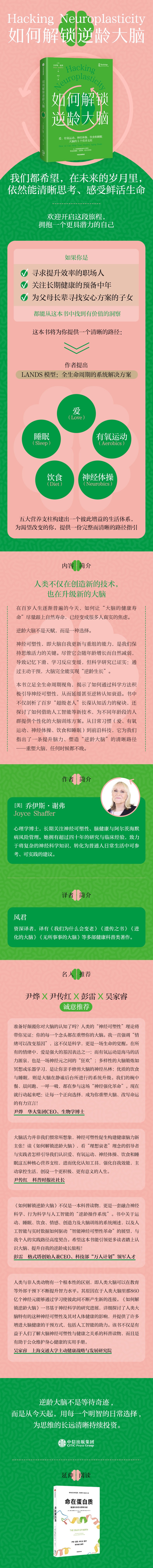 乔伊斯·谢弗,著,[美] 乔伊斯·谢弗(Joyce Shaffer)博士是临床心理学家,长期关注神经可塑性、脑健康与阿尔茨海默病风险管理。她拥有超过四十年的研究与临床经验,致力于将复杂的神经科学知识,转化为普通人日常生活中可参考、可实践的建议。
