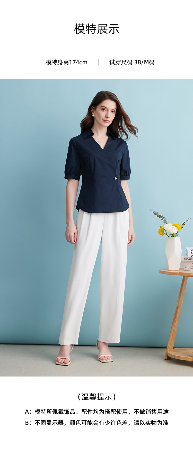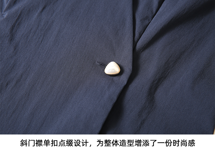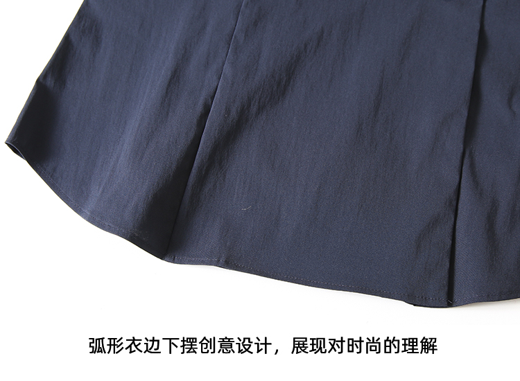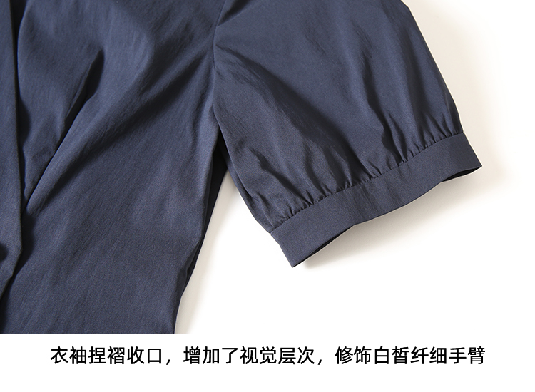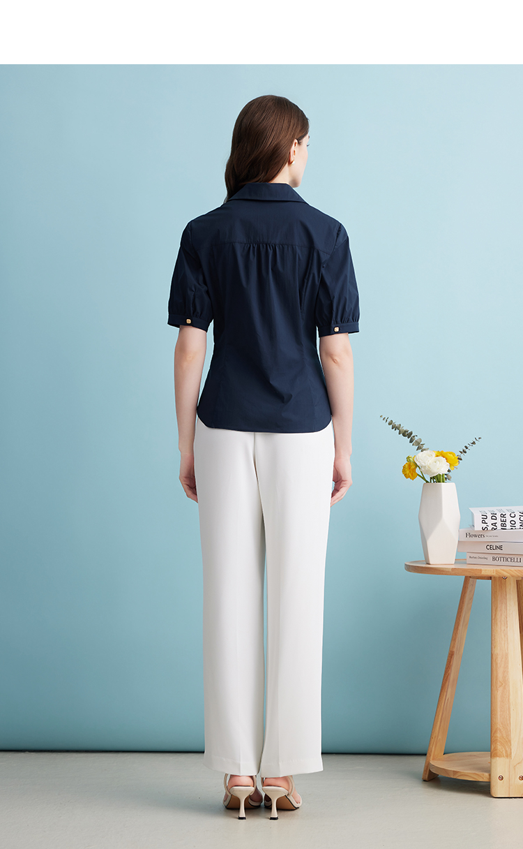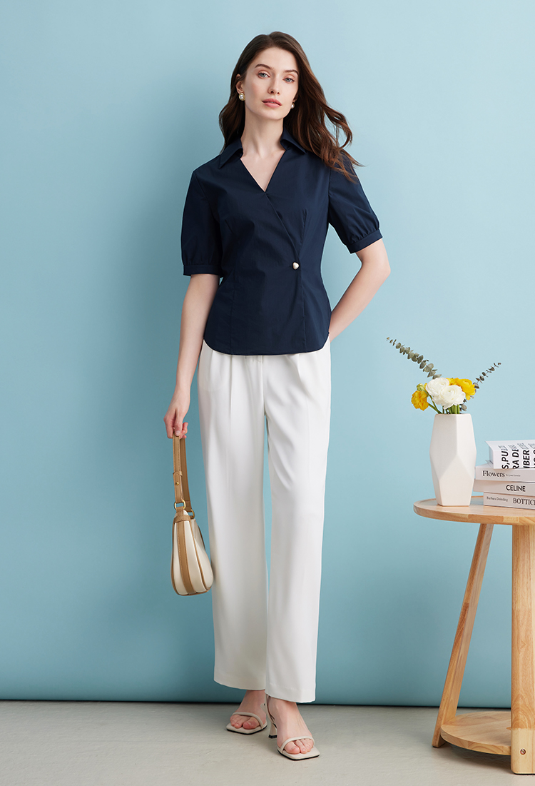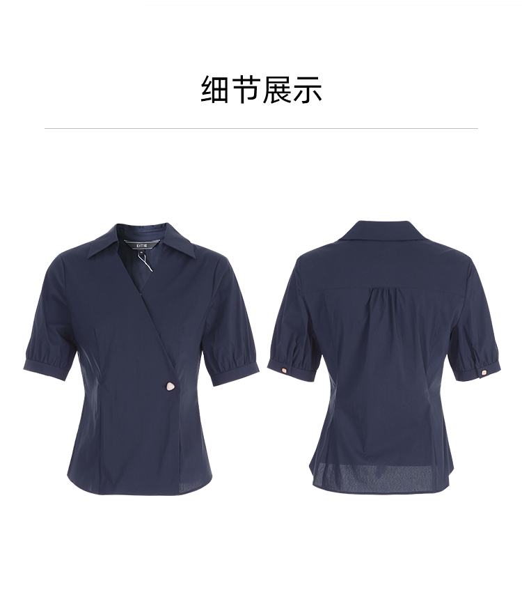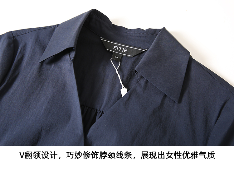 EITIE爱特爱夏季新款干练通勤时尚显瘦V领收腰深蓝色衬衫上衣B2409306