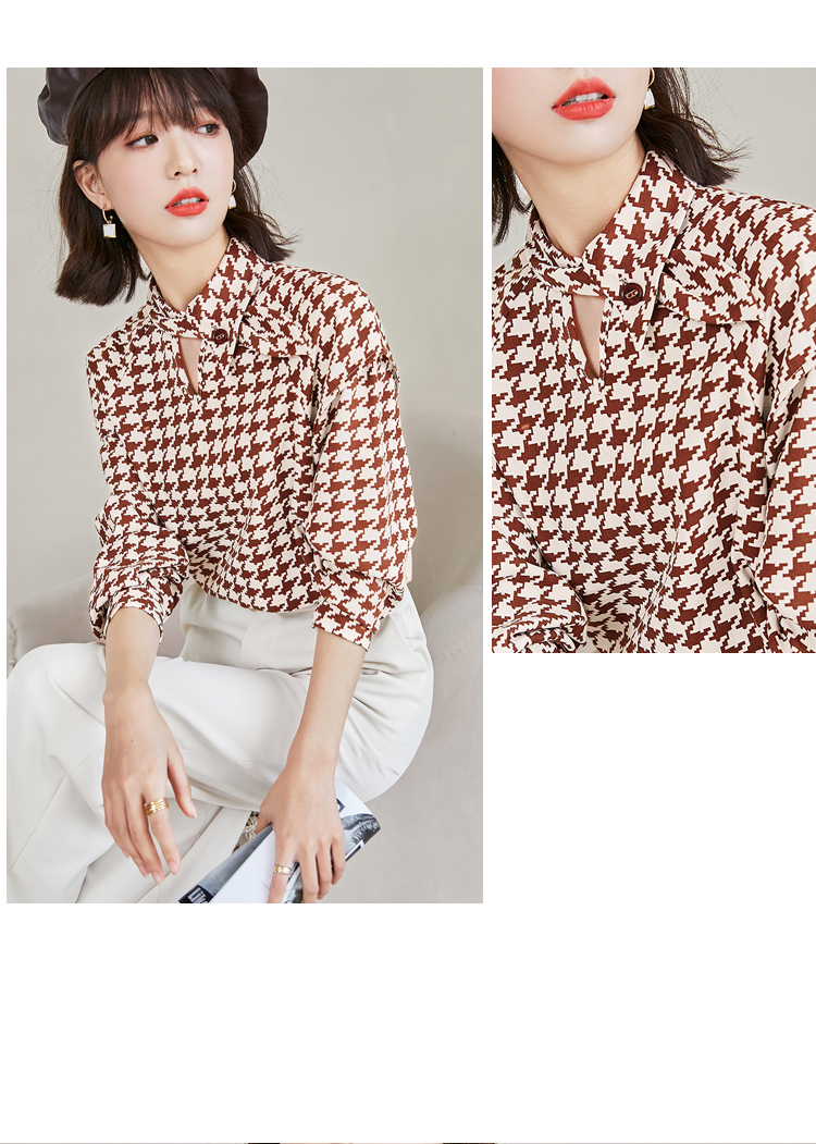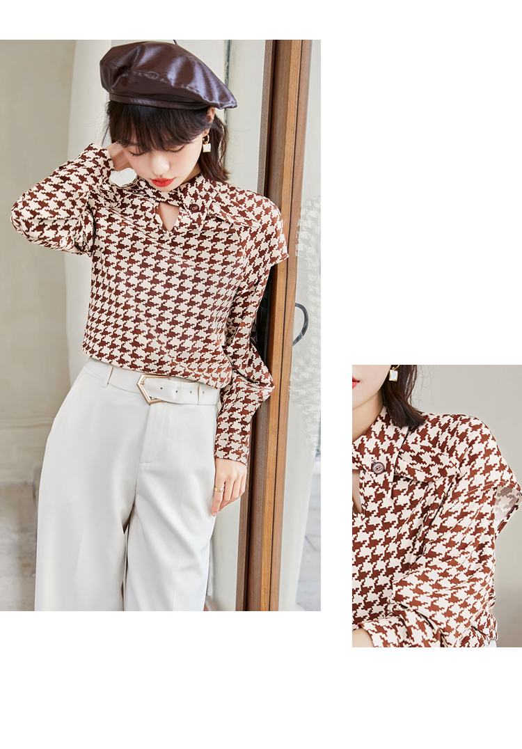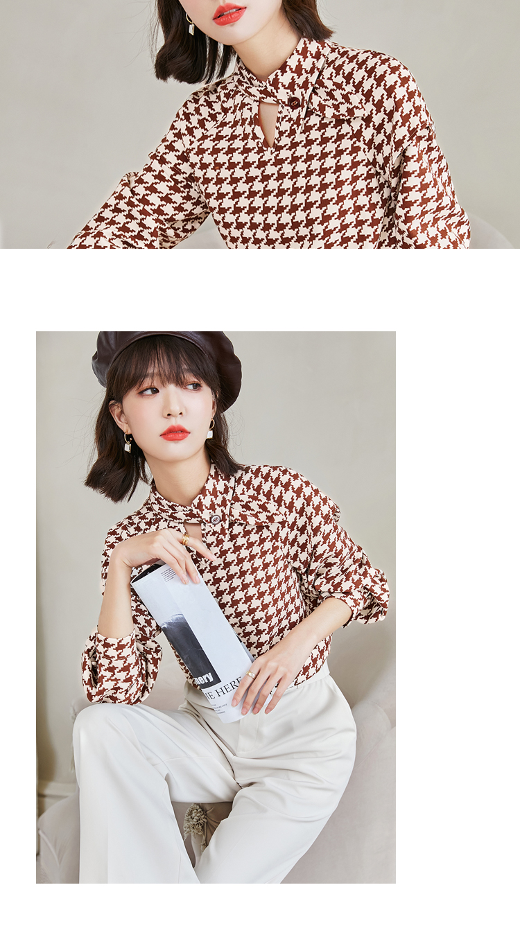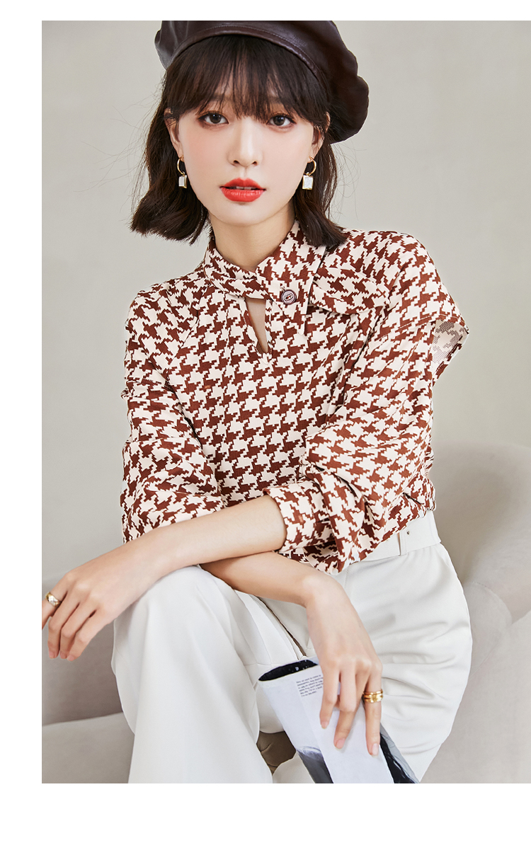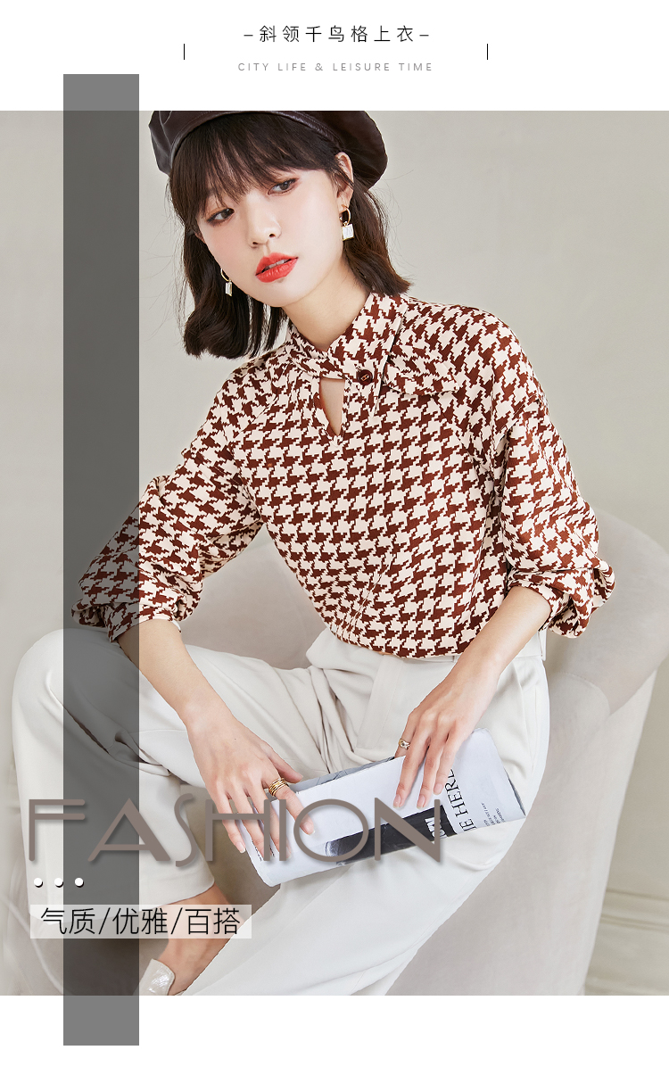 早春千鸟格子衬衫女设计感小众不对称别致漂亮挂脖领长袖雪纺上衣 NSM1854