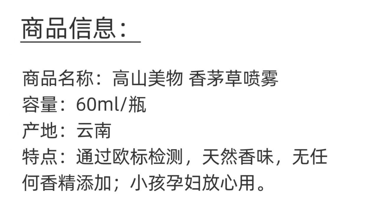 【高山美物】香茅喷雾 纯天然香气 无任何香精添加 小孩孕妇放心用