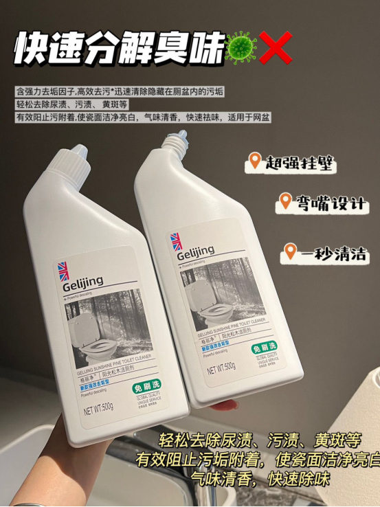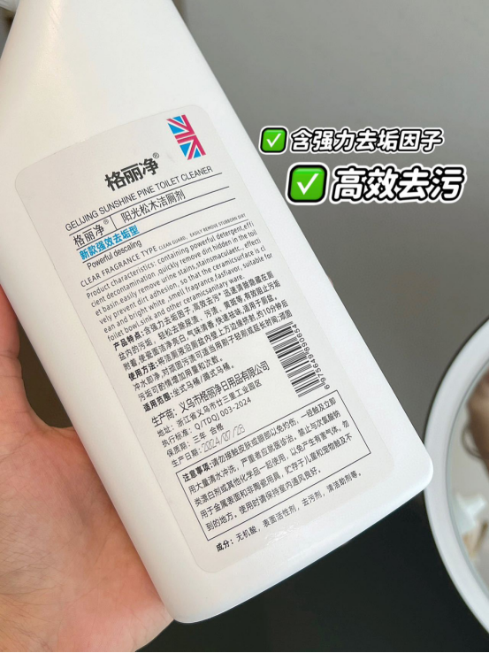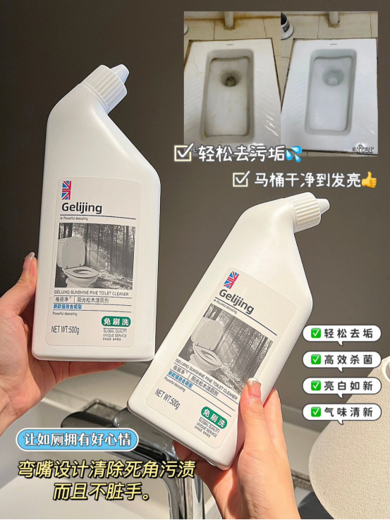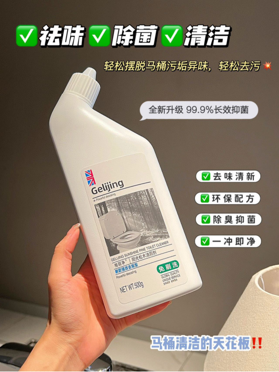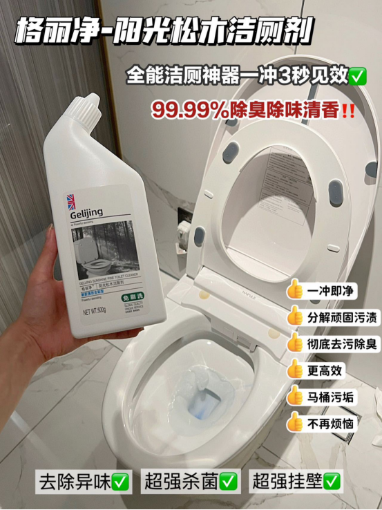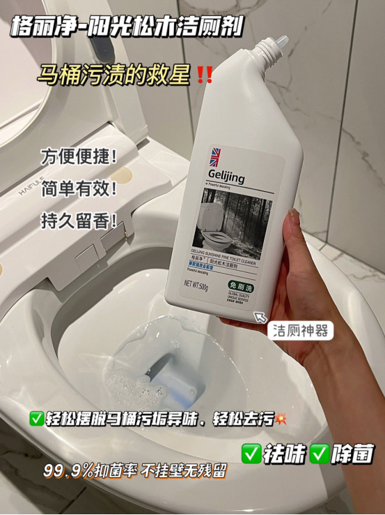 🫧还在为马桶异味难闻、尿垢、屎垢 冲洗不干净、厕所易脏难刷而困扰么⁉ 而且健康、绿色、环保无对人体有害物质 采用市面最新配方能轻松的清除尿垢、 水垢、污垢等,还原马桶亮白 明显的消除异味还杀菌非常好用也非常方便 马桶在长期使用过程中容易积累污垢 产生难闻的气味 可以快速洁净让家居卫生有保障 这款【格丽净-阳光松木洁厕剂 】 轻松清洁马桶、蹲厕、便器 污垢、尿垢快来一瓶试试吧