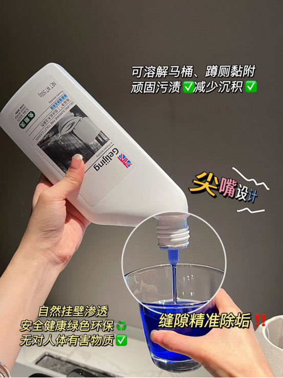 格丽净-阳光松木洁厕剂 含强力去垢因子,高效杀菌清污垢 可以轻松去除尿渍、污渍、黄斑等 而且不伤马桶瓷釉面 采用温和新配方,蓝色液体 强力除垢,光亮防护,高效杀菌 安全清香,4大功效融为一体! 弯形鹰嘴设计,清洁不费力 液体挂壁均匀更持久清洁力那是杠杠的!