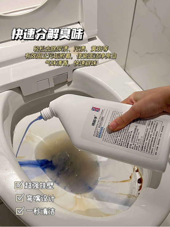 挂壁效果好,挂壁好才能有效除菌杀菌 起到彻底清洁作用 轻度的污渍,尿渍不用刷 倒上后停留3分钟直接冲洗 去除表面发黄尿渍瓷器釉面,光亮洁净。