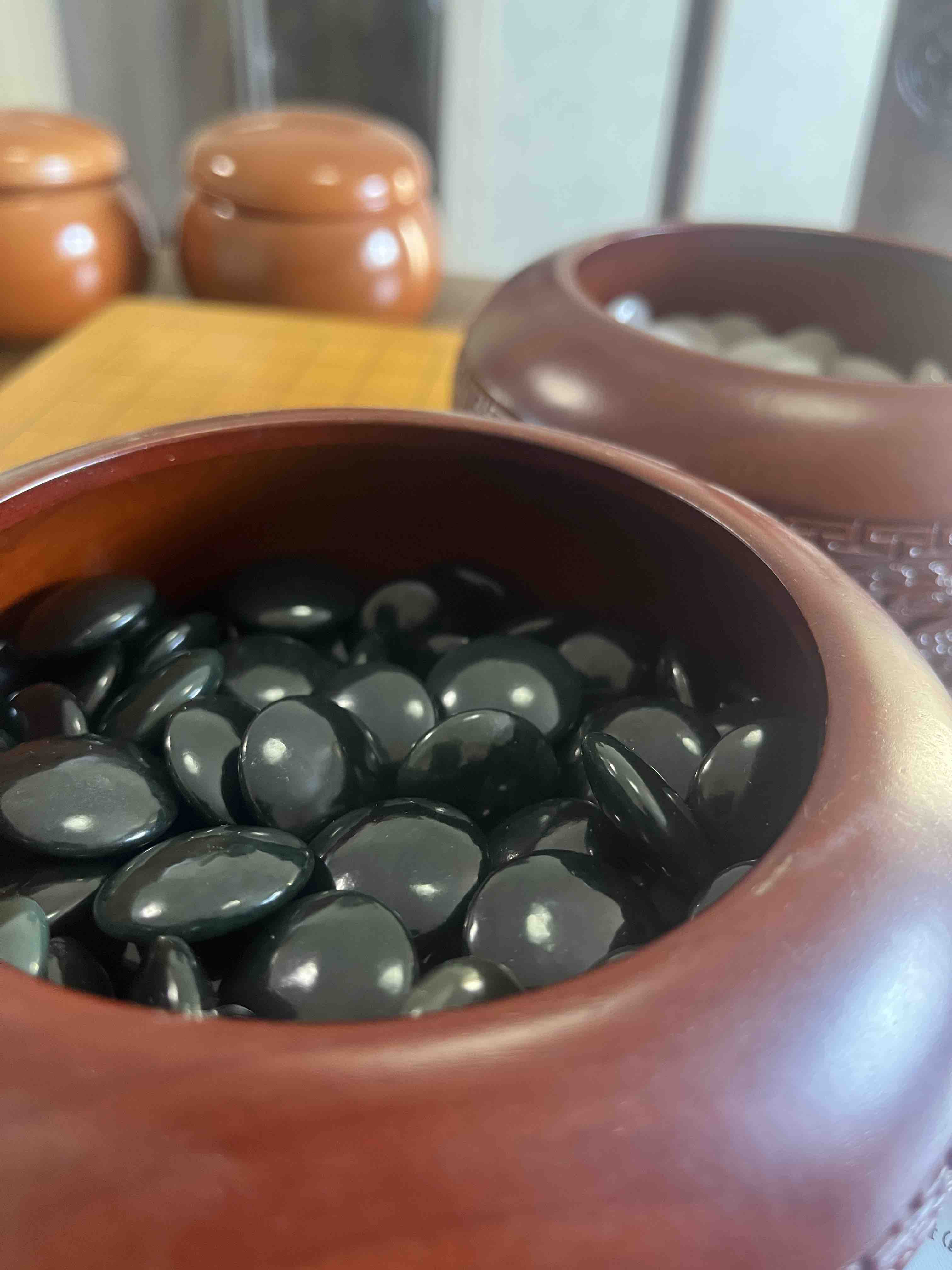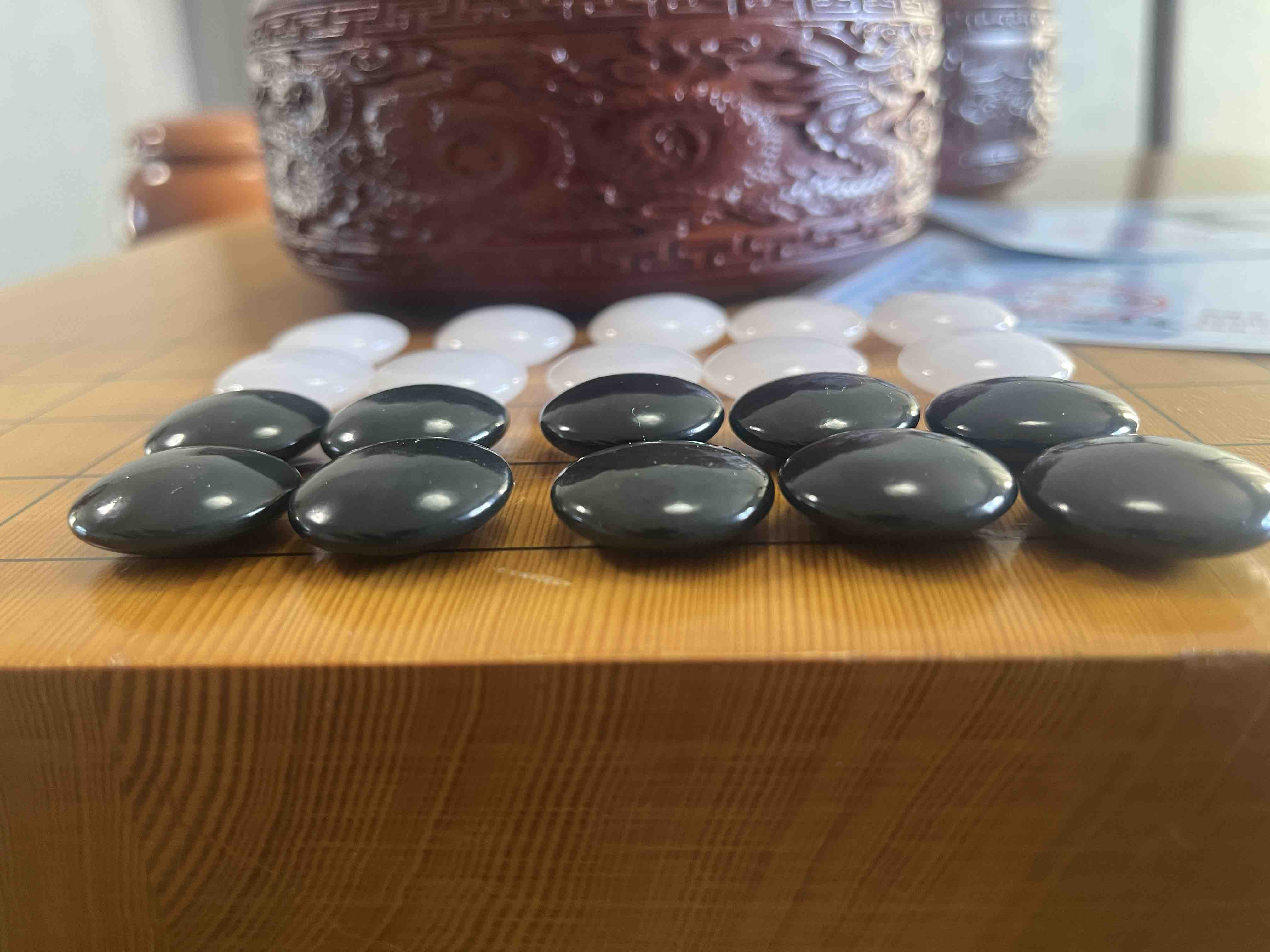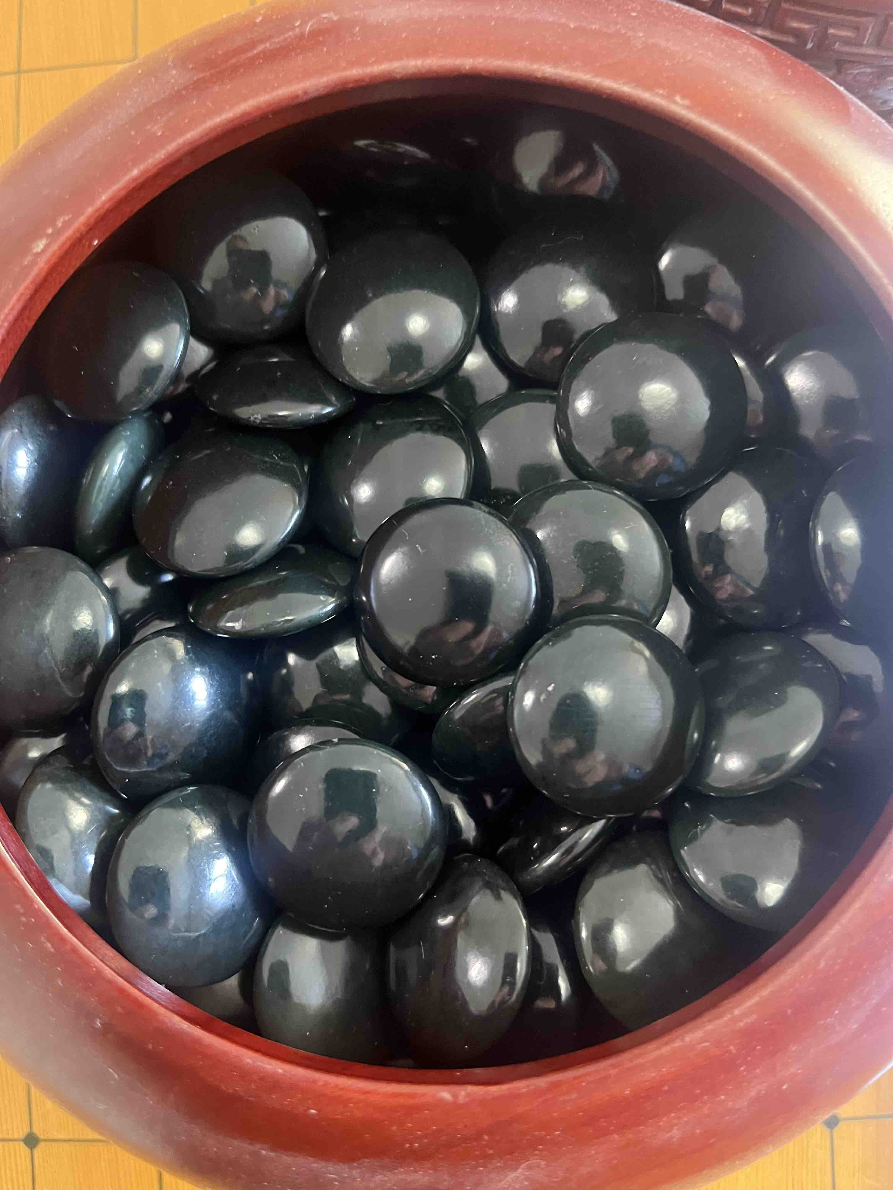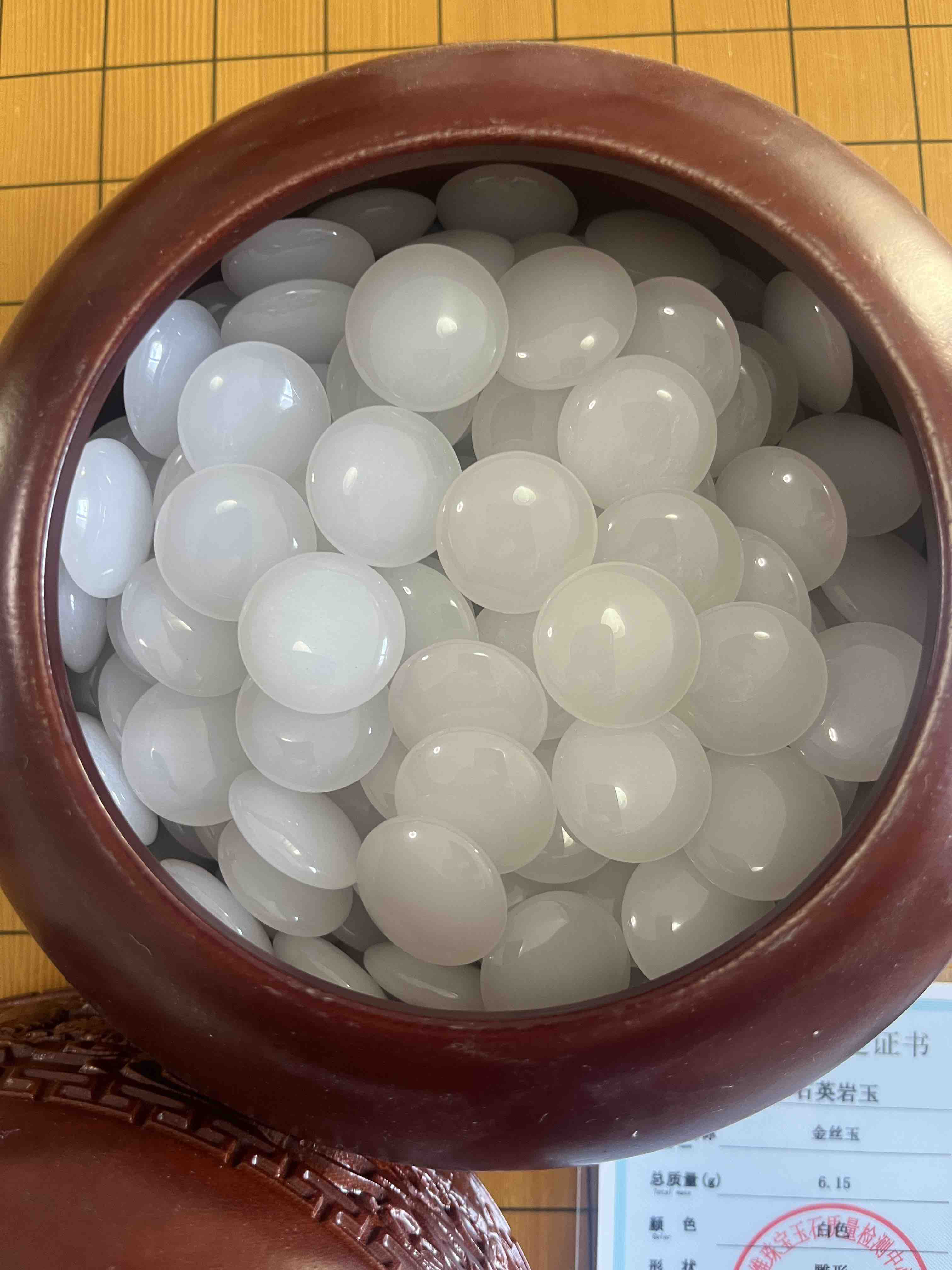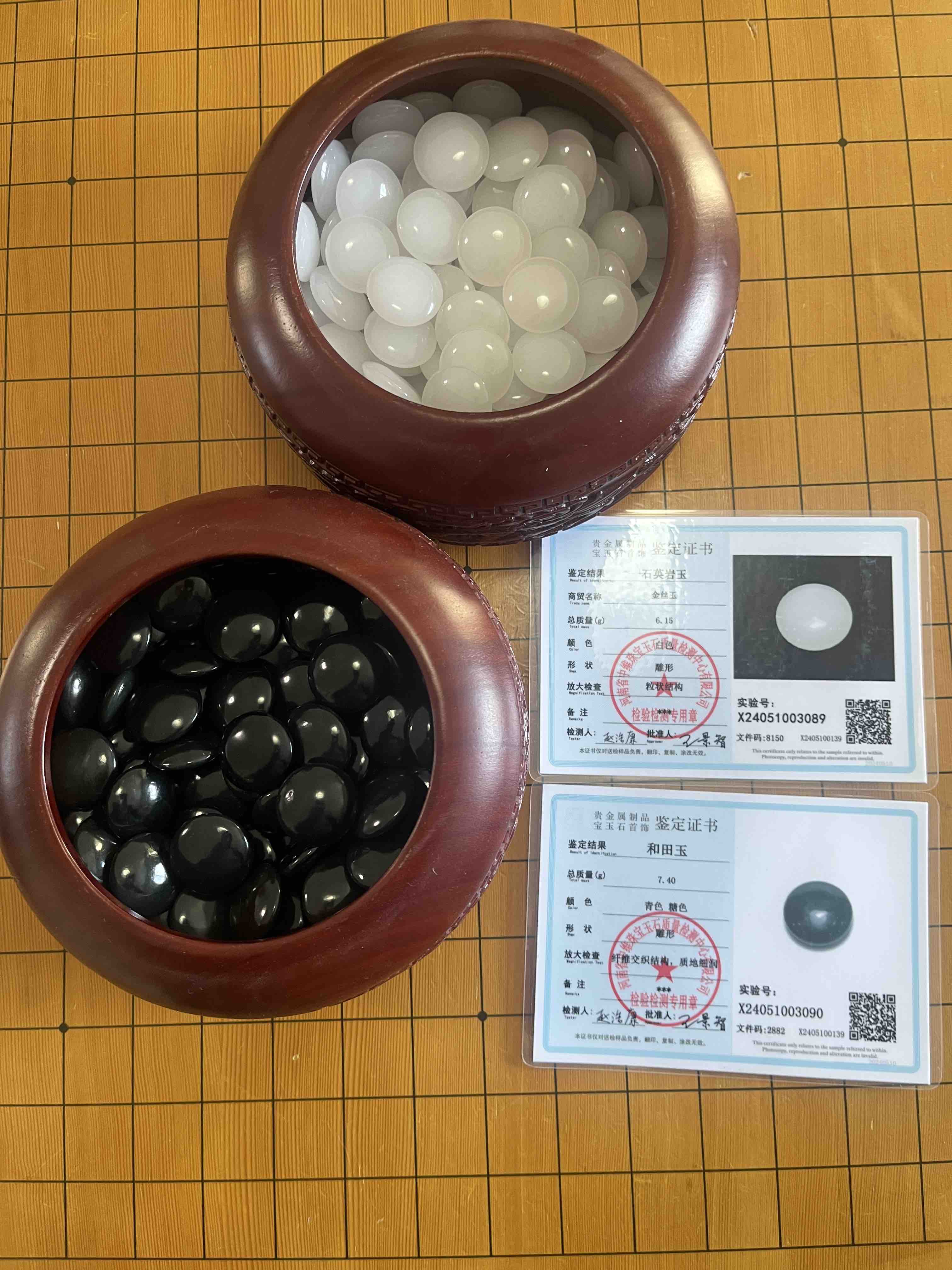 天然玉石围棋:新疆和田玉青玉黑子+金丝玉白子+雕龙红木罐