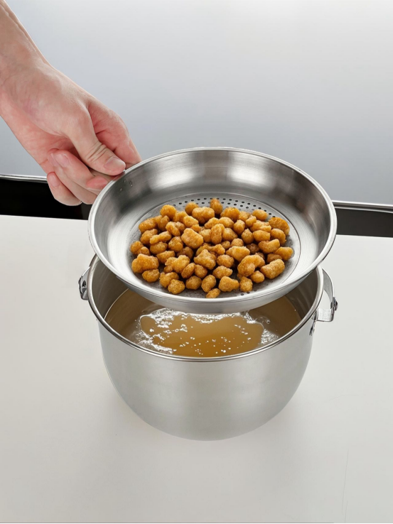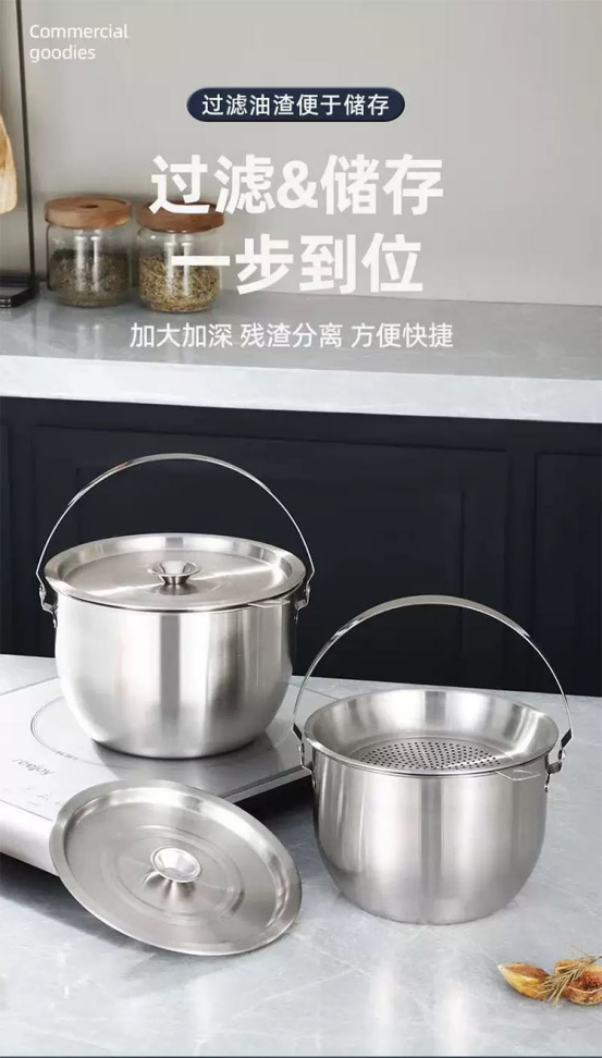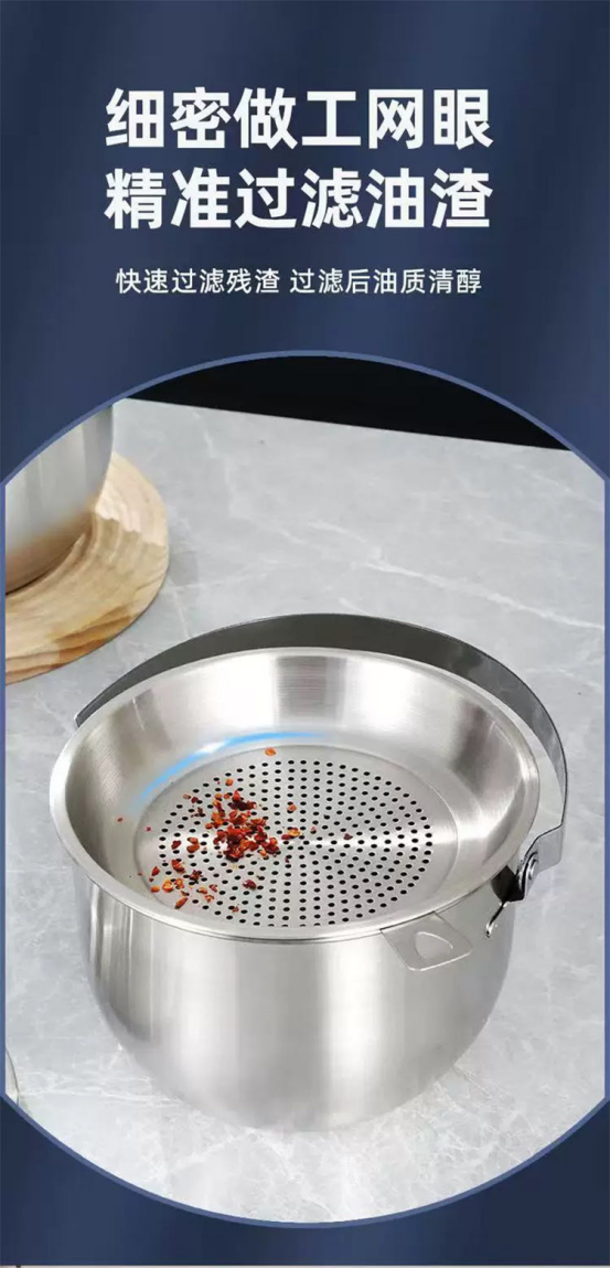 倒热油时最烦满勺渣渣? 这款不锈钢猪油罐的滤网网眼hin细密! 滚烫猪油“哗啦”一倒,大块油渣被拦截,细小杂质全过滤,出来的油透亮像蜂蜜~炒菜、拌面香得更纯粹! 再也不用盯着油底发愁,滤净率高达99%,厨房小白也能炼出老师傅级别的清亮猪油!
