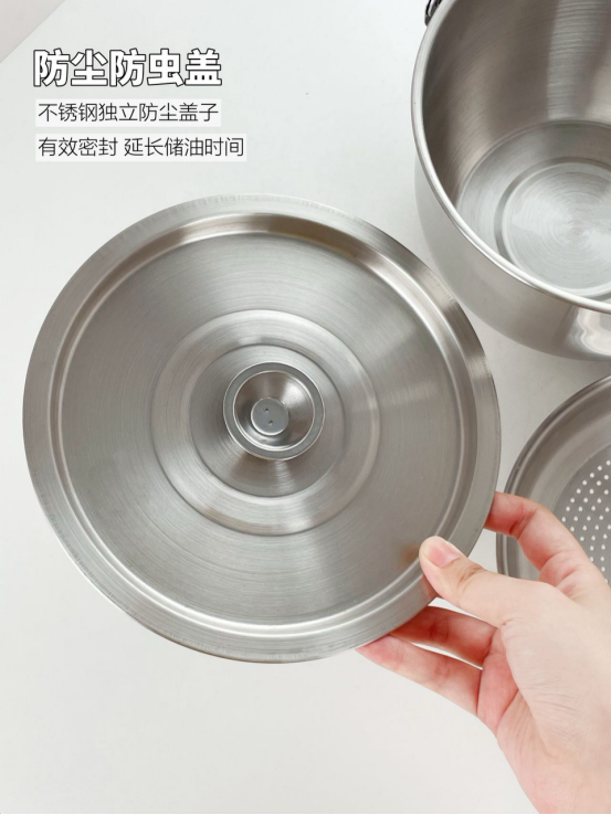 别再用塑料罐装热油啦! 优选优质不锈钢,耐高温不怕变形 炼好的滚烫猪油直接倒进去也不会释放有害物质 表面光滑,油渍一擦就净,再也不怕藏污纳垢长霉斑
