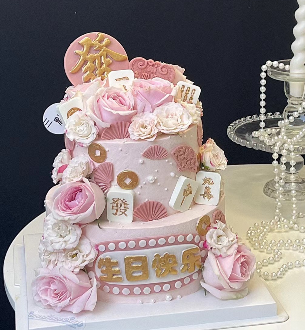 【臻品系列】---双层加高半翻糖【粉色鲜花麻将蛋糕】