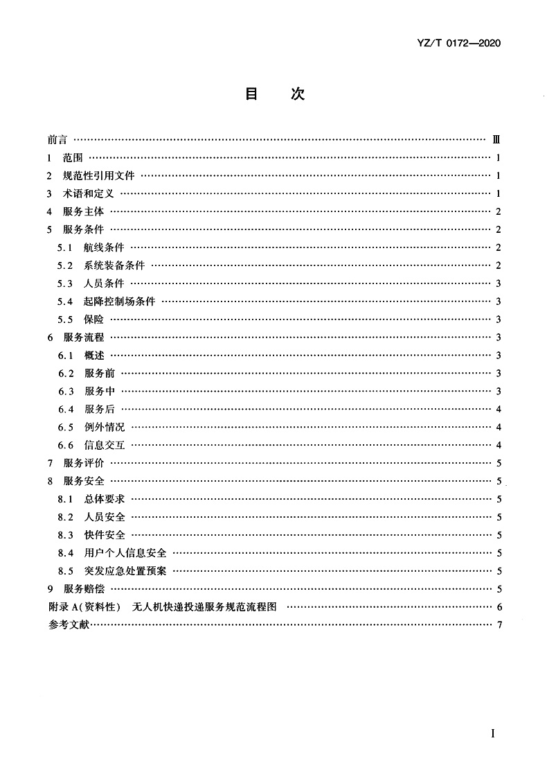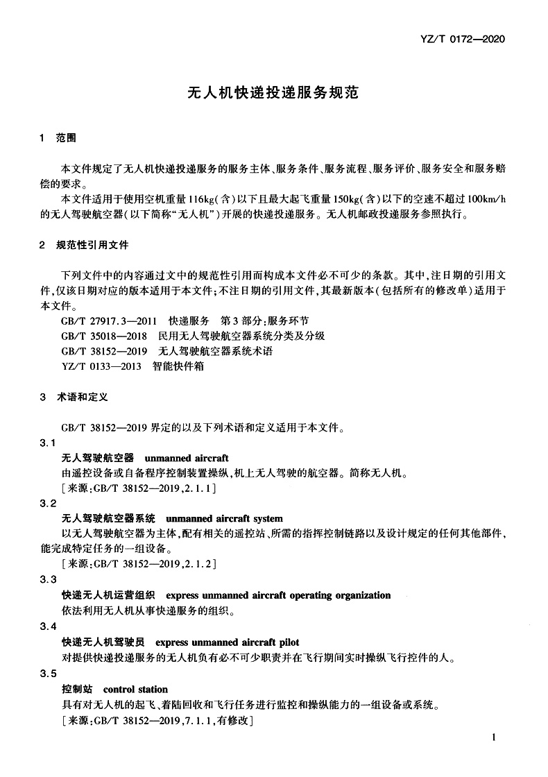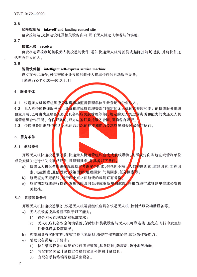 无人机快递投递服务规范(YZ/T 0172—2020)