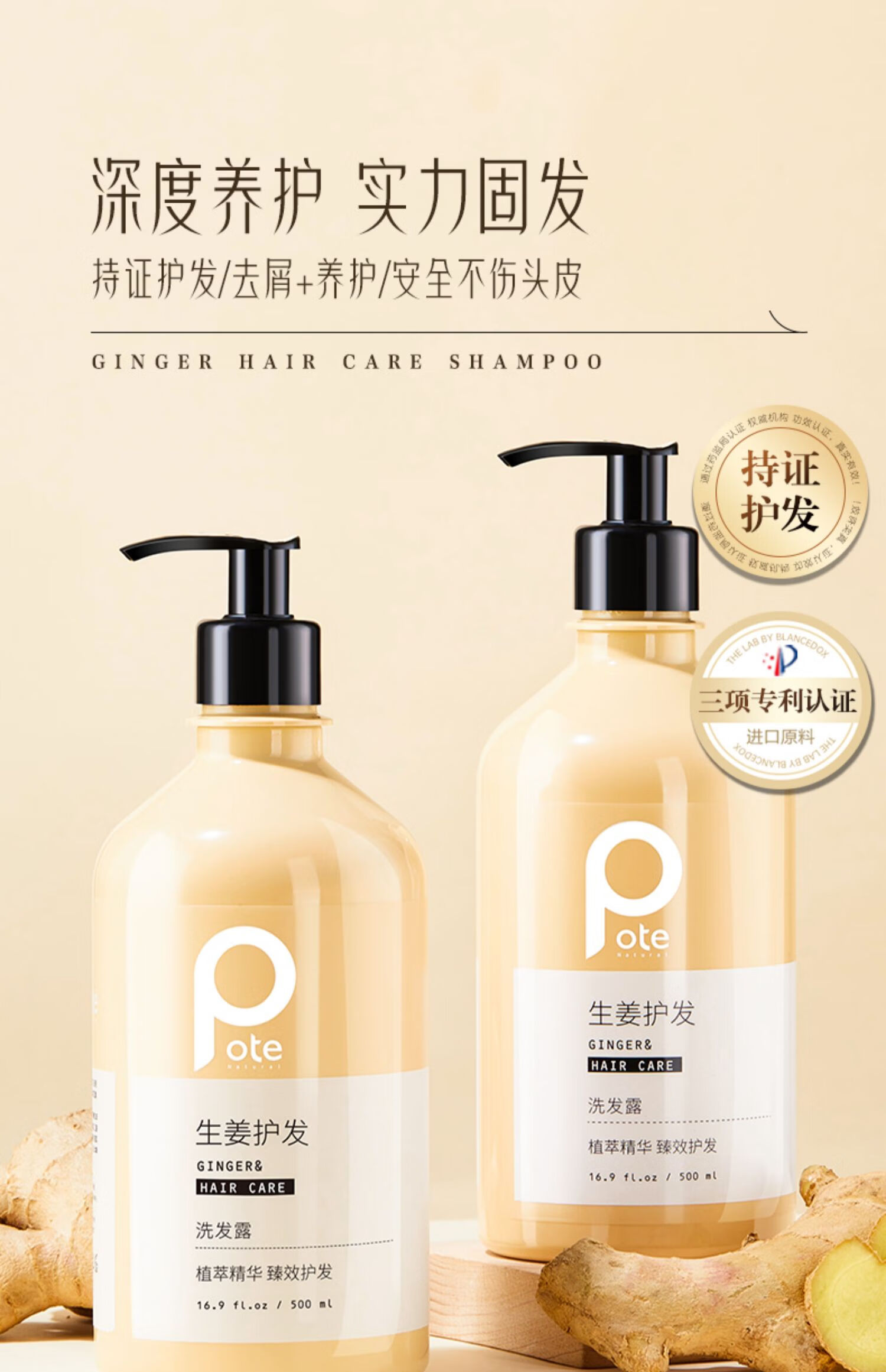 送2包试用体验装【柏缇POTE 生姜养护洗发水】500ML一瓶,萃取天然姜汁,强韧发丝,臻养护发!