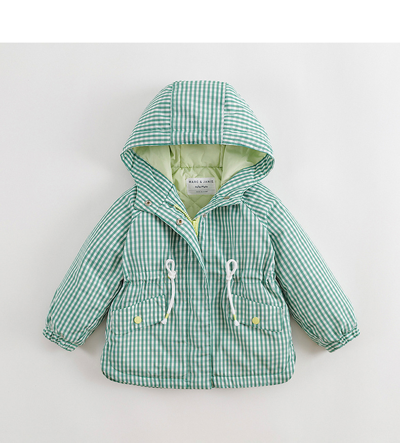 马克珍妮秋装新款女童儿童绿格印花收腰连帽风衣外套231787