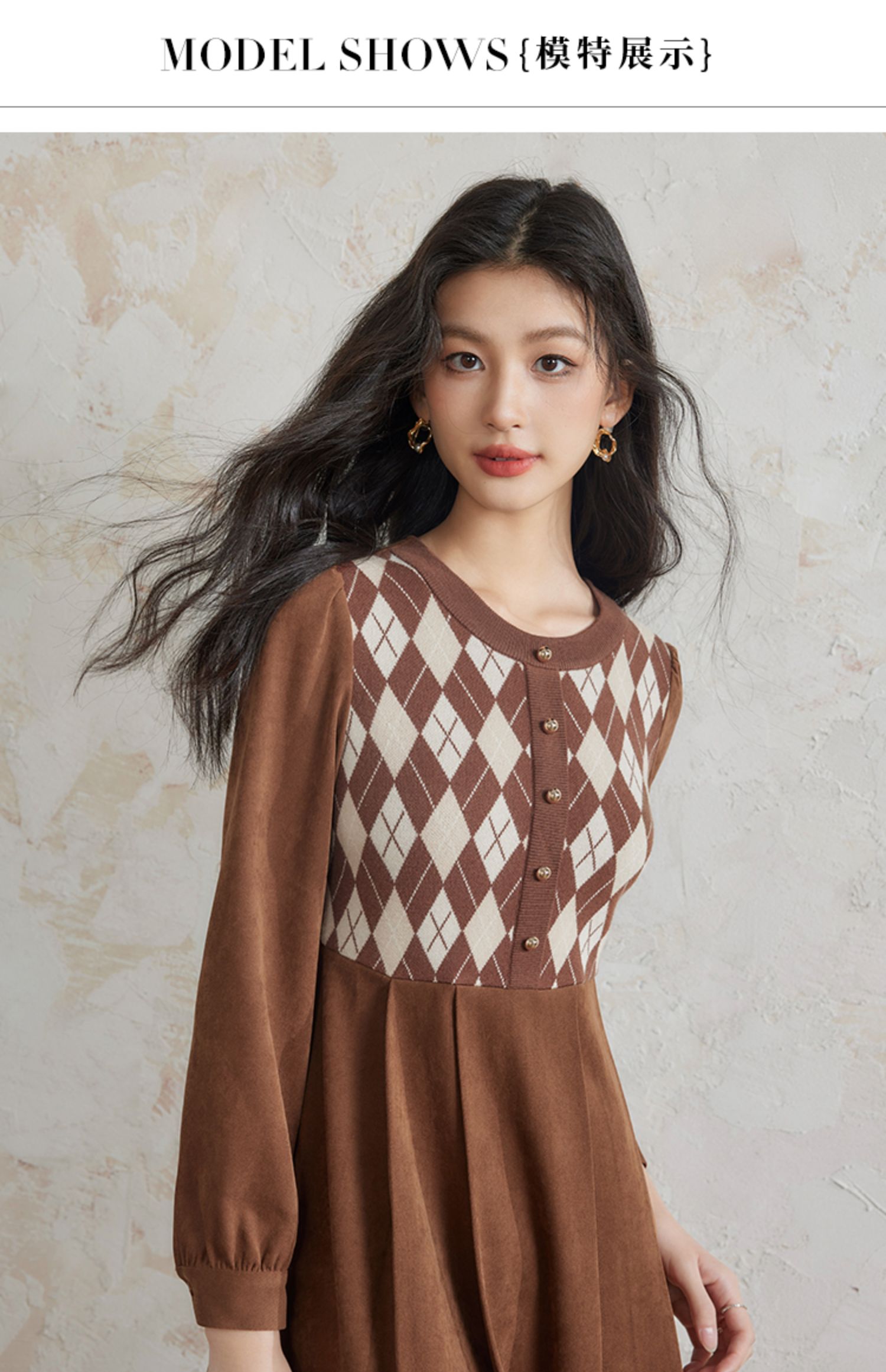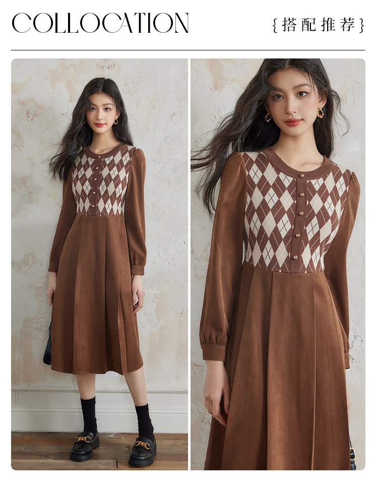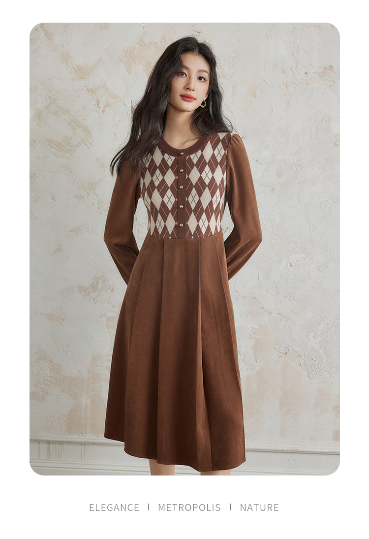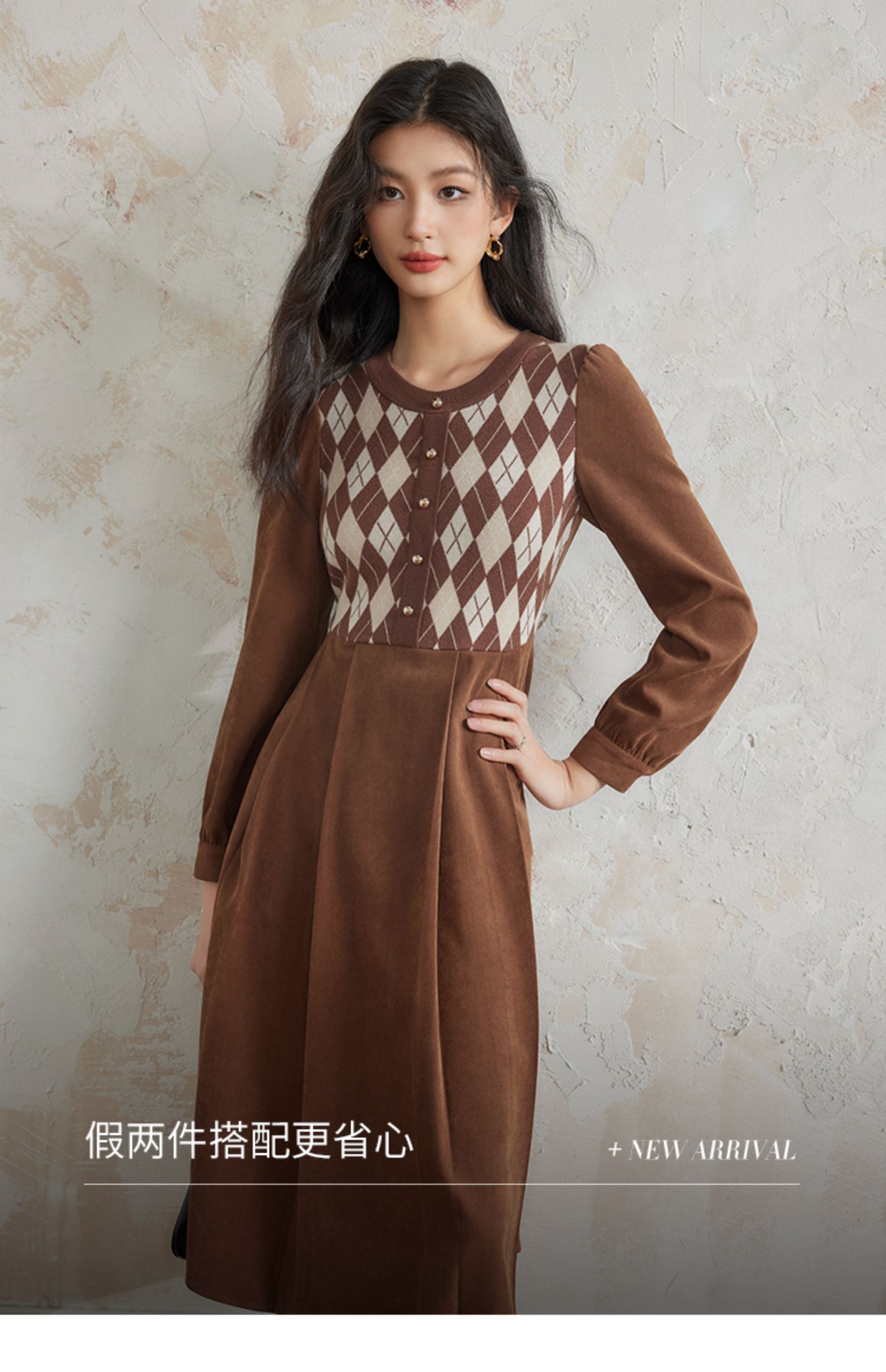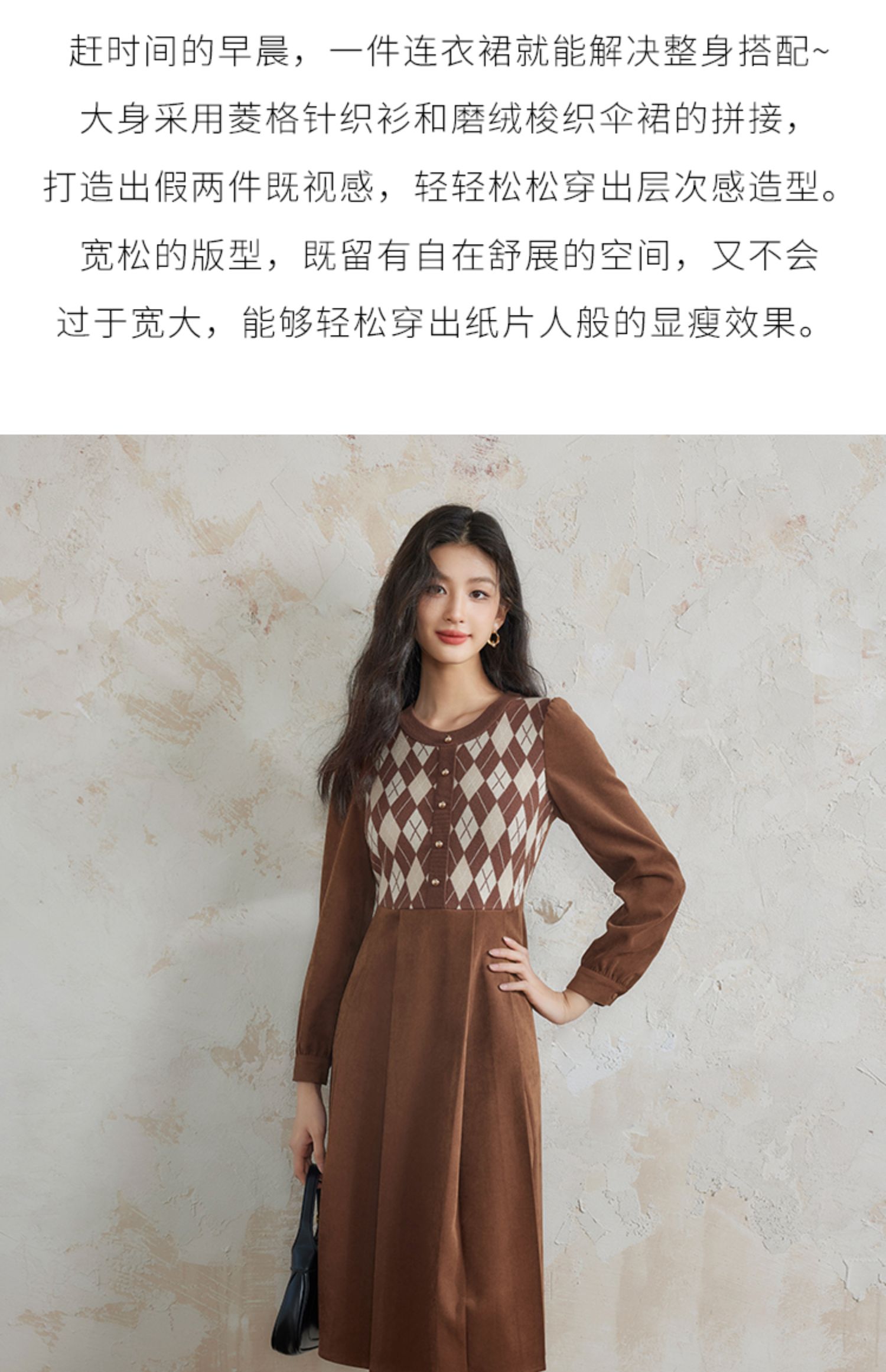 【专属特价】熙世界棕咖色菱格针织拼接磨绒假两件显瘦连衣裙秋冬
