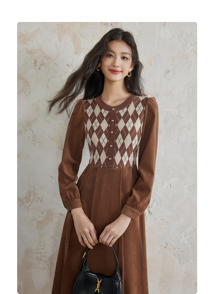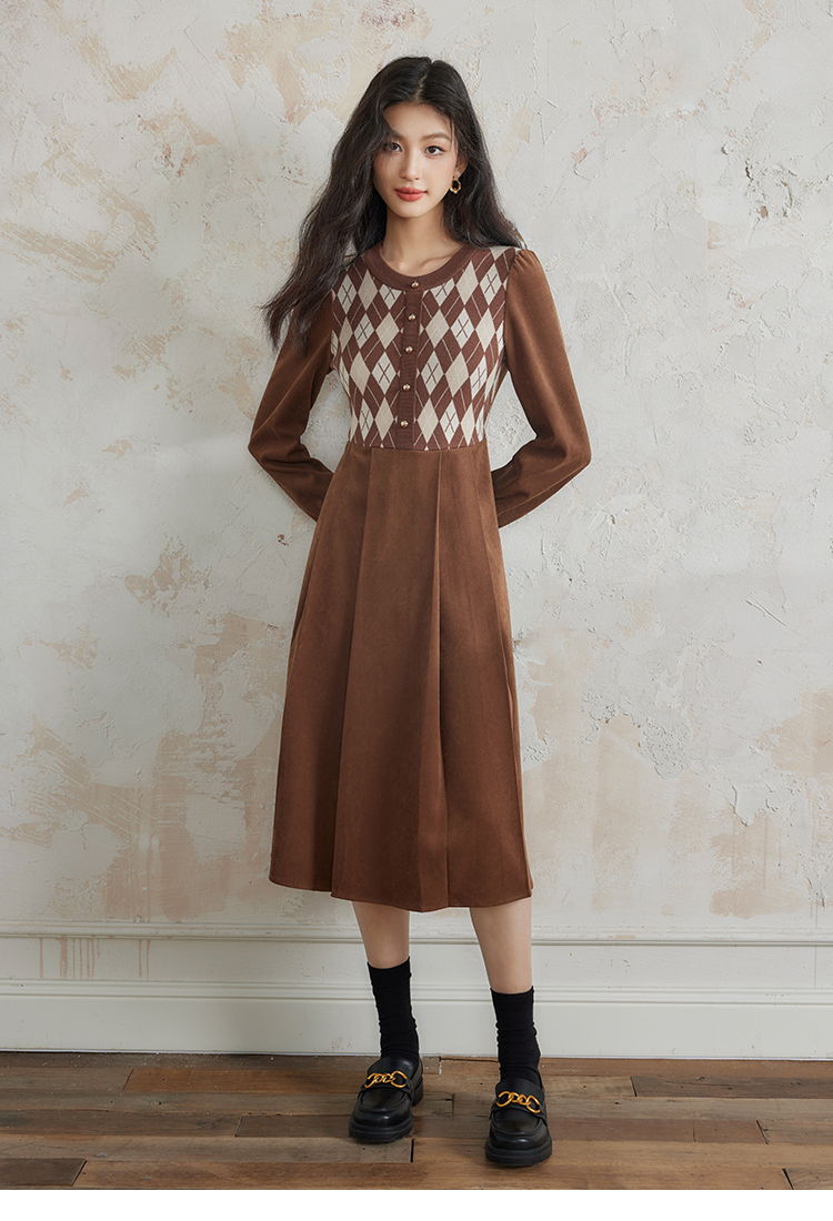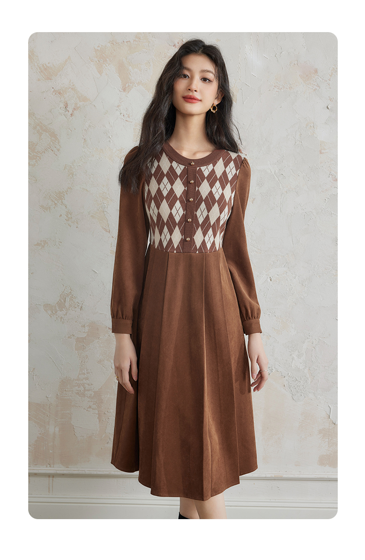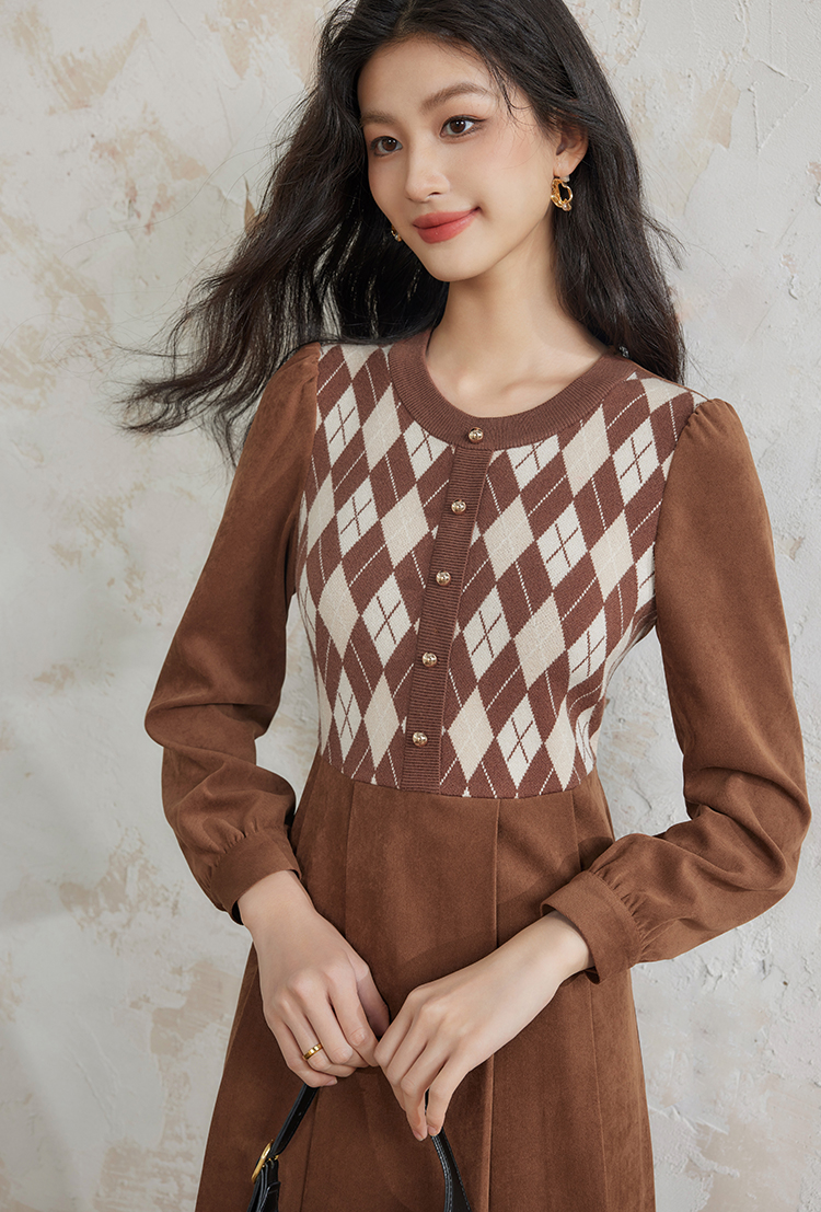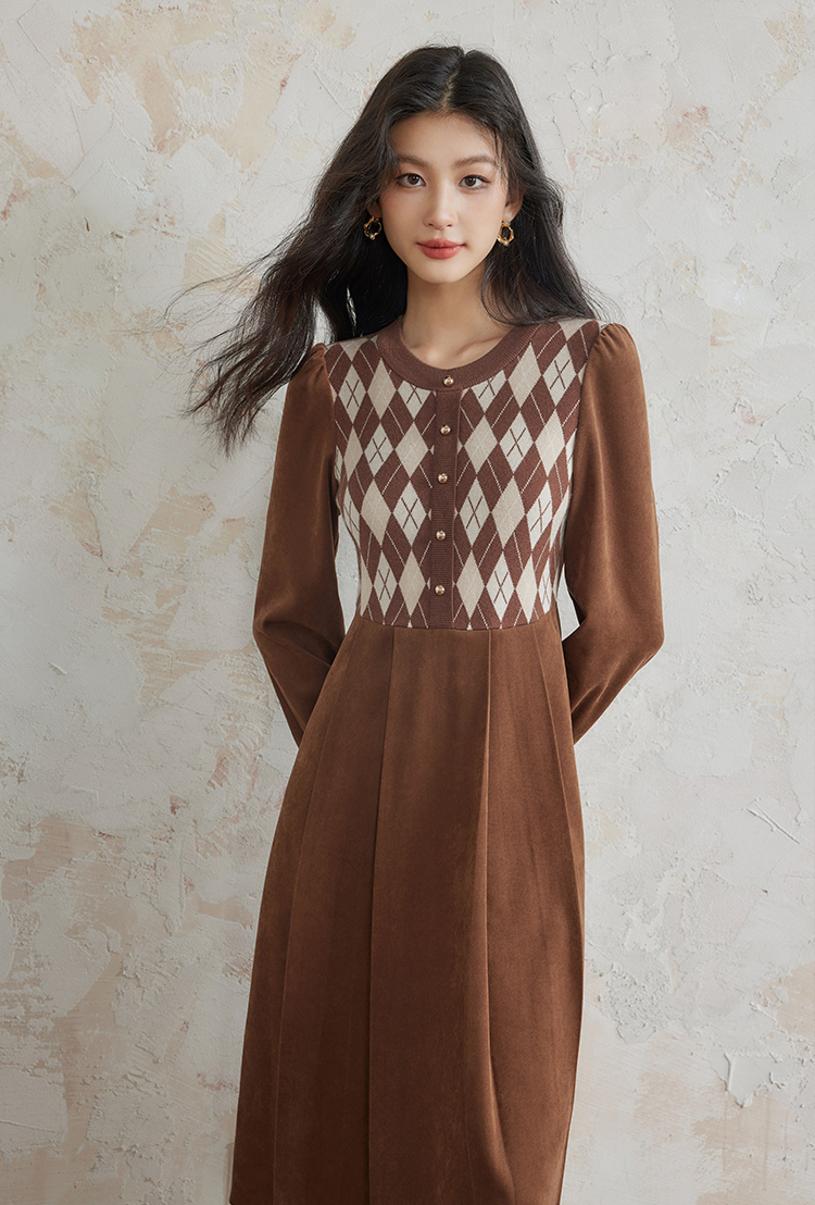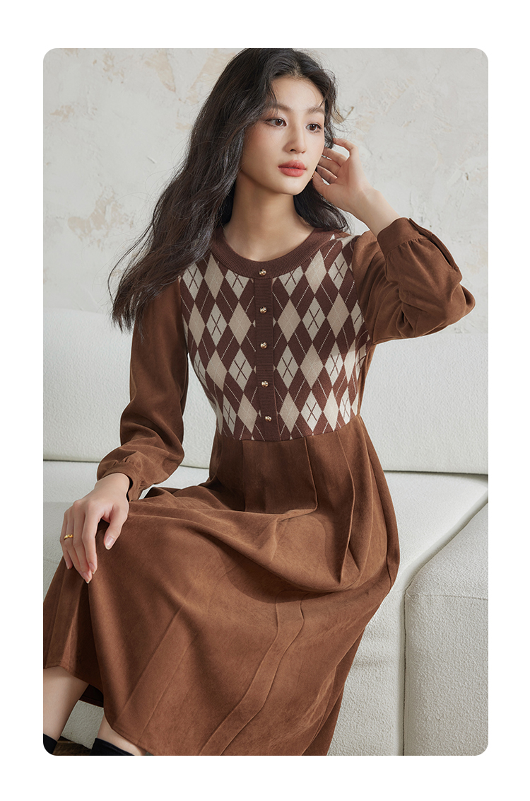 【专属特价】熙世界棕咖色菱格针织拼接磨绒假两件显瘦连衣裙秋冬
