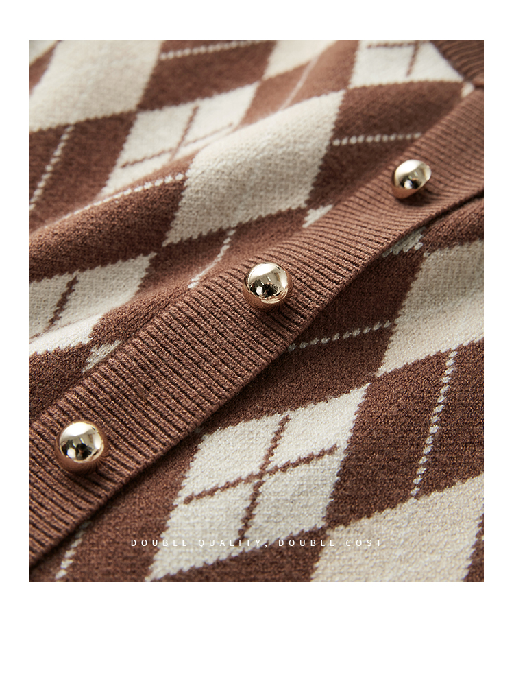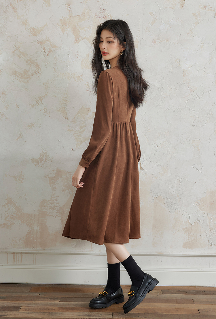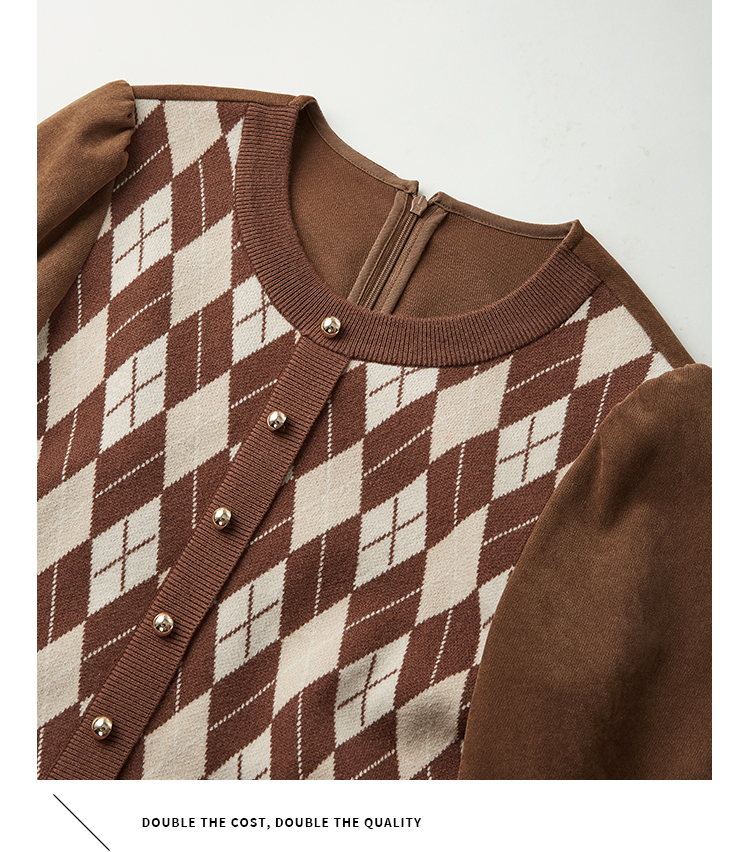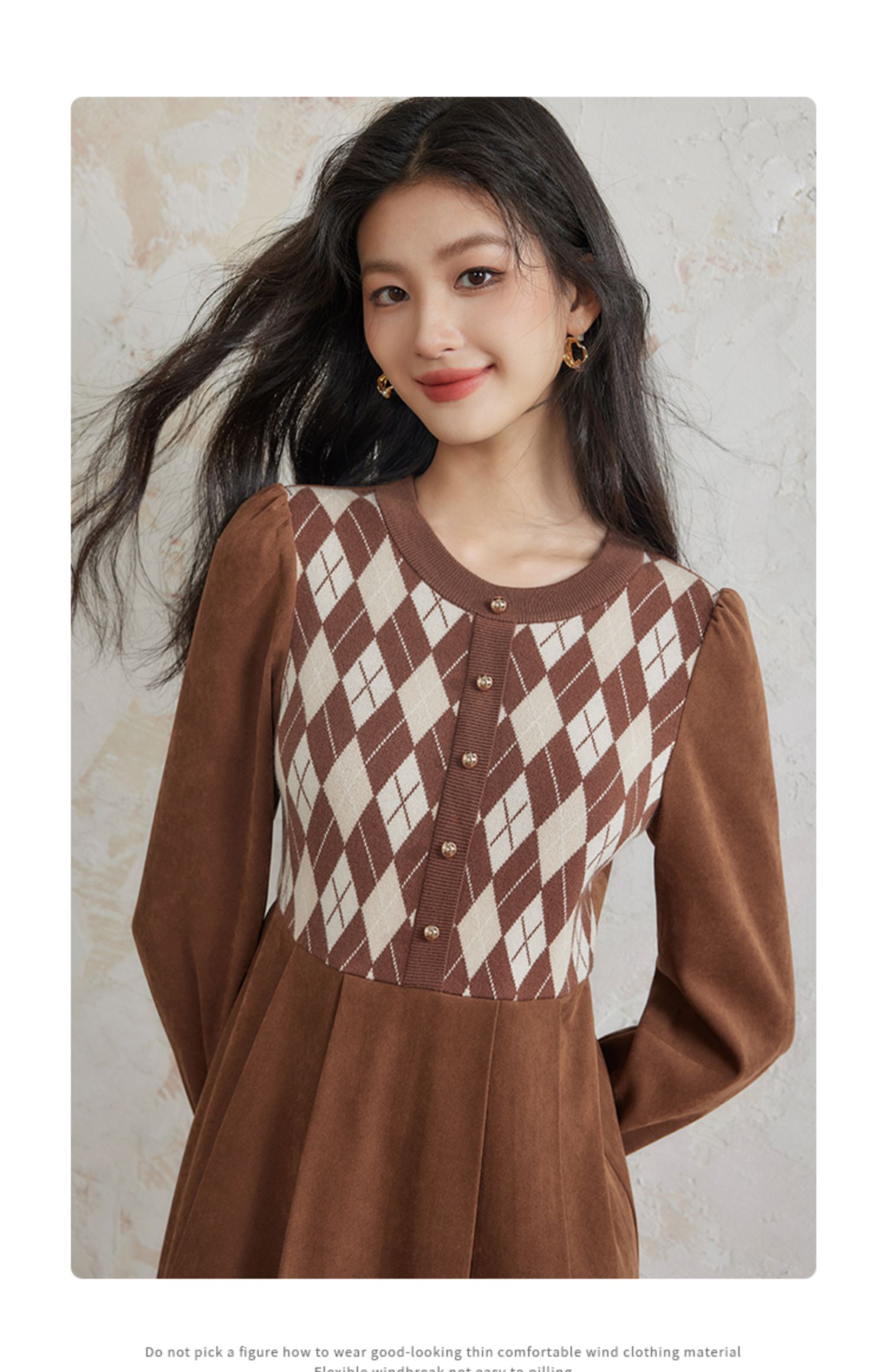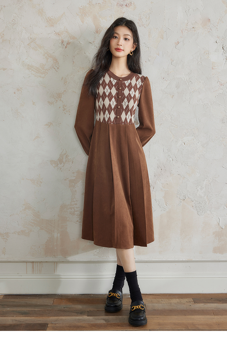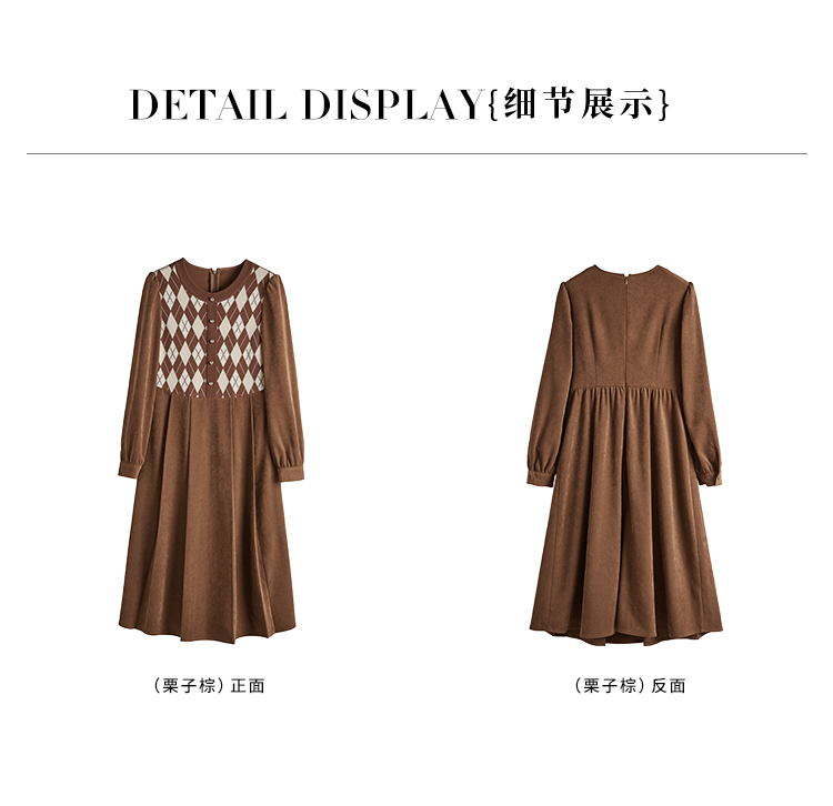 【专属特价】熙世界棕咖色菱格针织拼接磨绒假两件显瘦连衣裙秋冬