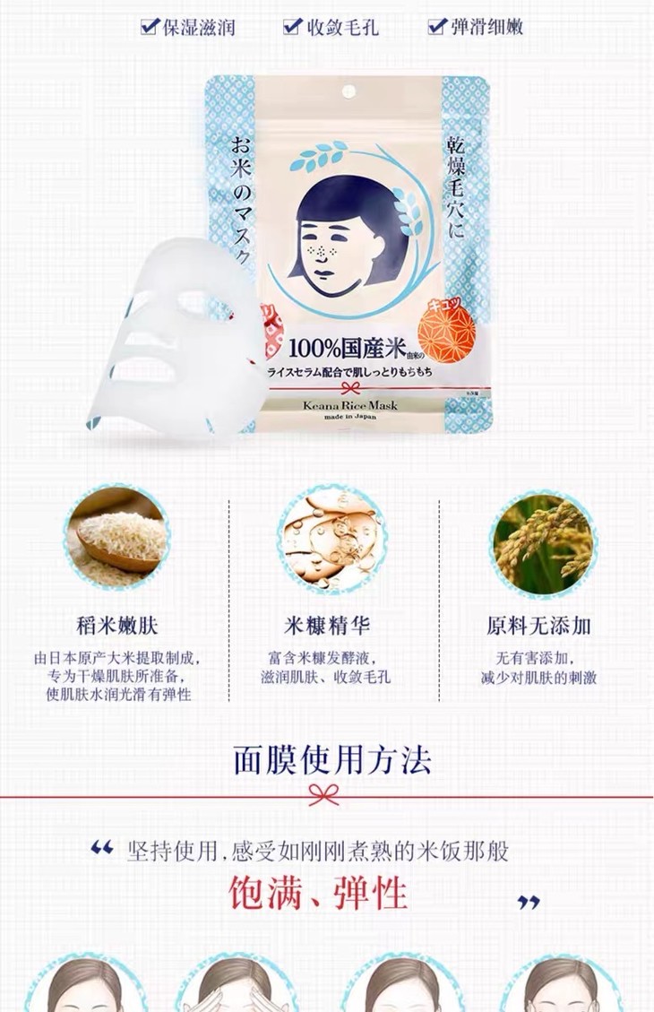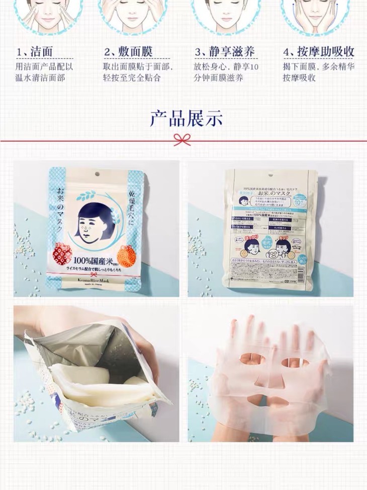3、功效:一包里面含有10枚,100%日本产大米制成,一包含165ml精华液,主打紧致毛孔,改善毛孔粗大,闭合性粉刺,黑头等问题。嫩肤,无添加,孕妇敏感肌都可以使用~