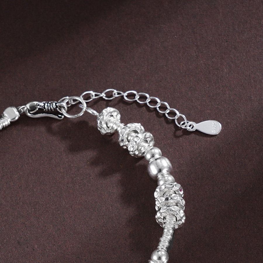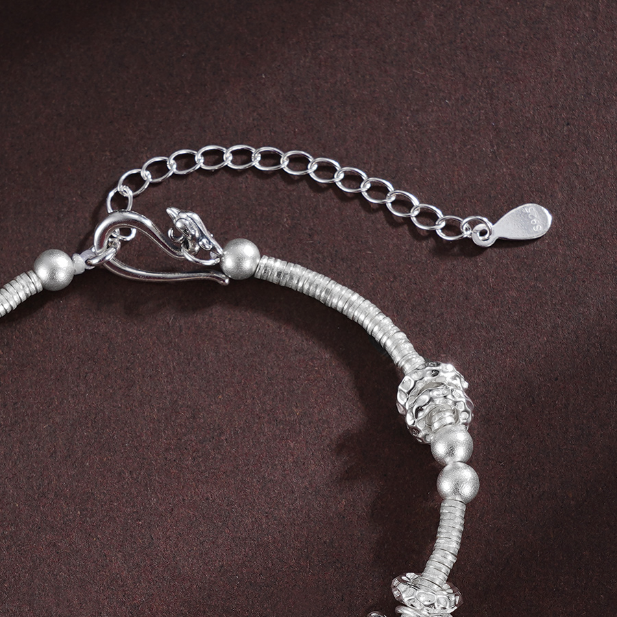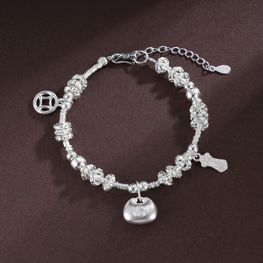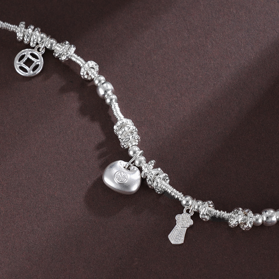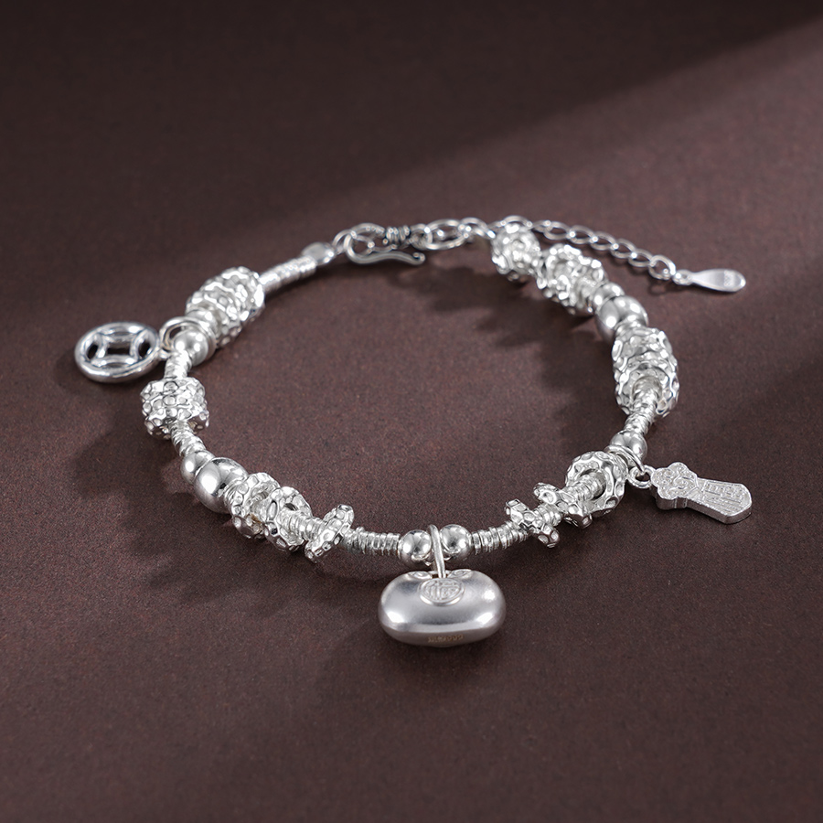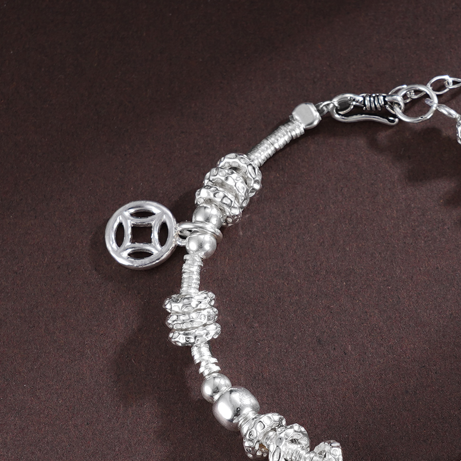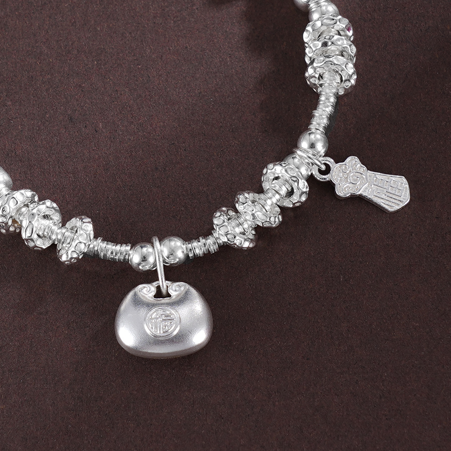 【寓意】:一款将清雅美学发挥到极致的手串。手串呈现锤纹纹理,加上铜钱与福袋的点缀,清雅之余更增添了招财纳福,如意吉祥的美好寓意。
