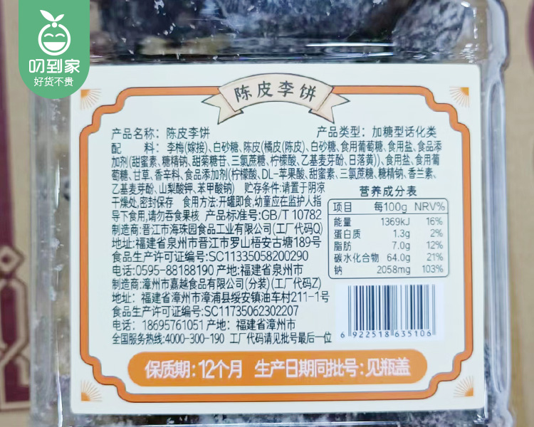 李解陈皮李饼(398g/罐)生产日期:11月