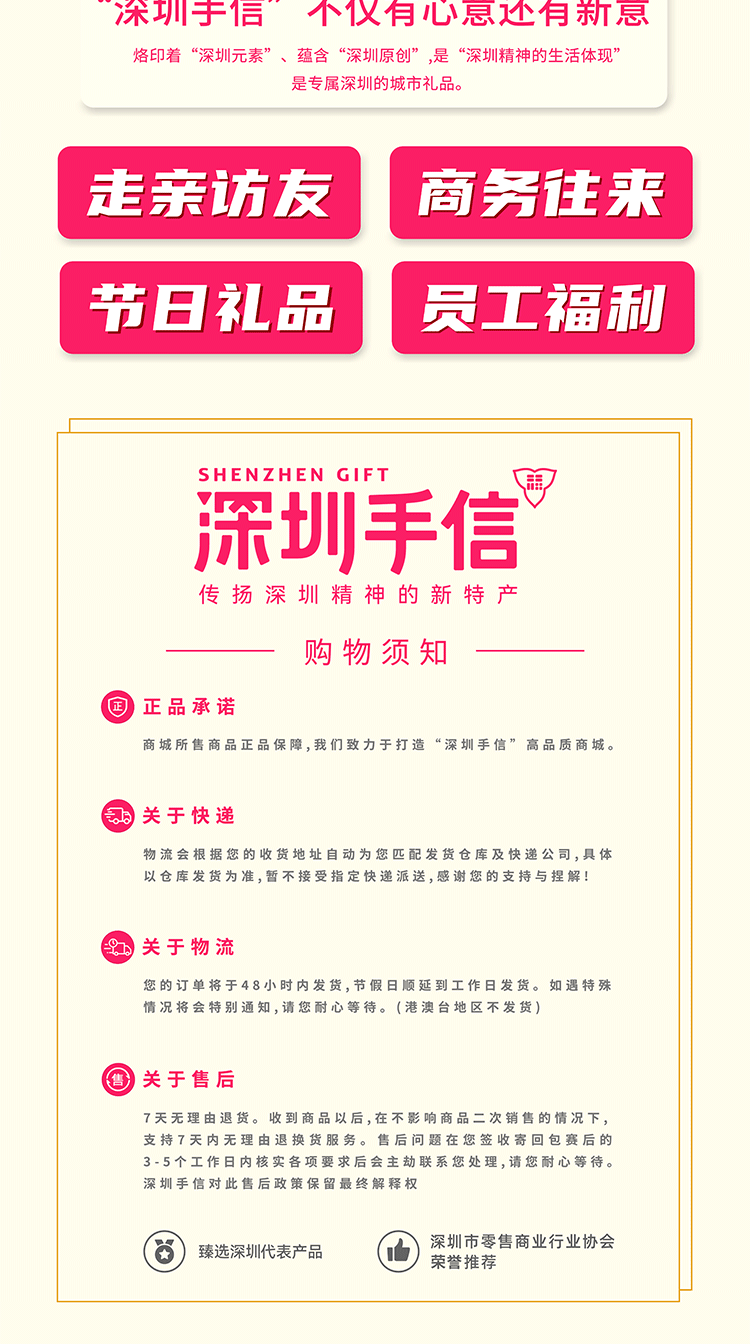 欢迎关注【深圳手信商城】 深圳手信是城市礼品的选购平台,臻选深圳八大优势产业代表产品,深圳市零售商业行业协会推荐。 闭着眼睛挑,每一份都是好礼,是商务往来、旅游出差、走亲访友、员工福利的好礼