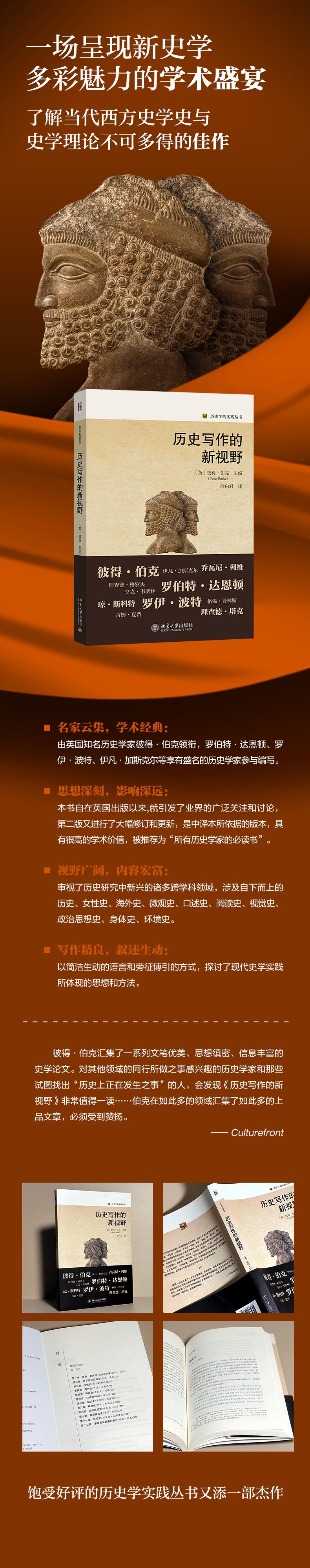 《历史写作的新视野》由英国有名历史学家、剑桥大学文化史荣休教授彼得·伯克主编,罗伯特·达恩顿、乔瓦尼·列维、罗伊·波特、琼·斯科特、吉姆·夏普等10位国际知名的历史学家参与编写,审视了历史研究中新兴的诸多跨学科领域,包括自下而上的历史、女性史、海外史、微观史、口述史、阅读史、视觉史、政治思想史、身体史、环境史等,探讨了这些当代史学实践所体现的思想和方法。全书视角宽广、内容宏富、专业严谨,对多姿多彩的新史学做出了颇为新颖而深刻的分析,是了解当代西方史学史与史学理论的佳作。