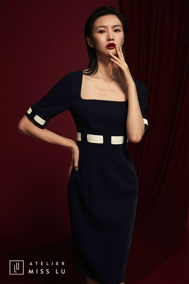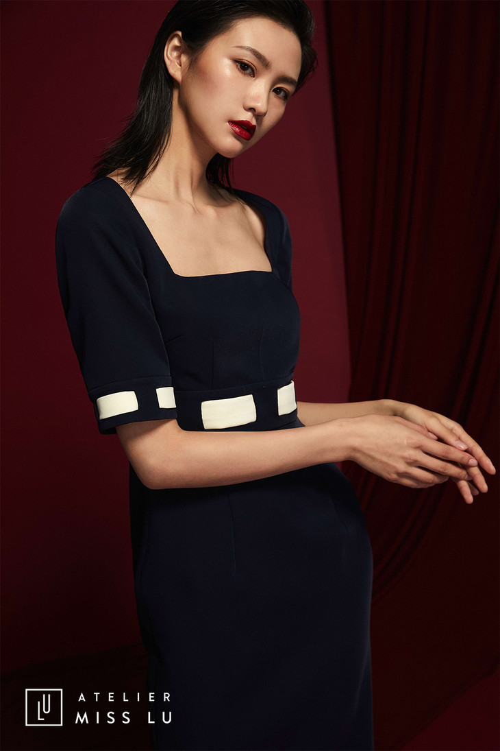 AtelierMissLu /Anastasia-藏青奶白系带方领修身裙/0000579