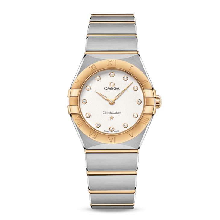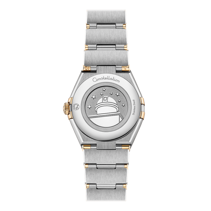 镜面材质 | 蓝宝石水晶玻璃 | 表盘 | 经典的半月形切面、“托爪”以及mono-rang表链。 黄色18K金与精钢打造,表圈镌刻罗马数字刻度,冰霜银表盘晶莹洁白,饰有钻石小时刻度,覆以耐磨损蓝宝石玻璃表镜。指针、欧米茄品牌标识、星座徽标以及钻石托槽亦以黄色18K金打造而成。 密底,表背印有星座天文台徽章。 |