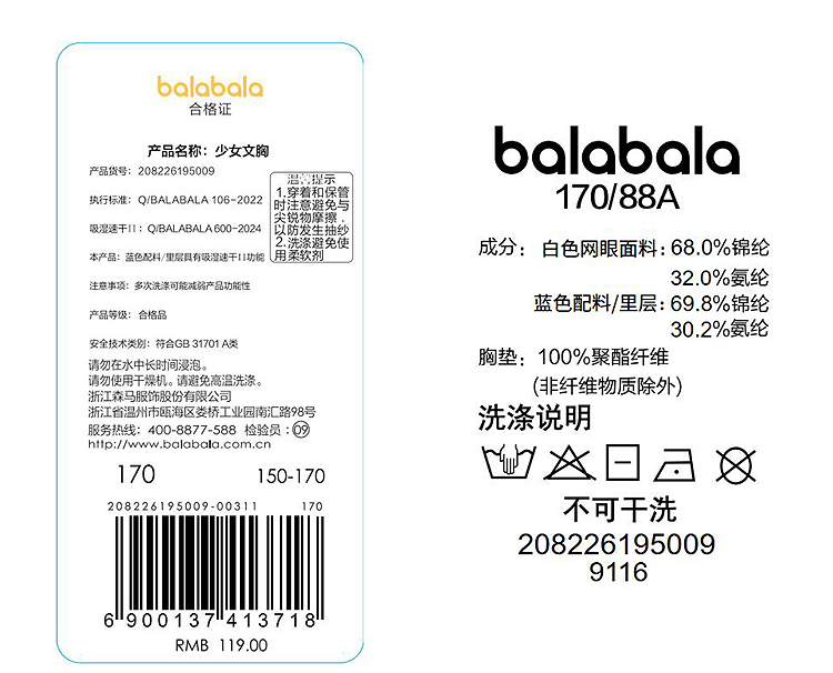 巴拉巴拉女童运动文胸防走光防凸点儿童内衣背心发育期胸衣速干