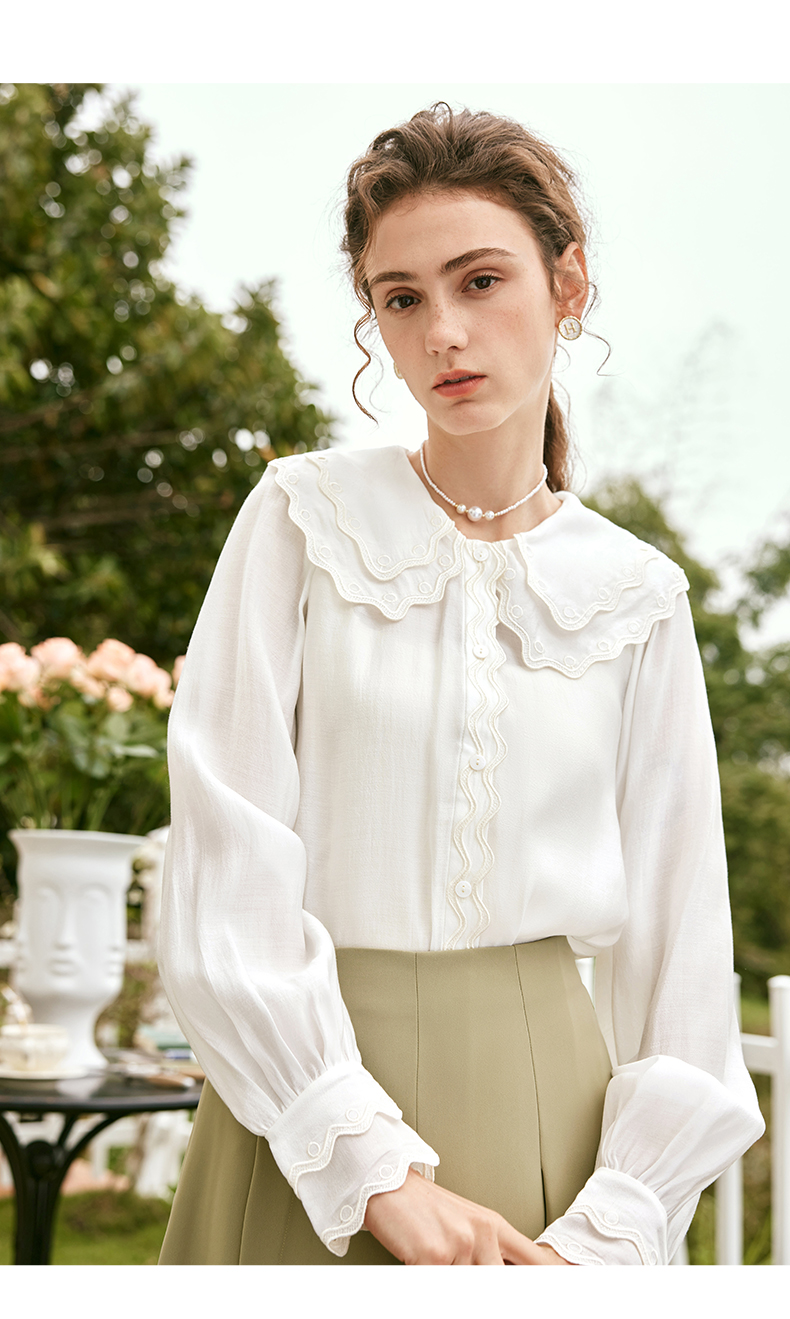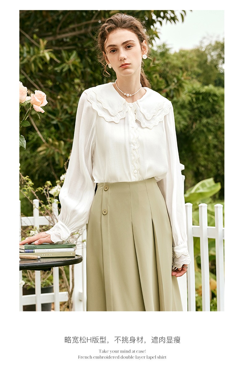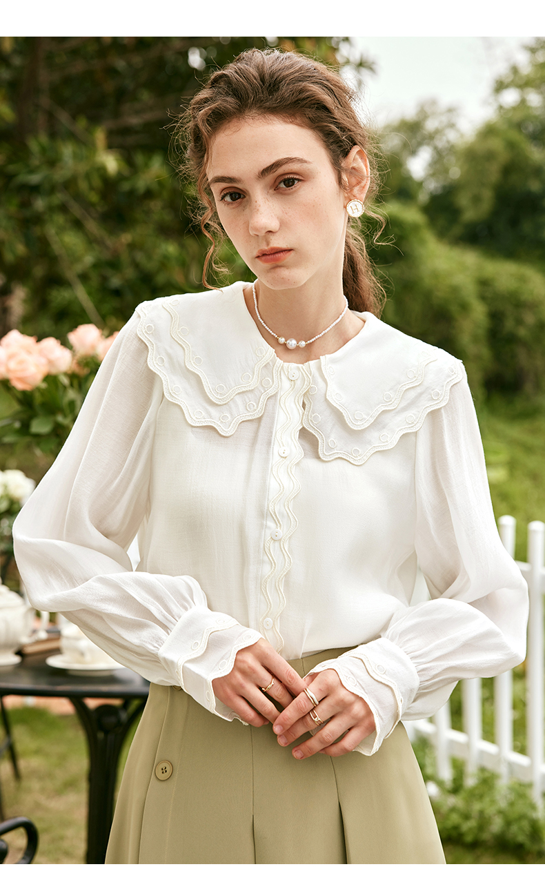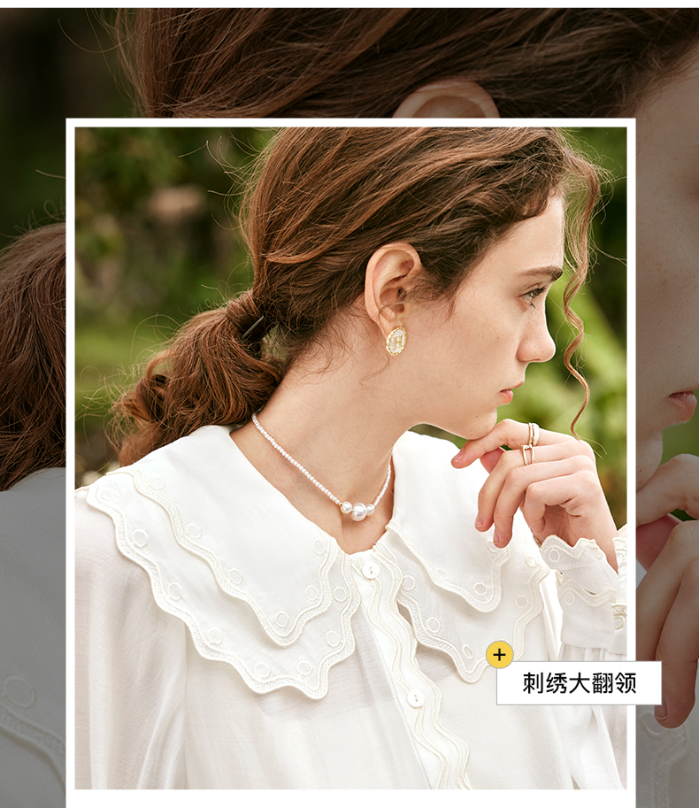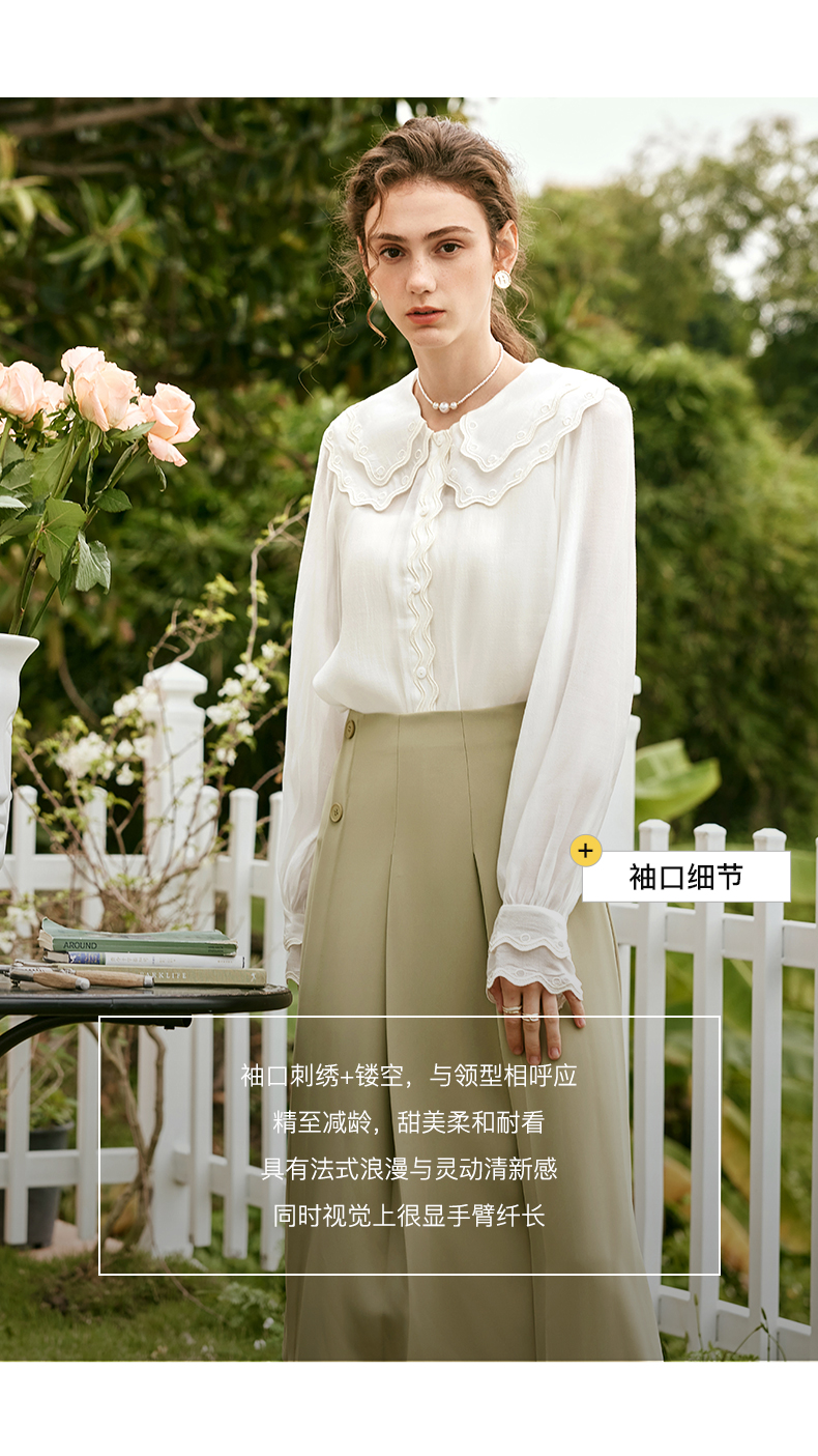 OLrain欧芮儿法式雪纺蕾丝衫女春季2023年新款刺绣翻领高级感上衣