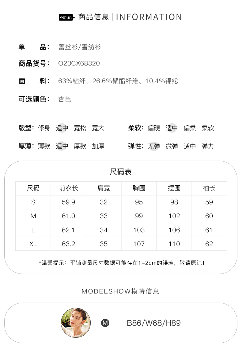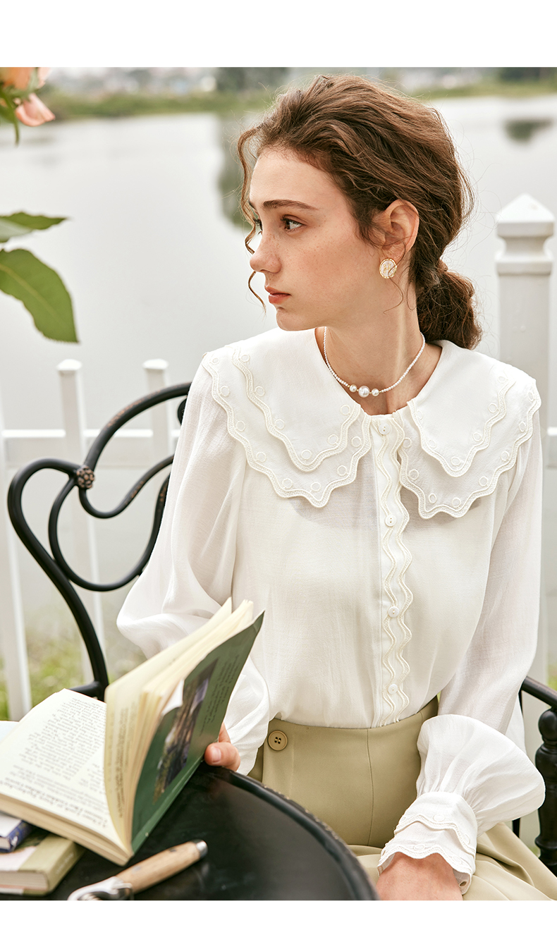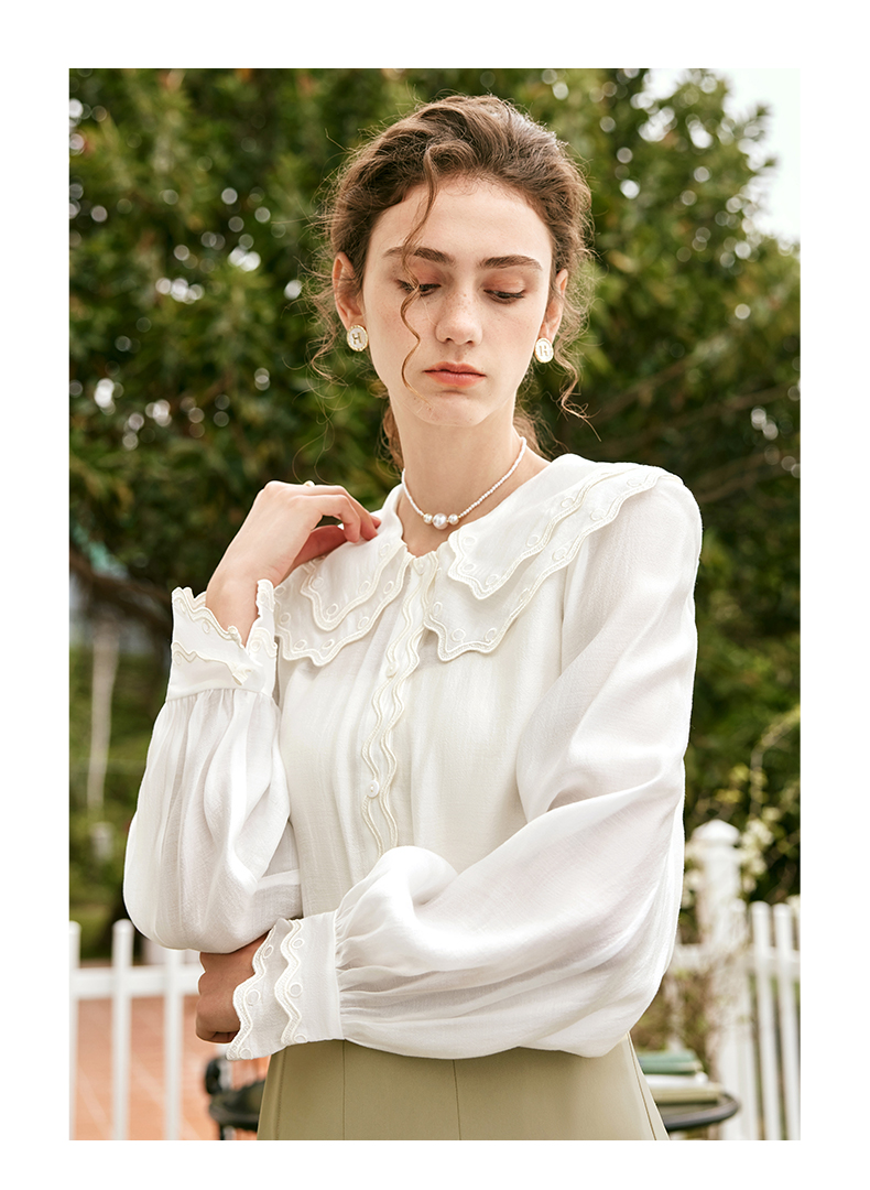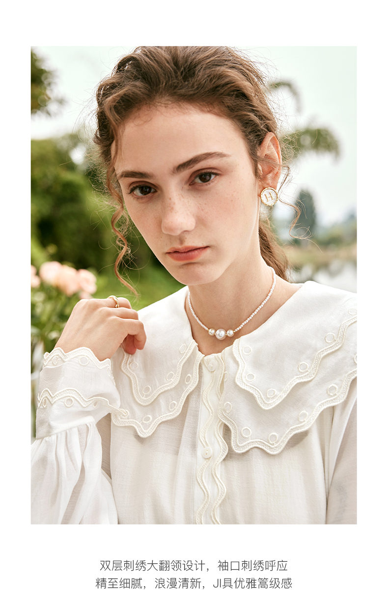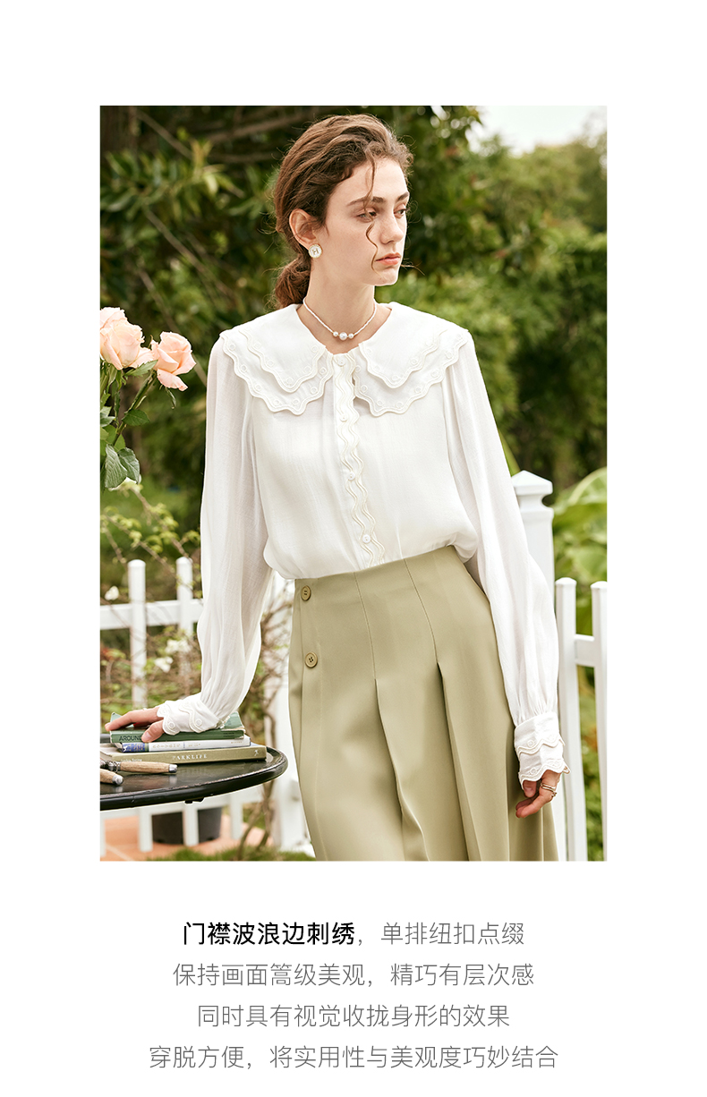 OLrain欧芮儿法式雪纺蕾丝衫女春季2023年新款刺绣翻领高级感上衣