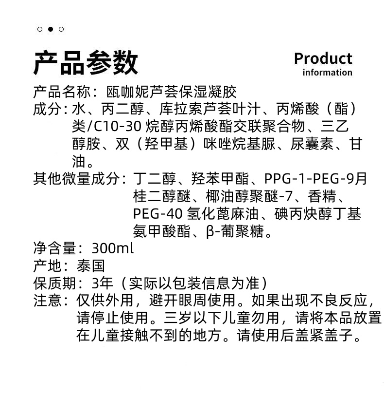 泰国进口瓯咖妮芦荟保湿凝胶300ml