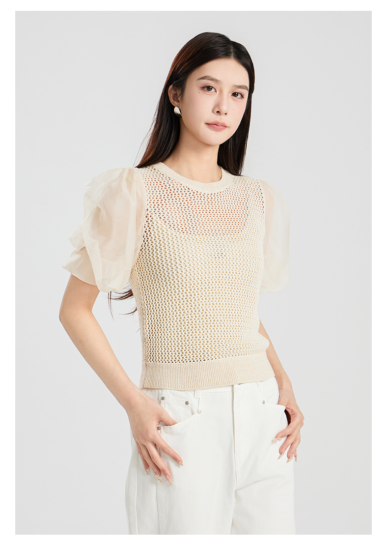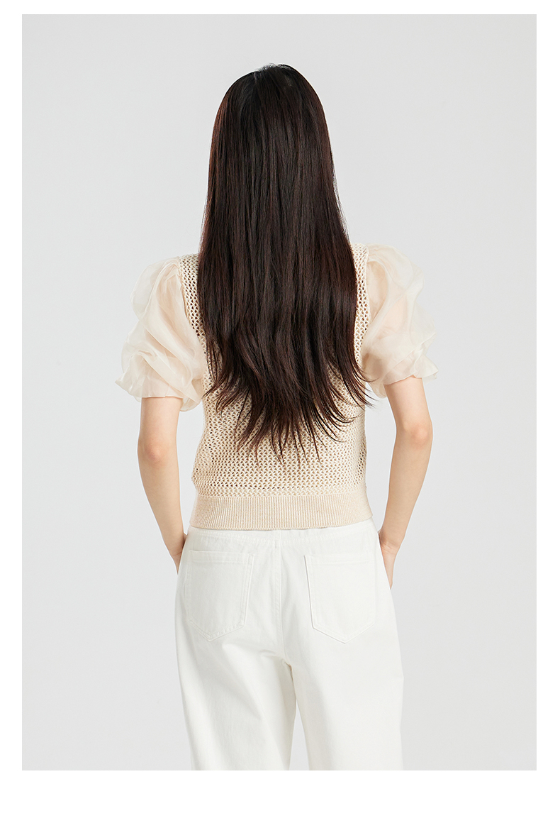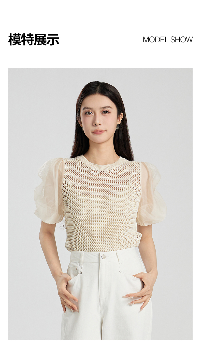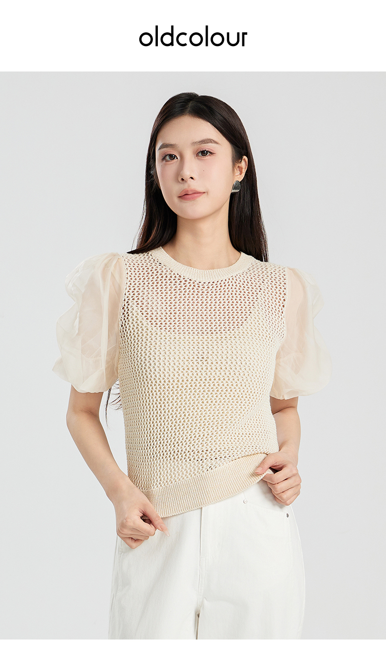 oldcolour夏季新款设计感泡泡袖镂空网状短款套头上衣女Q230507A1