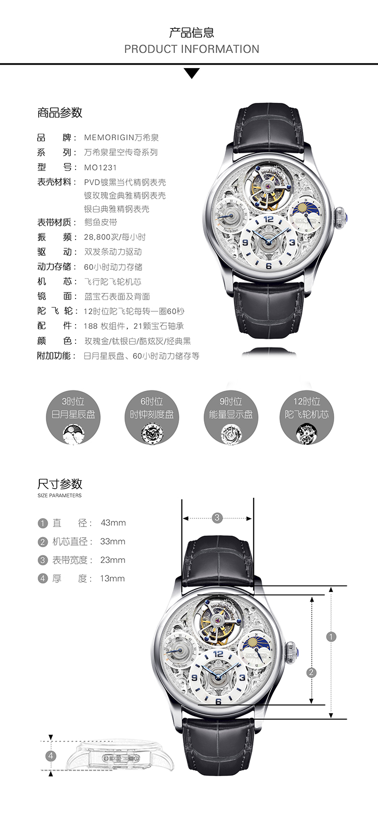 MEMORIGIN万希泉星空传奇系列男士陀飞轮腕表真皮镂空机械男手表