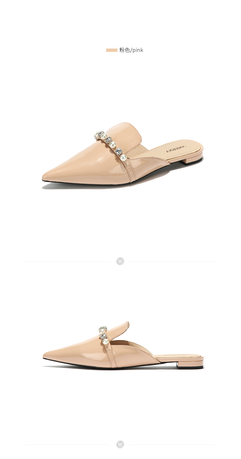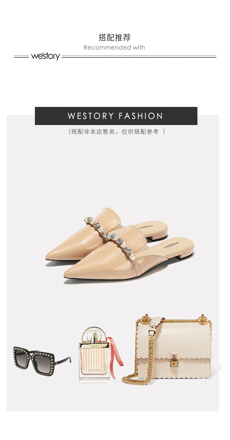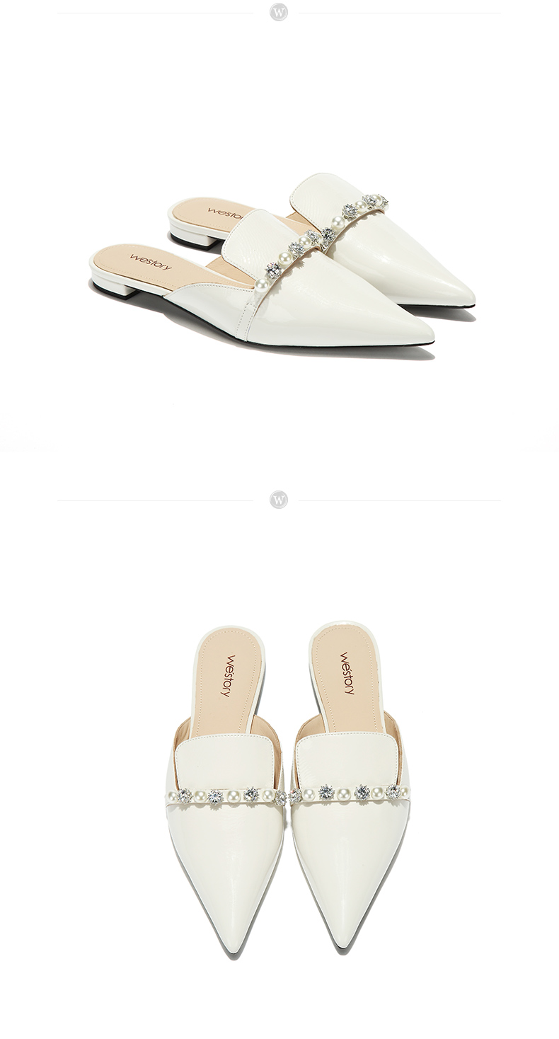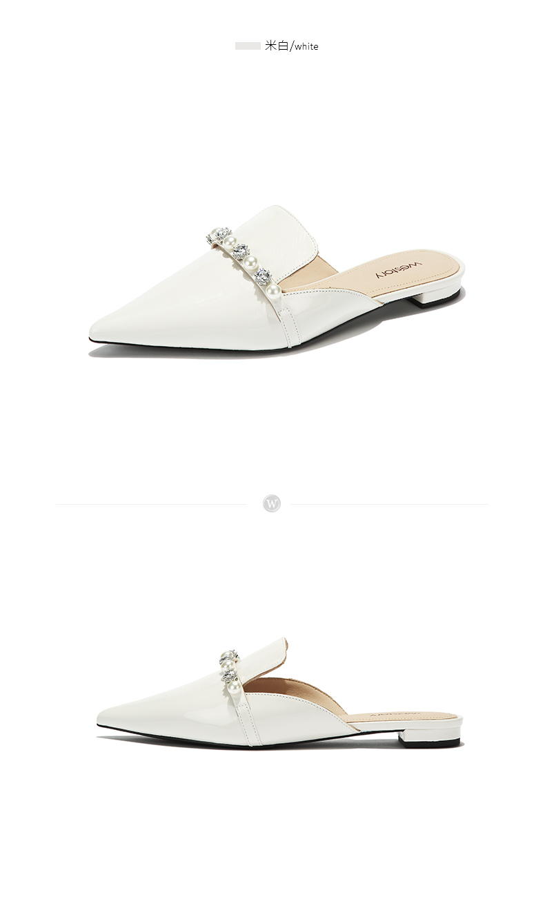 westory2018欧美尖头亮皮平跟包头方跟水钻珍珠女穆勒拖鞋W281J50841